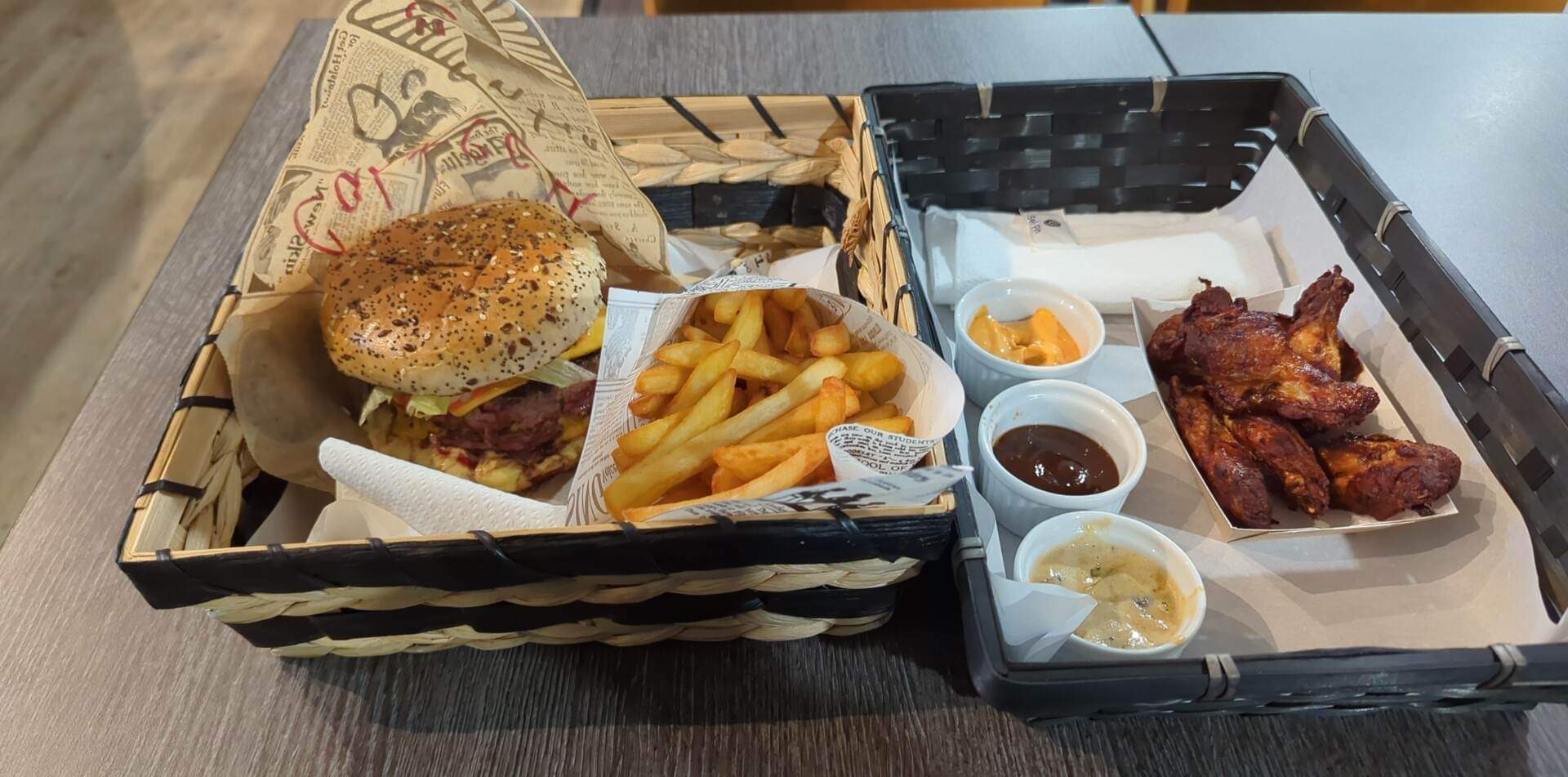 Super service; burgers, frites et surtout sauces maison de qualité. + le bonus pour la partie de mario kart en attendant d’être servis