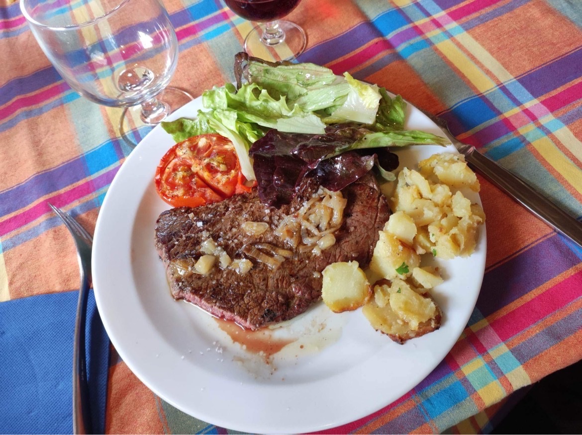 Le steak est delicieux et la charcuterie et la truffade sont aussi super. Le patron est tres sympa et le paysage magnifique!