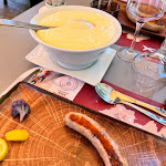 C'est une mauvaise surprise malheureusement. L'attente et le temps de repas très très long, arrivé a 12h30 reparti a 16h... Plus d'une heure entre l'entrée et le plat. Les tables sont collé les une aux autres, on a pas de distance entre les autres tables. Pas super en tant de covid. Les menus sont a mon sens cher pour ce qu'il y a. Salade, saucisses, dessert pour 28€ c'est très cher. Le principe du plat a partager pour un restaurant de ce style me déplaît, ça fait bonne franquette et non plus belle table. Et enfin comme dit par d'autre le masque des serveurs me gène également, il ne prend pas la totalité de la bouche et du nez, en cas de maladie tout les mondes est contaminé. Je ne sais pas si ils prennent trop de monde où si en cuisine ça ne suit pas mais apparemment l'attente semble fréquente. 3h30 pour un repas c'est pas gérable.