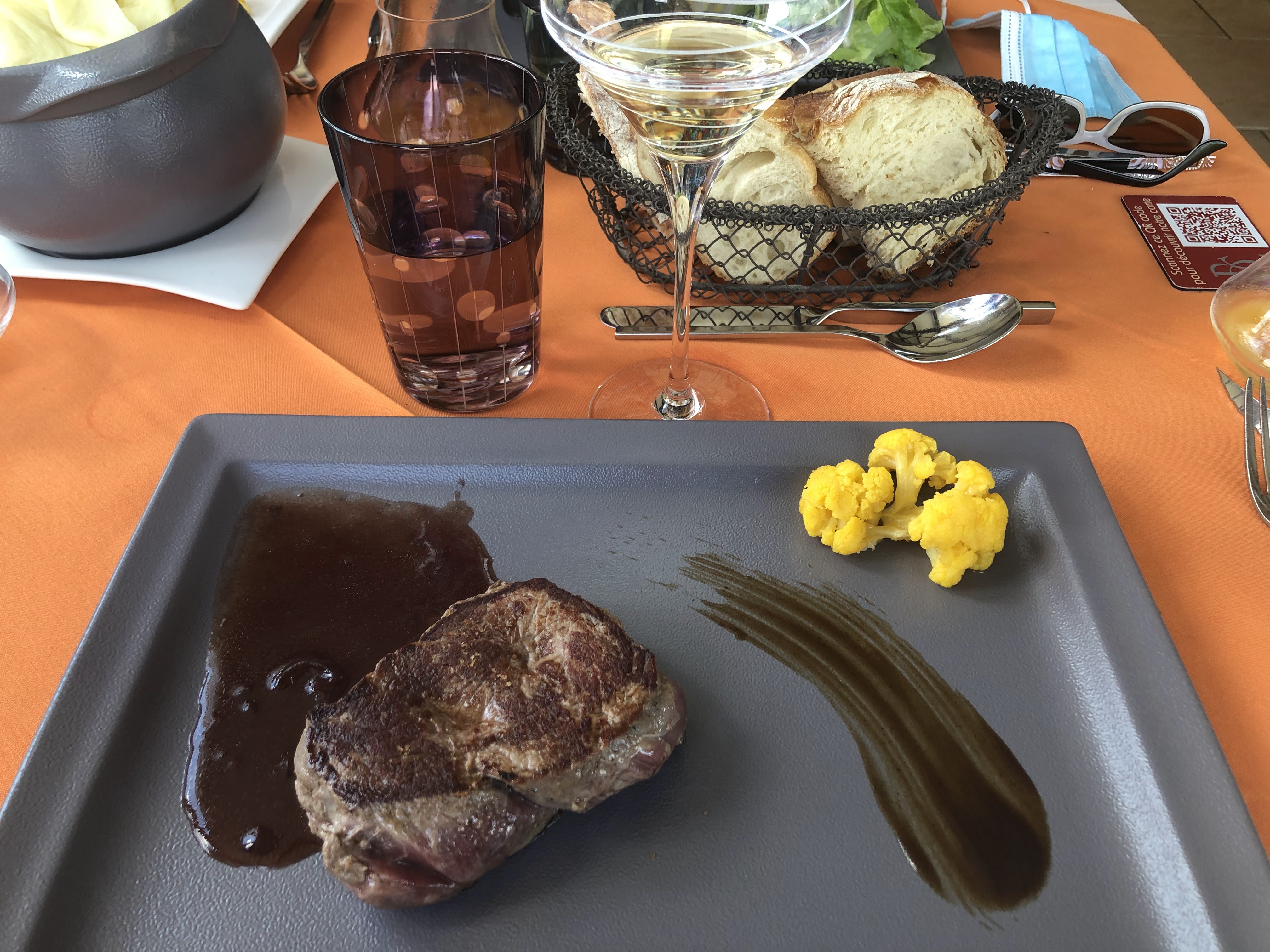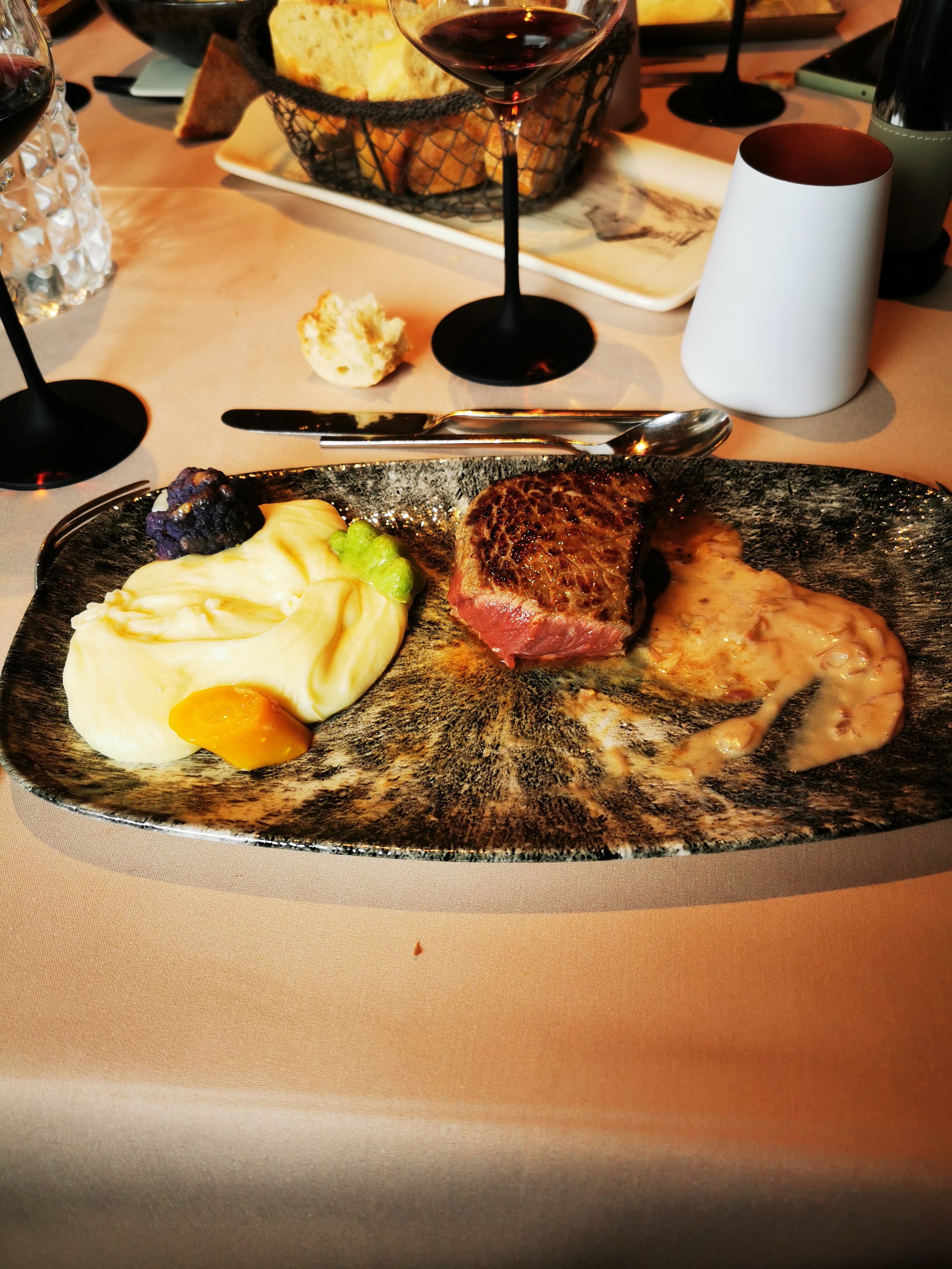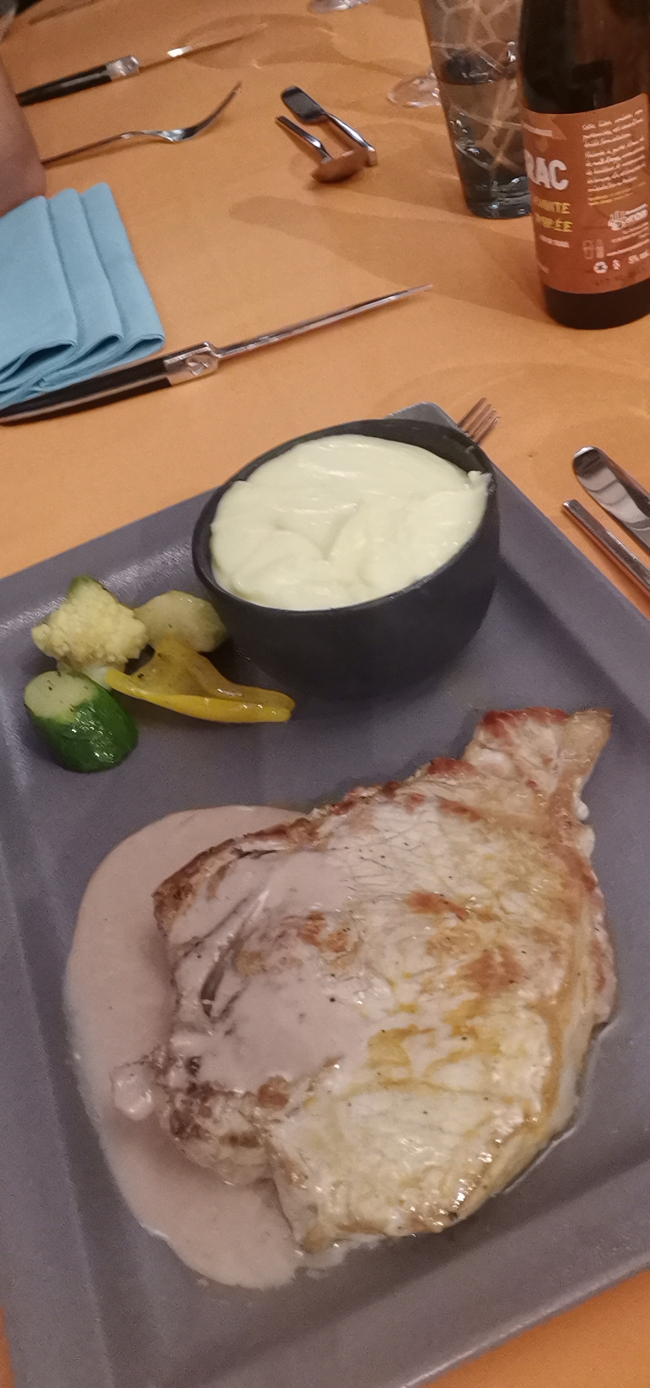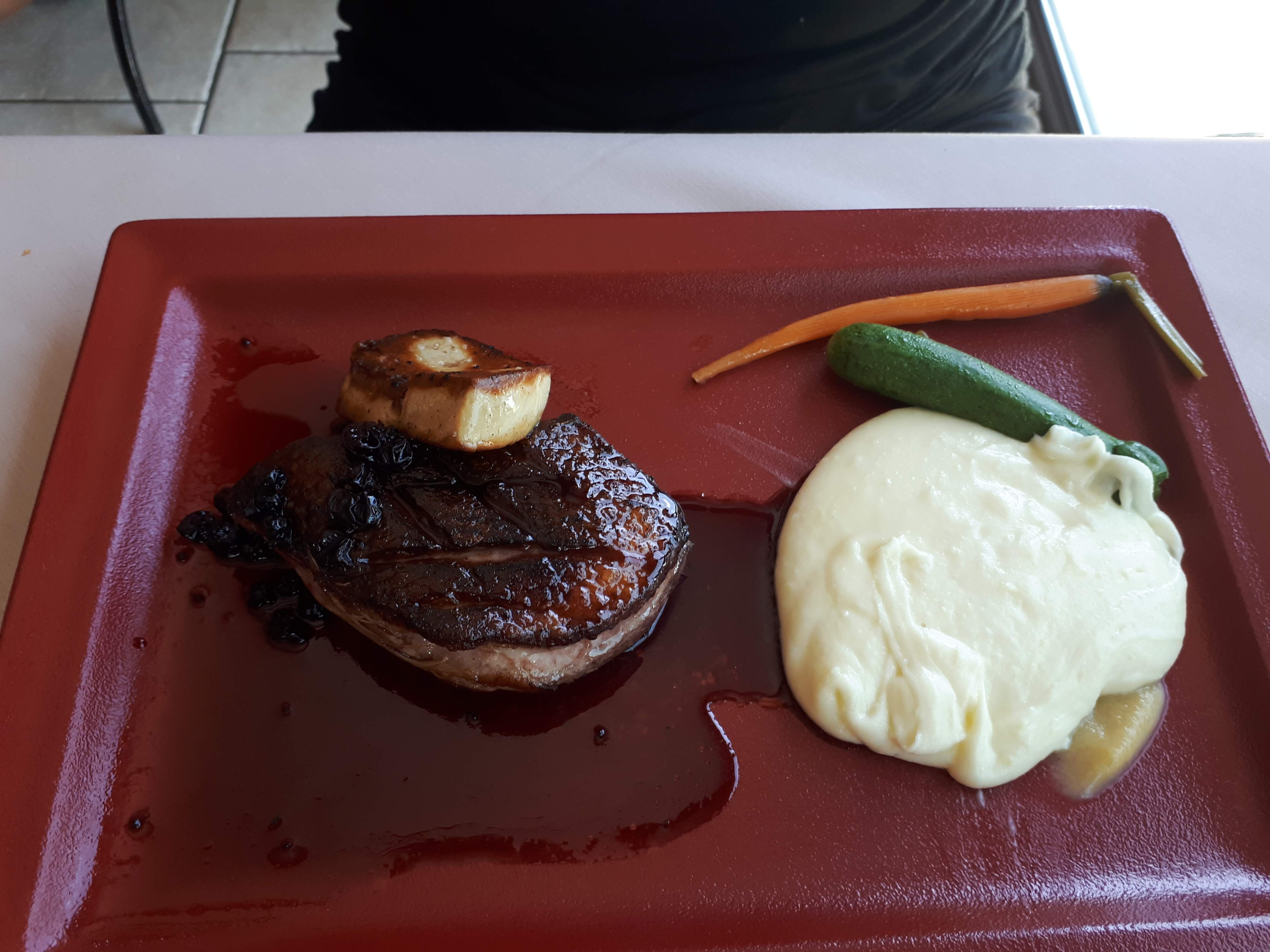Bonjour , ns avons pris menu à 44 euros gâteaux apéritifs feuilleté de ris de veau et après filet de bœuf très fondants comme dans du beurre et la femme tbone de veau excellent jute la cuisson à redire , accompagnée d un aligot extraordinaire fait par le patron à l entrée on peut même assisté au filage de l aligot vraiment pittoresques comme le mieux le seul petit bémol est le prix un peu cher je pense qu à ce prix en apéro ns aurions pu avoir petite verînes et petits feuilletés. Nous avons l habitude de faire des resto étoile ou pas et je pense que le juste prix de ce menu aurait été 35/38€ pas plus . Si nous sommes dans les parrages nous y retournerons mais nous prendrons le plus petit menus car l aligot ......