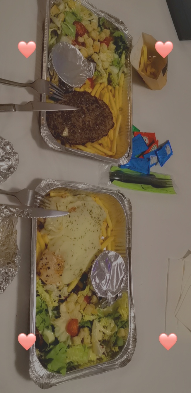 Commande deliveroo pour la première fois, Il y a eu une mésentente au niveau de mon adresse mais la comme est arrivé à bon port sans trop d'attente et encore assez chaud ! Et puis la salade fraîche tomate,chèvre 🤪 Et cerise sur le gâteau, ils m'ont offert le dessert
