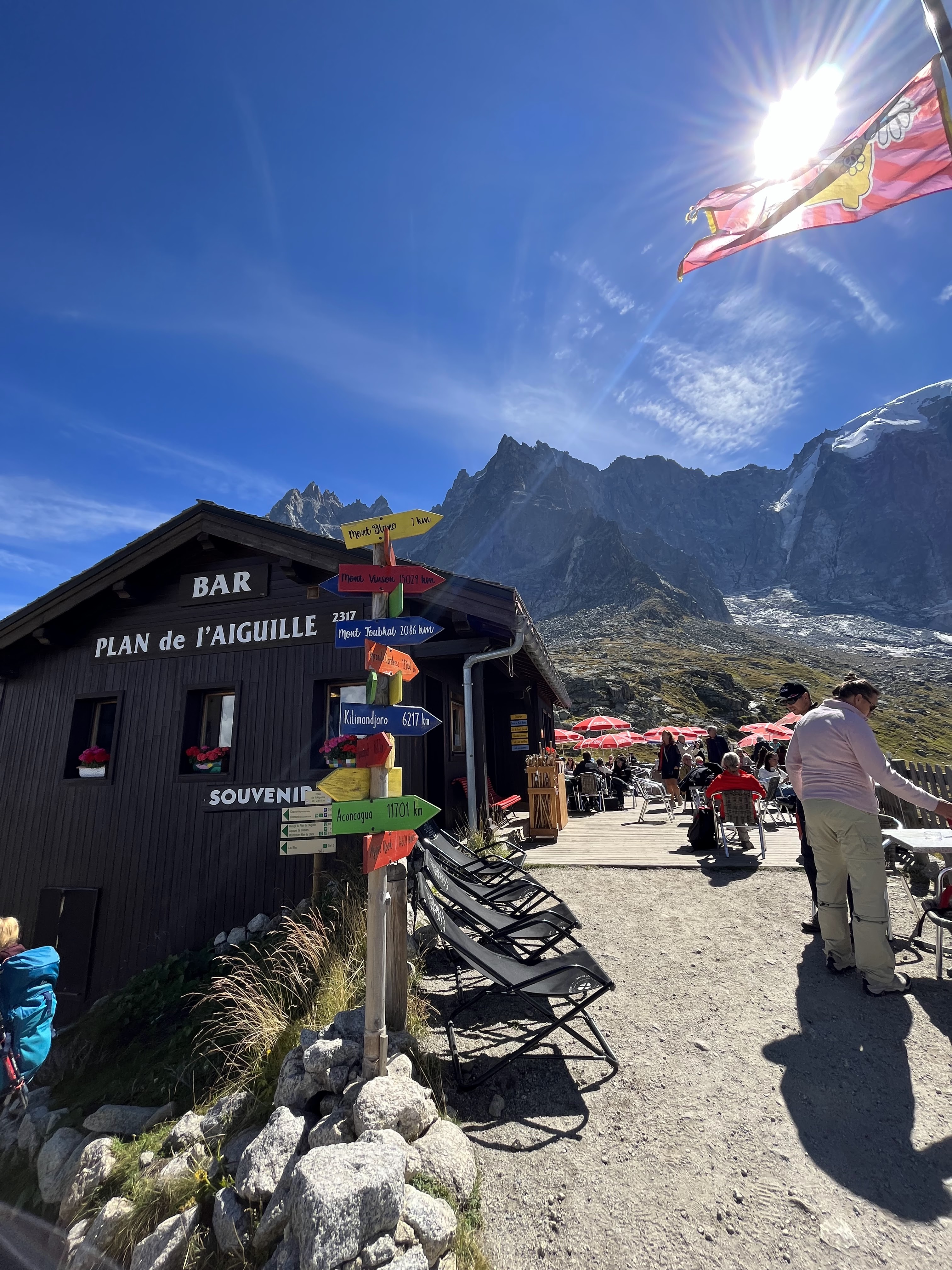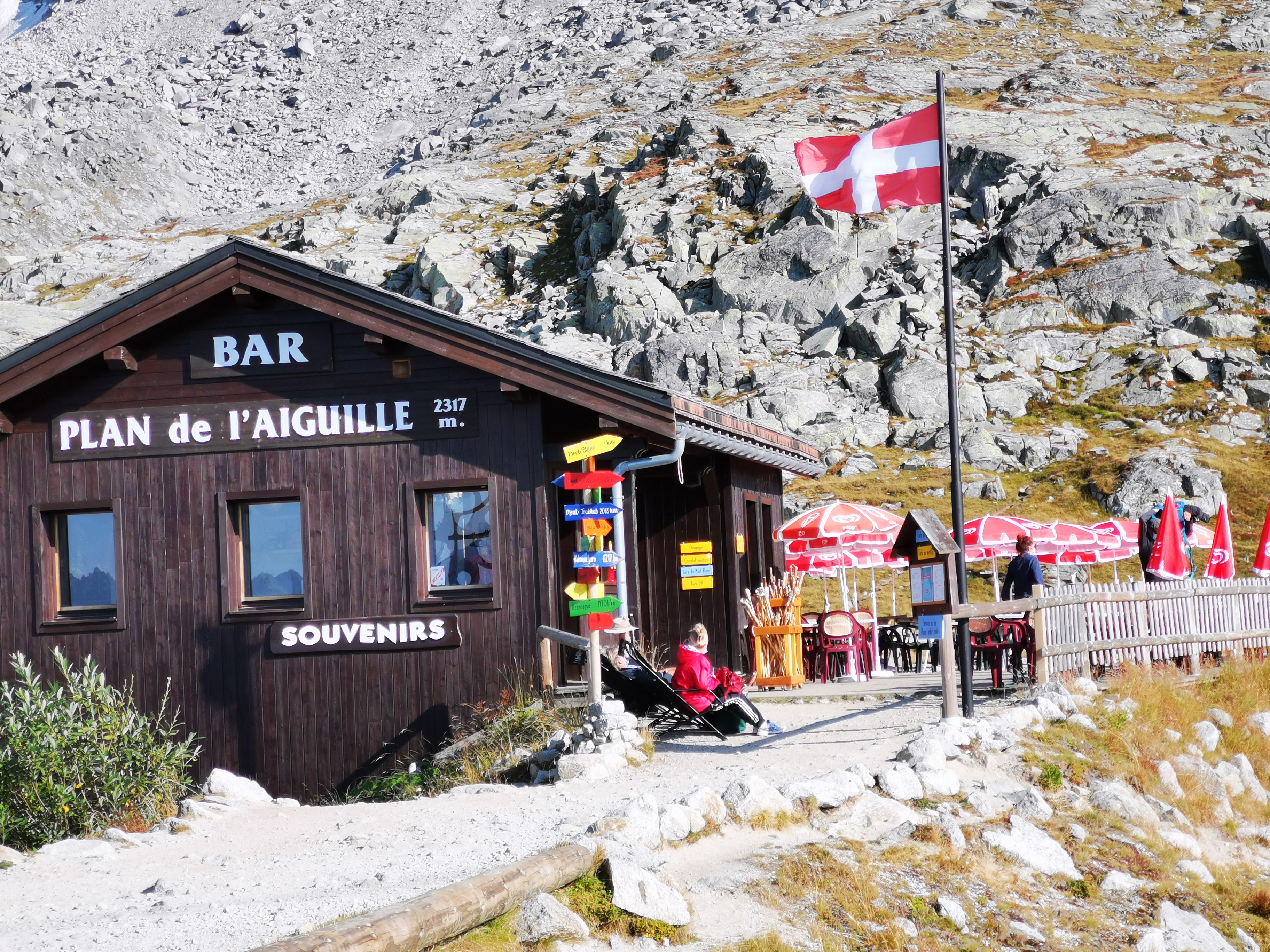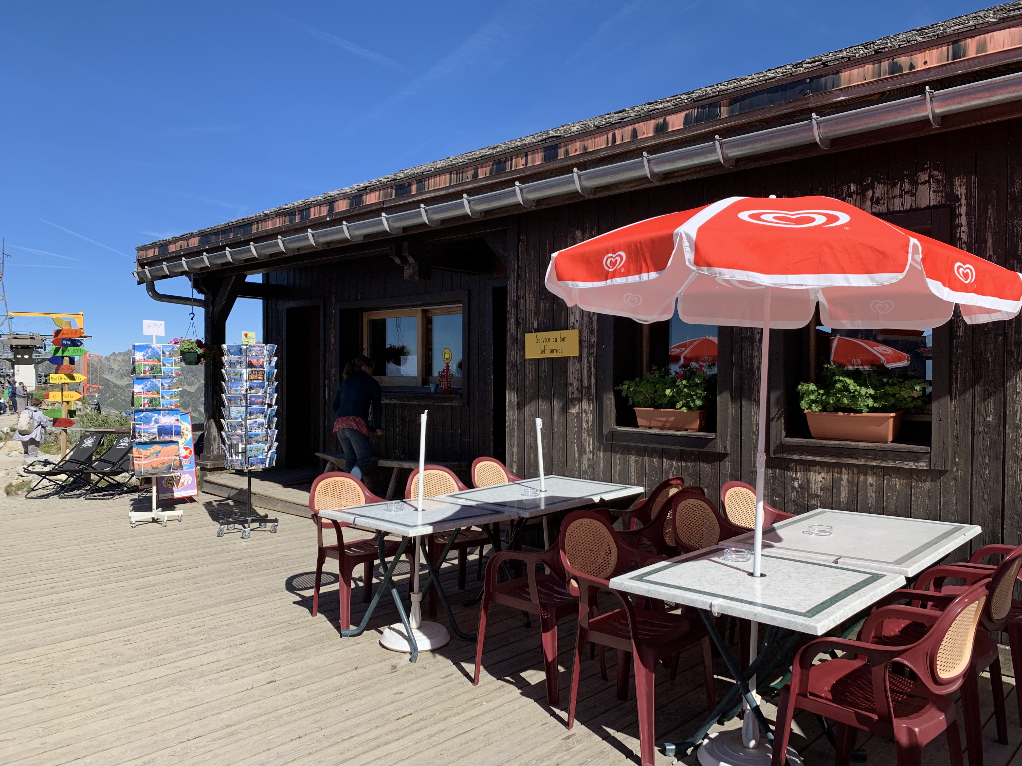 A 2317 mètres, une pause rafraîchissante pour admirer une dernière fois l'Aiguille de Midi, le téléphérique qui y va et les sommets enneigés. Boire une bière de la brasserie du Mont Blanc n'est pas bon marché ici, mais c'est le meilleur endroit pour la boire.