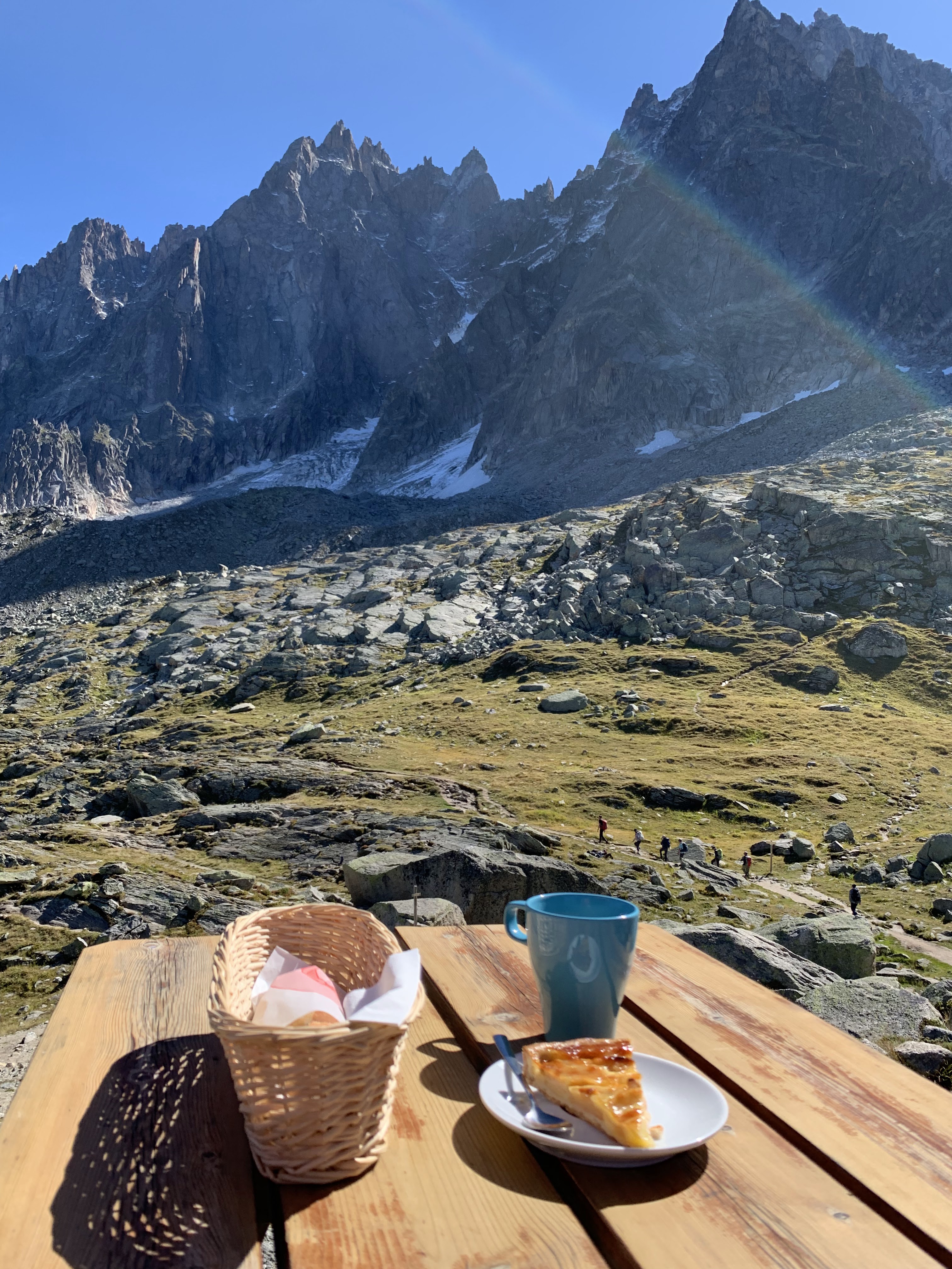 Petite halte avant de descendre sur Chamonix, face au mont-blanc, sandwich très bon boisson et dessert tartelettes