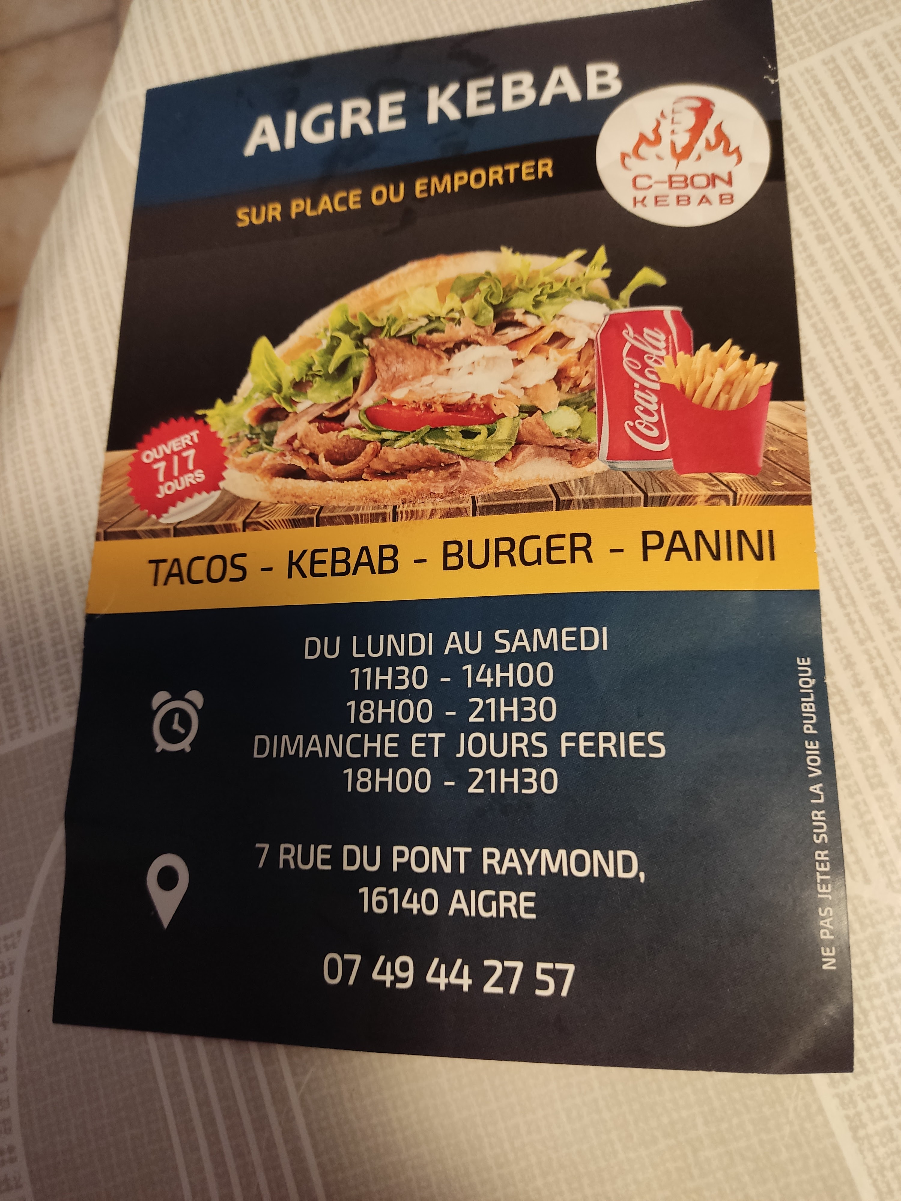 Voici toutes les informations sur le Restaurant C-BON KEBAB AIGRE qui ce trouve au 7 Rue du Pont Raymond, 16140 Aigre (16). Sur cette fiche vous trouverez les photos, l'adresse, les horaires d'ouverture, le numero de téléphone et les avis clients.Vous pouvez églement rédiger un avis si vous le souhaitez en bas de page.