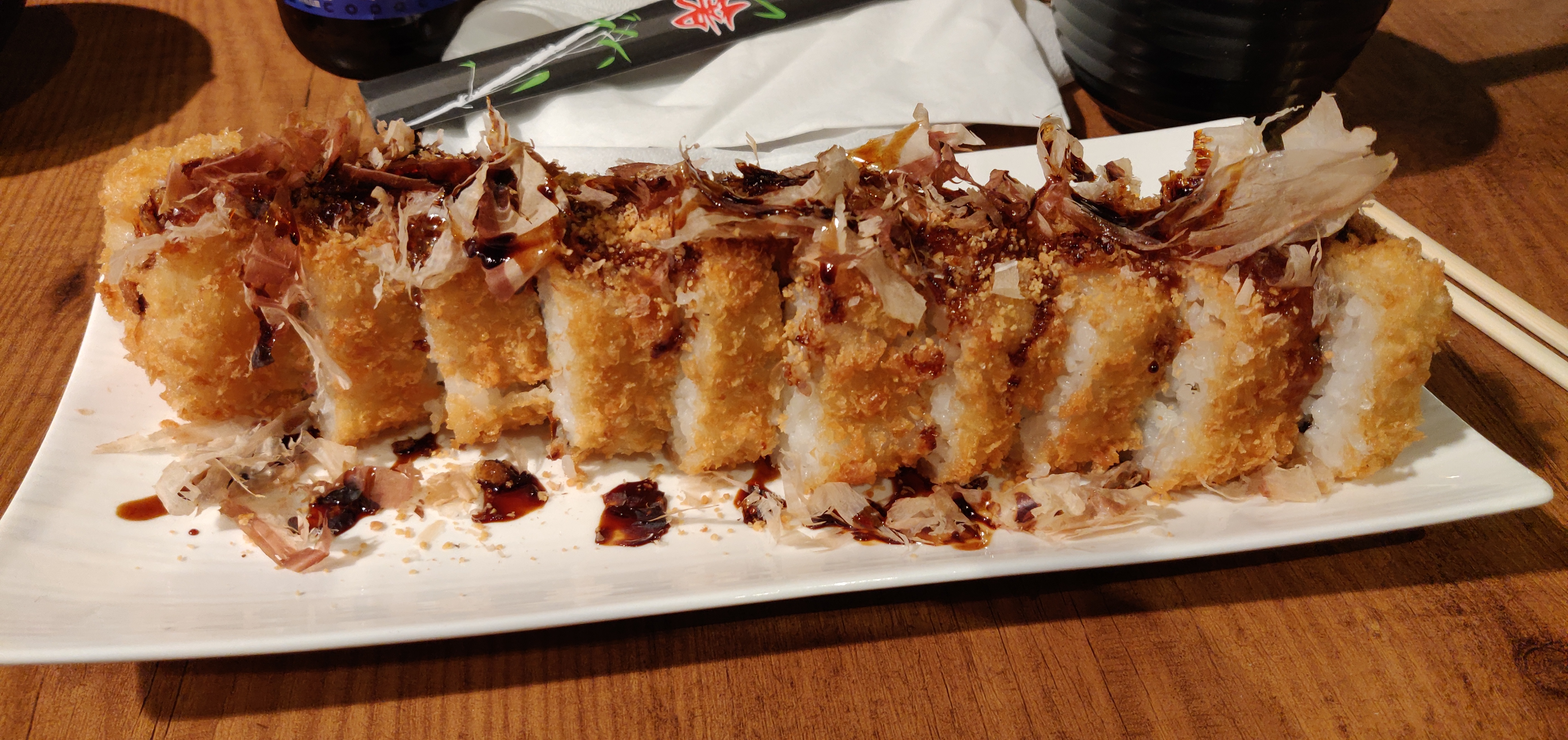 Des sushis frient ? J'ai adoré. Je conseille d'ajouter 1€ dans certaines formules pour remplacer le surimi par du saumon ! Le restaurant est un peu petit et du coups bruyant lorsque le resto est plein mais le service est impeccable.