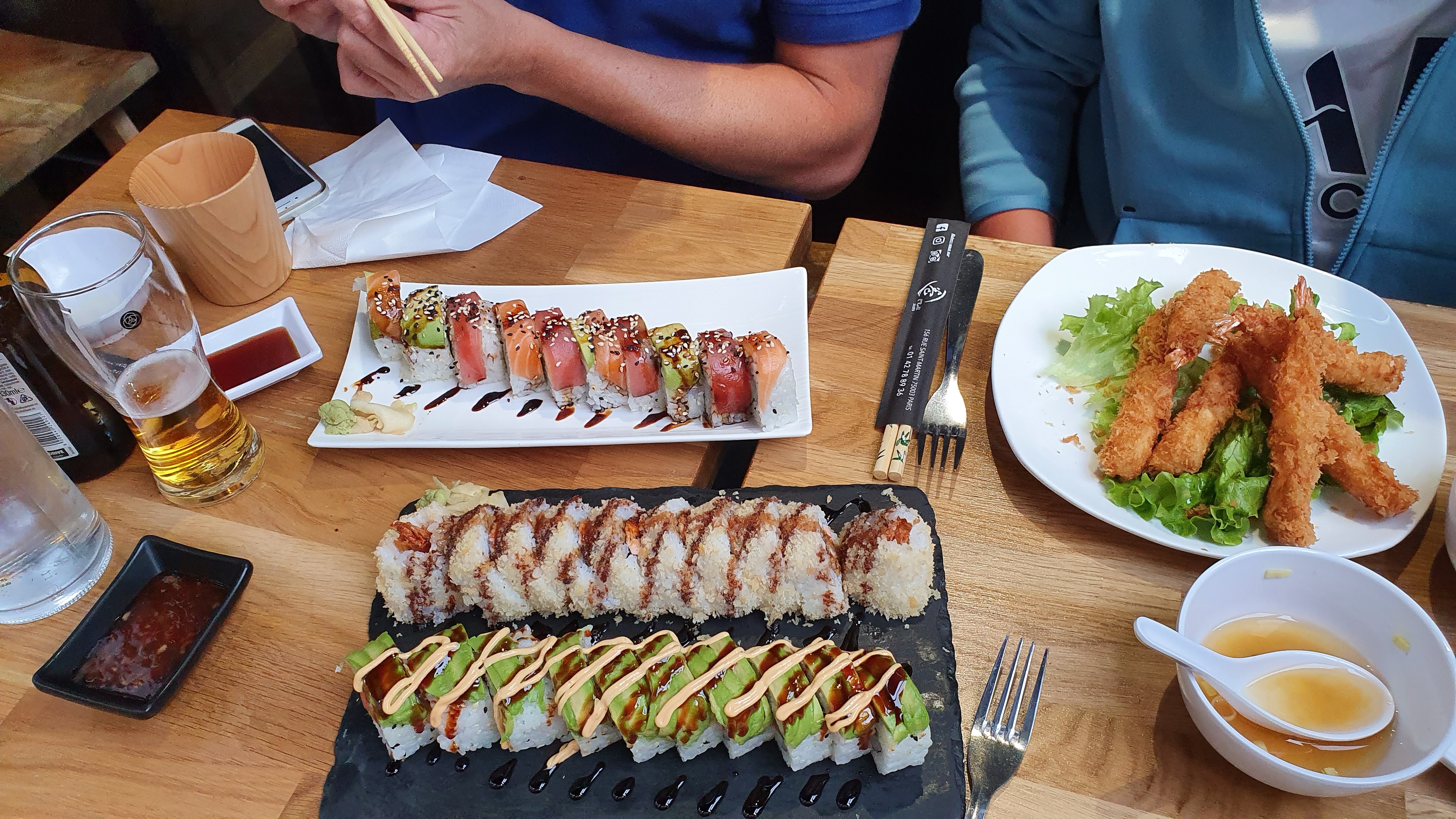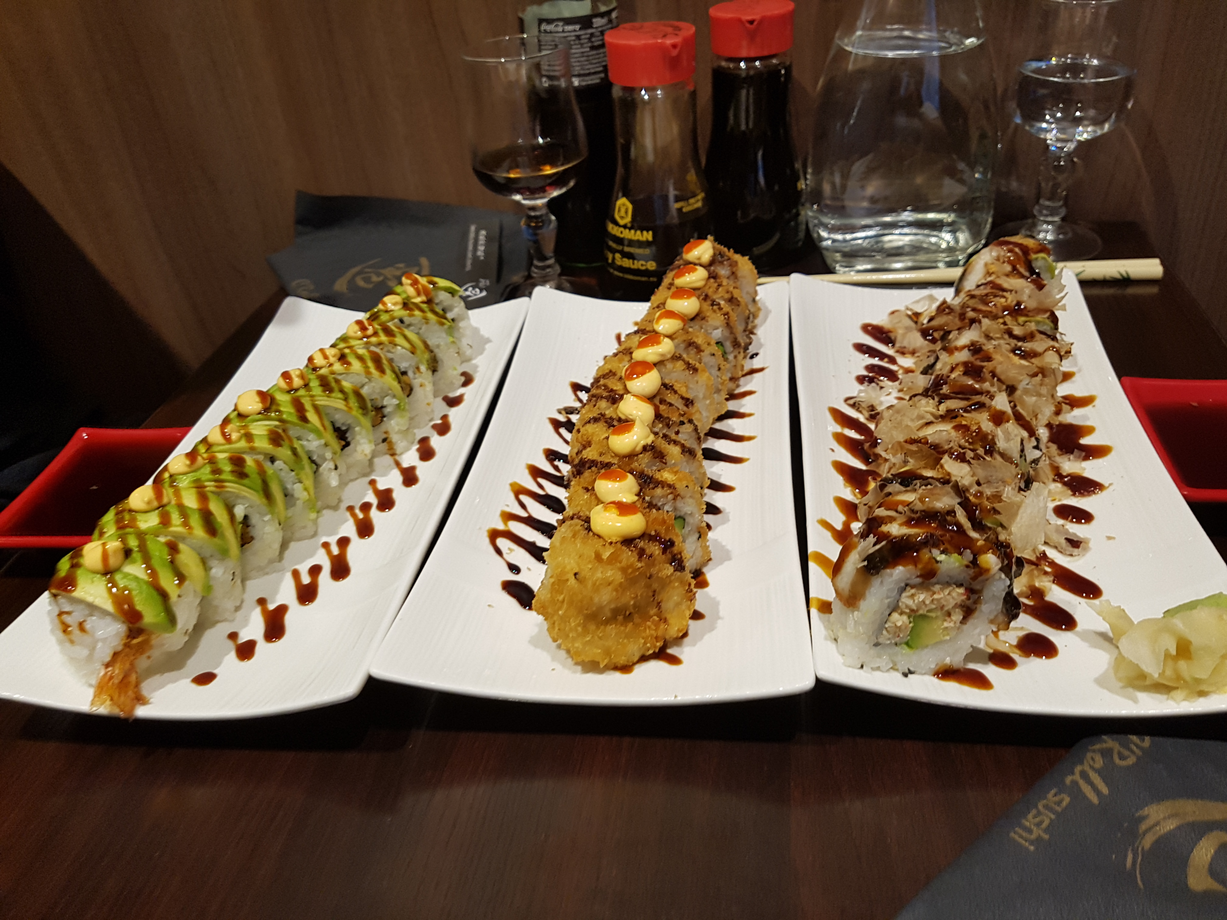 Rolls a l'américaine avec beaucoup de sauce sur les maki (mayo etc..). Par contre plus de riz que de garnitures, pour des rolls entre 14€ et 19€ c'est franchement abusé mais tres bourratif. Ils vendent aussi de l'eau pétillante maison, en gros de l'eau du robinet style sodastream qu'ils font payer 5€ les 75cl. Un conseil prenez une carafe d'eau au moins c'est gratuit (et c'est dans la même bouteille que l'eau payante) Sinon la bière japonaise est très bonne.