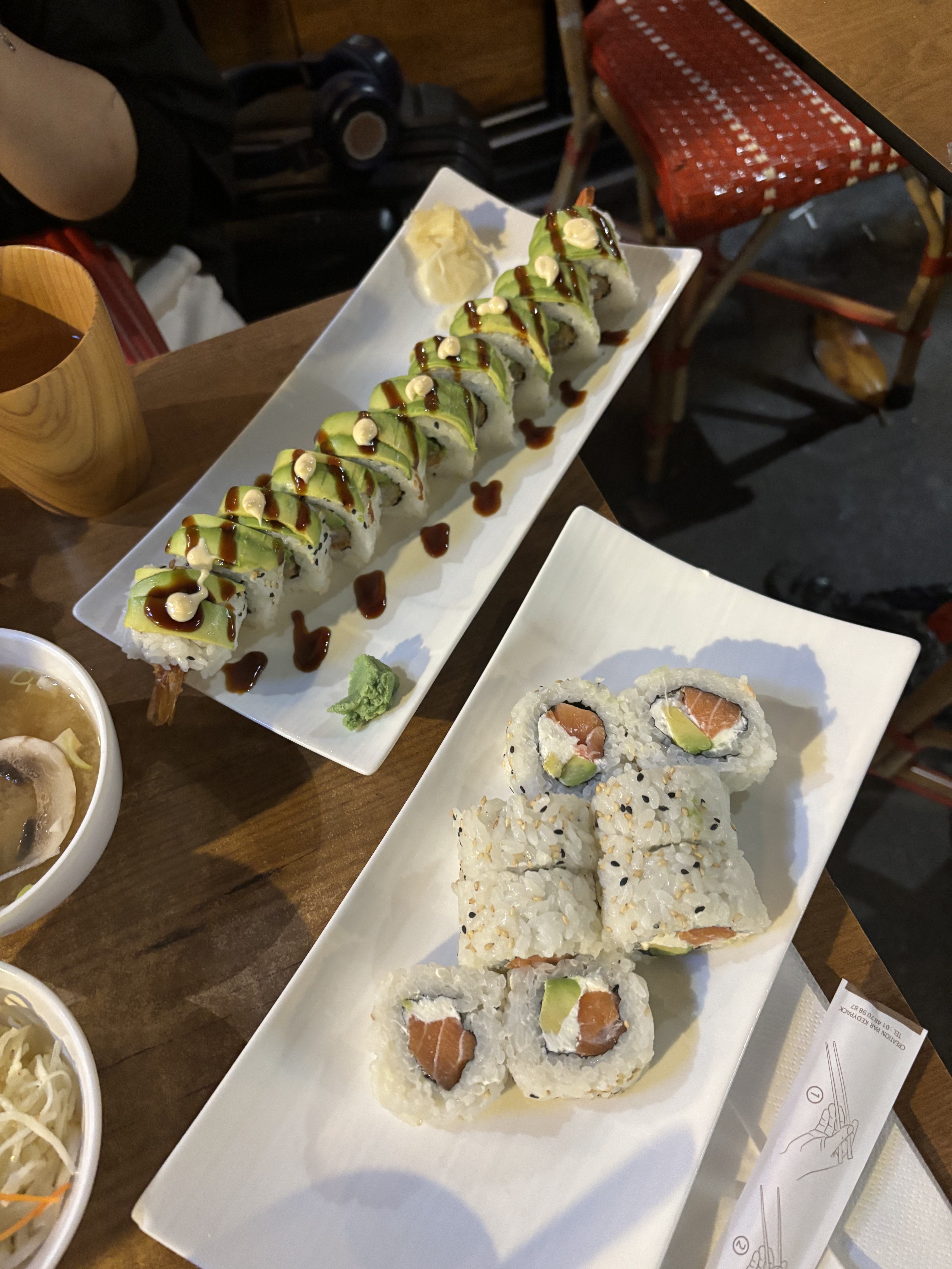 Accueil discret des serveurs Respecte a chaque fois ma demande de remplacer le beignet par saumon sans mayonnaise! Les sushis sont enormes, le seul inconvenient c est pour les manger en une seule fois avec les baguettes pas evident. Petit clin d oiel menu Mr 6 et dragon roll. Il faut compter environ 45euro pour deux plats et 1 soft