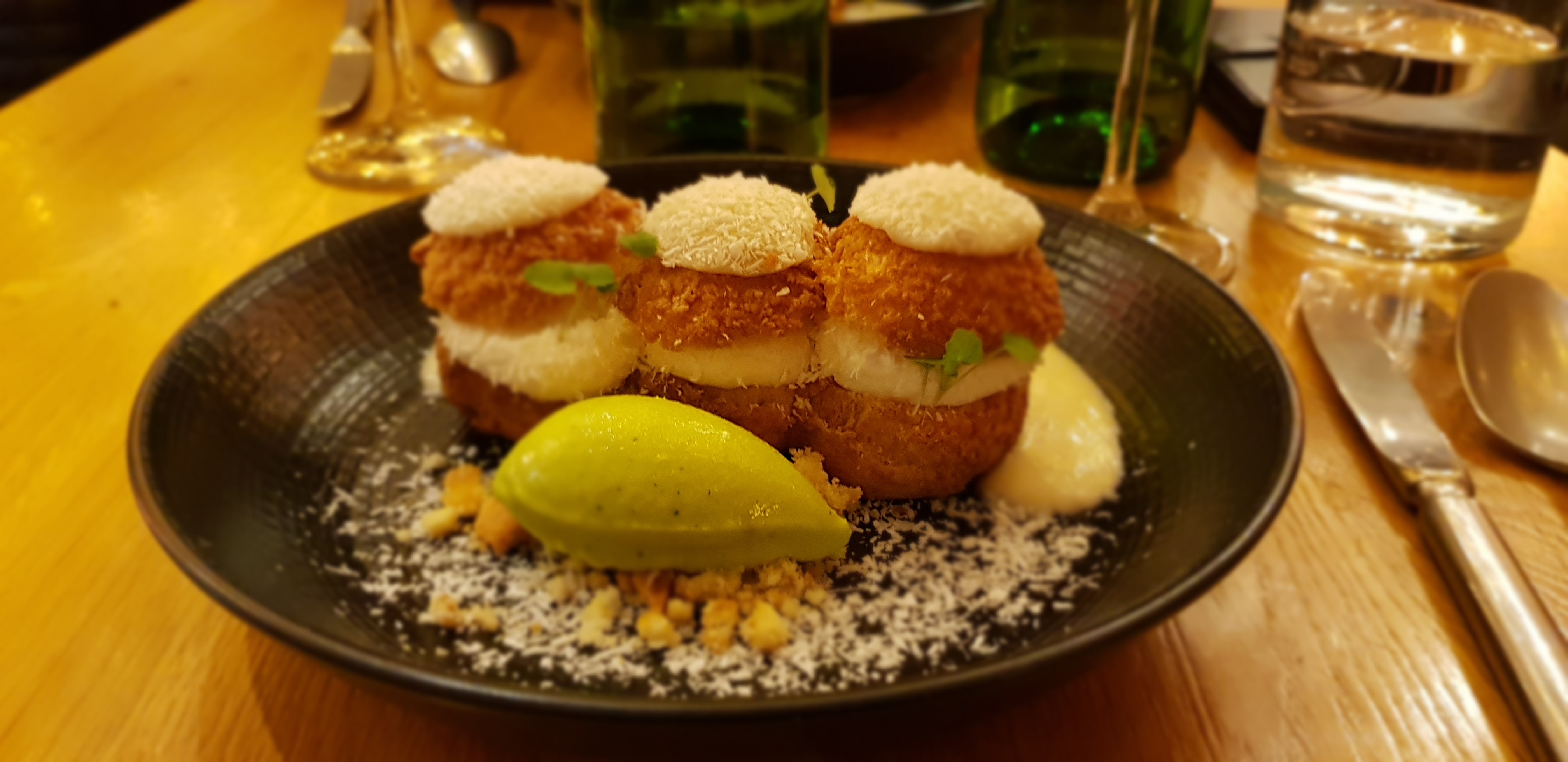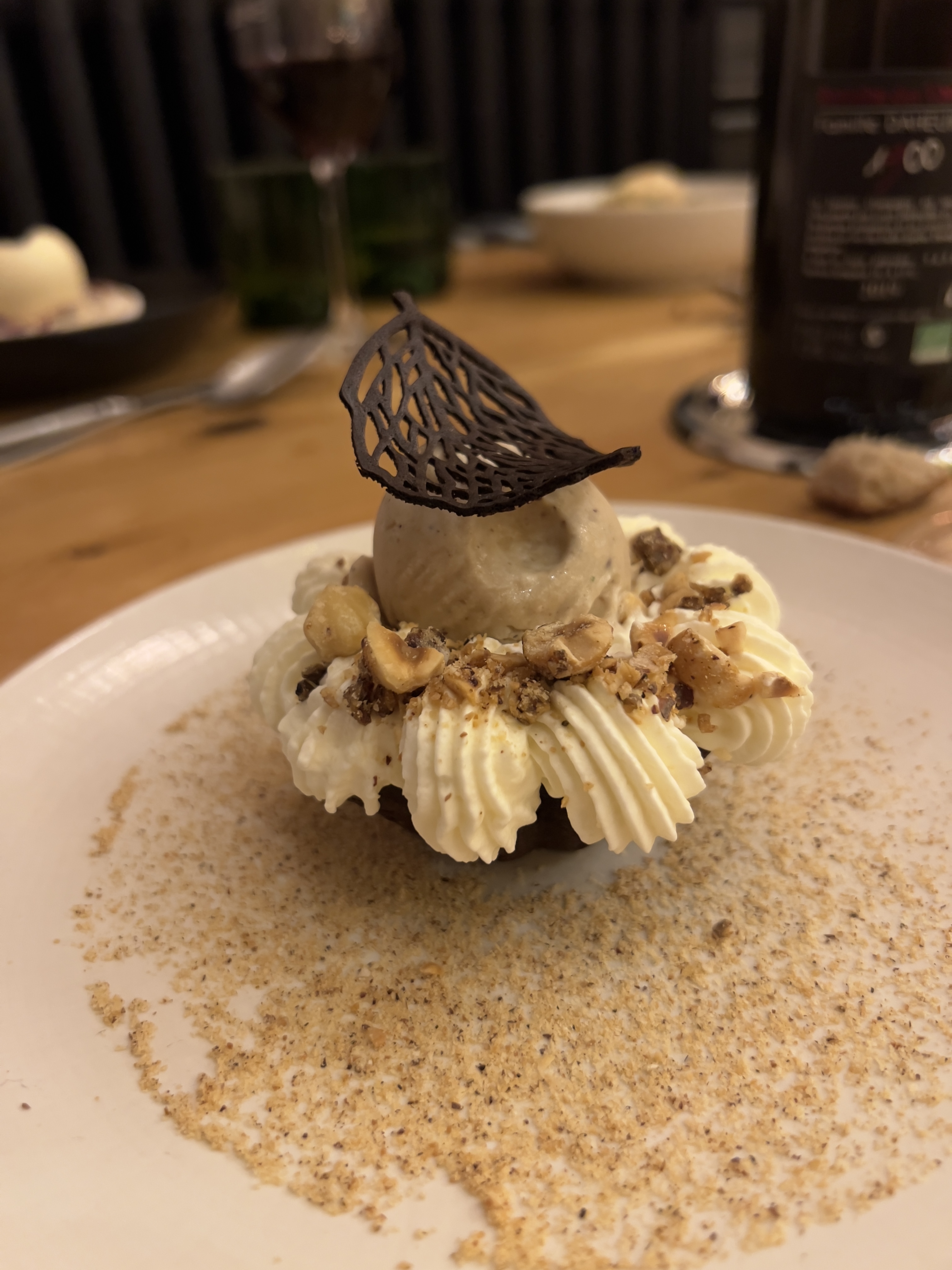 Plats excellents, bien travaillés et beaucoup de soin apporté à la présentation. Un peu déçue par le cookie moelleux recouvert par la glace et une crème chocolat (un peu too much à mon goût). Serveur adorable et salle très agréable et spacieuse. Je recommande !