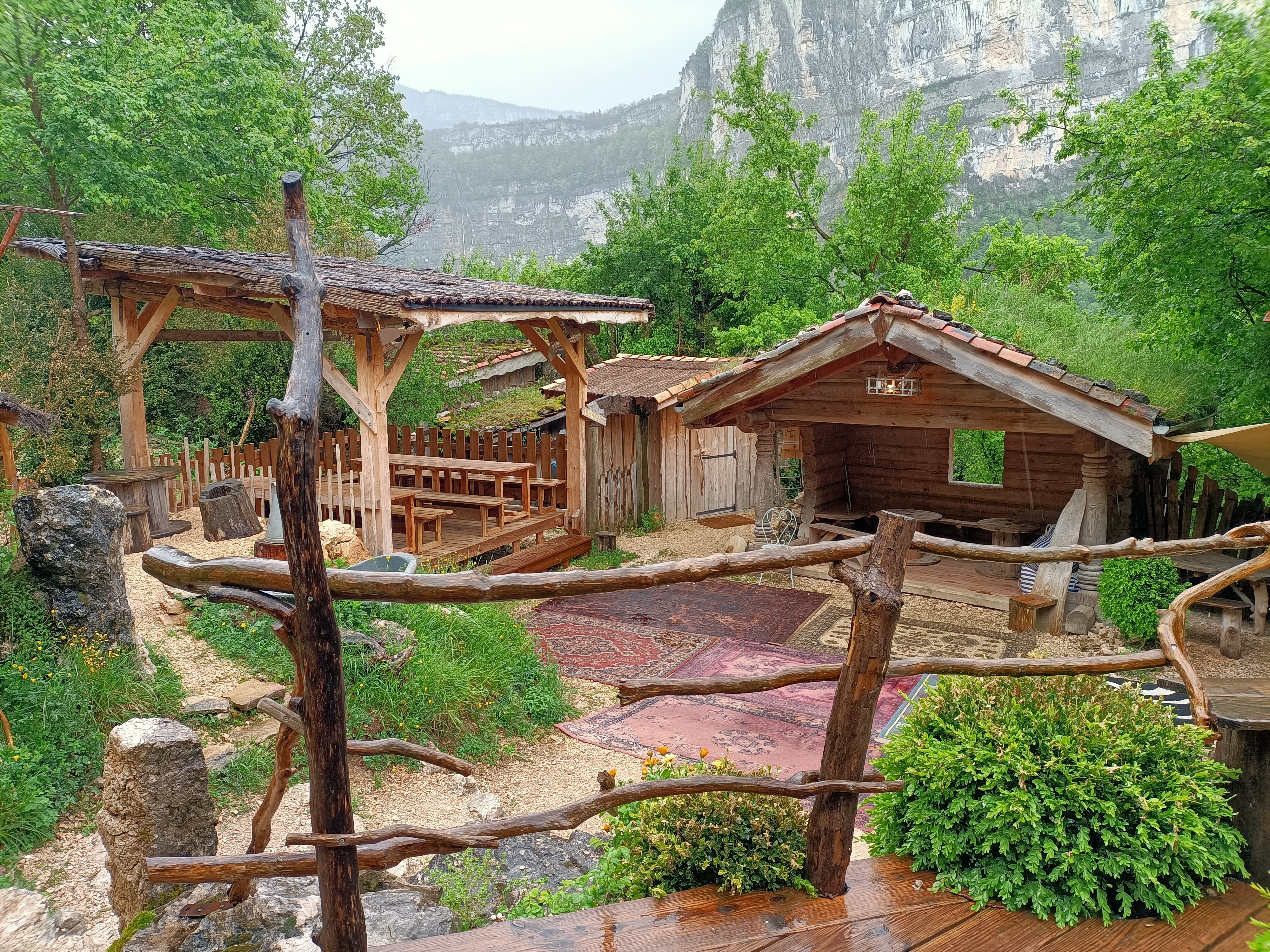 Idyllique ! Même avec une mauvaise météo. Concept tout à fait original : se rendre auprès de l'accueil pour faire son petit marché avant de rejoindre une cabane au choix pour y pique-niquer. Terrines, fromages, charcuterie etc. Des cabanes ouvertes, fermées, avec une vue imprenable sur la nature environnante.