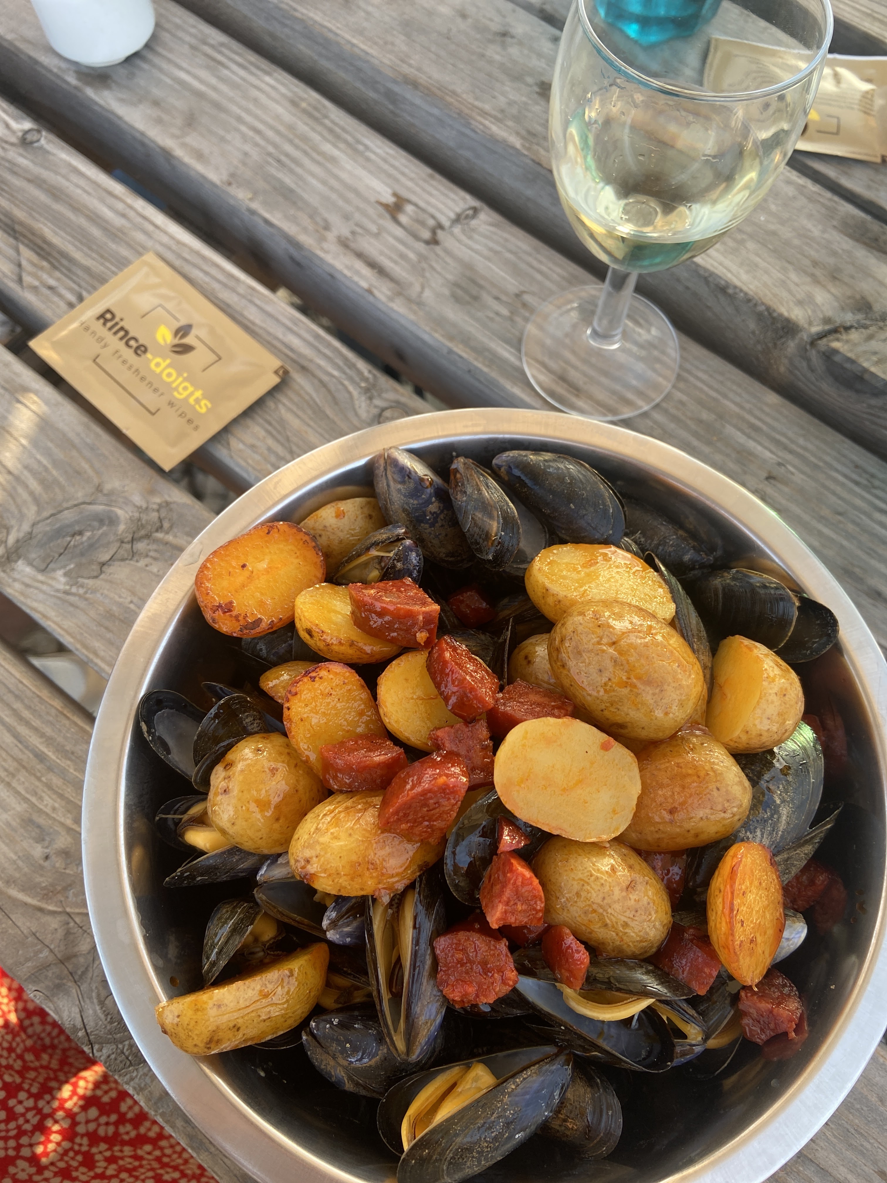 Accueil très chaleureux, aussi bien du personnel que du soleil, bien présent en fin de journée. Petite carte sympathique de produits de la mer. Les moules sont servies avec quelques pommes de terre grenailles cuites dans leur jus (très bonnes mais qui mériteraient d'être un peu plus nombreuses). Vins de ré à l'honneur. En prime, la possibilité de déguster tout cela sur un bateau..