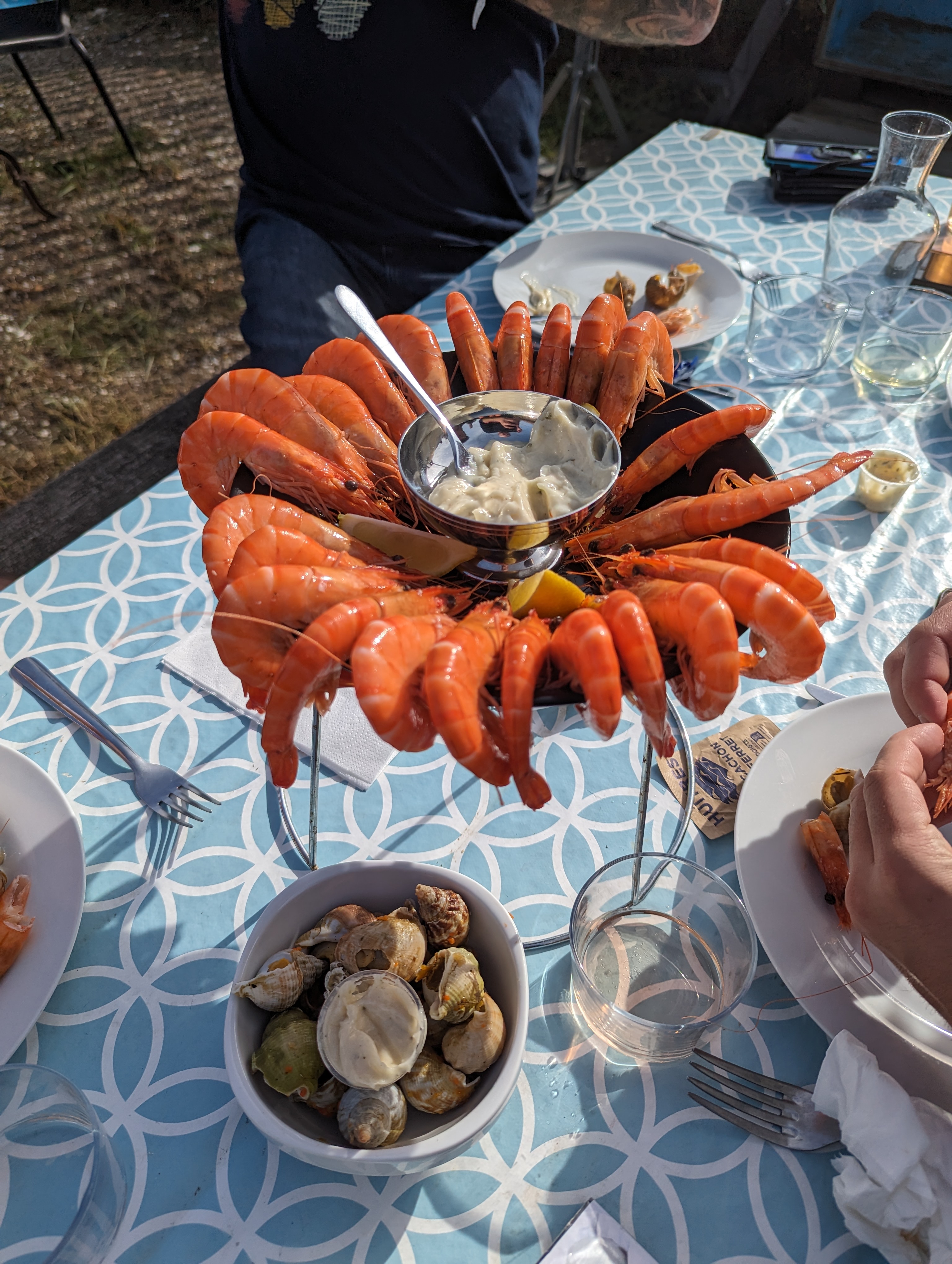 Huîtres naturelles, crevettes et bulots de très bonne qualité Vin blanc au top très bon accueil un tout petit peu long mais très bon et on est en vacances Le site vaut le coup de patienter un petit peu Je conseille vivement