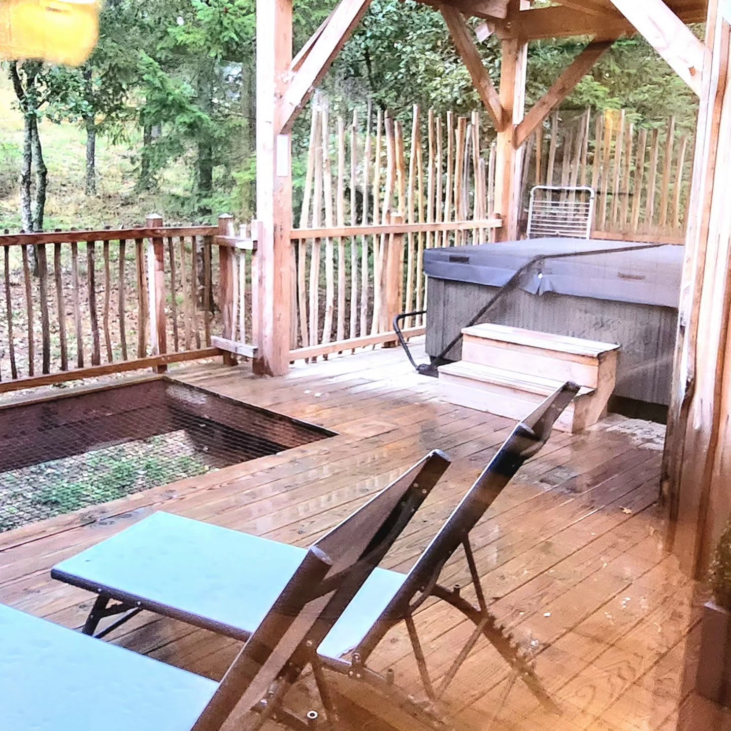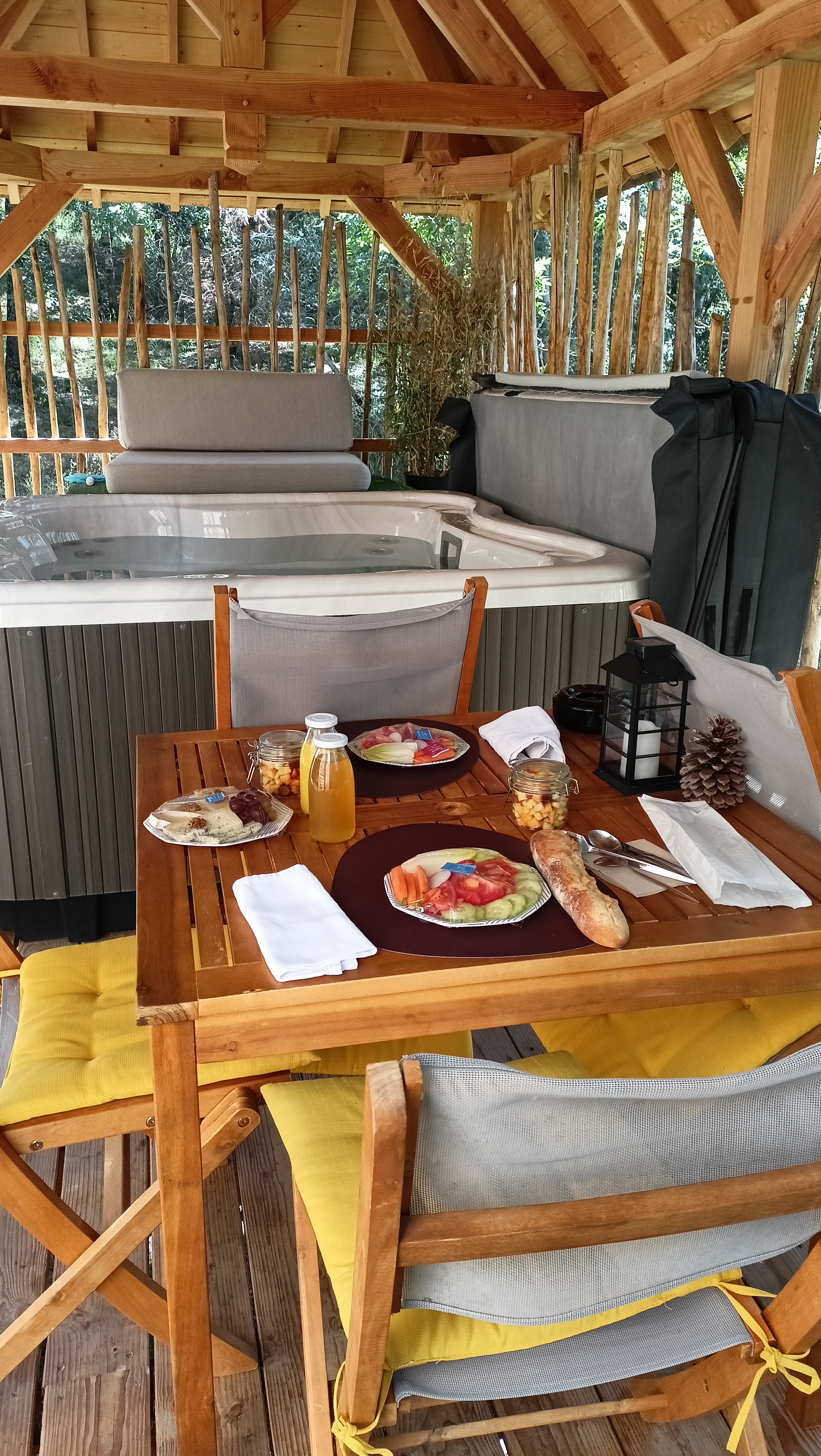 Parenthèse hors du temps. Tout était parfait, l’accueil, le repas servi dans la cabane, le spa, même la pluie qui nous a bercés. Merci pour ce beau moment