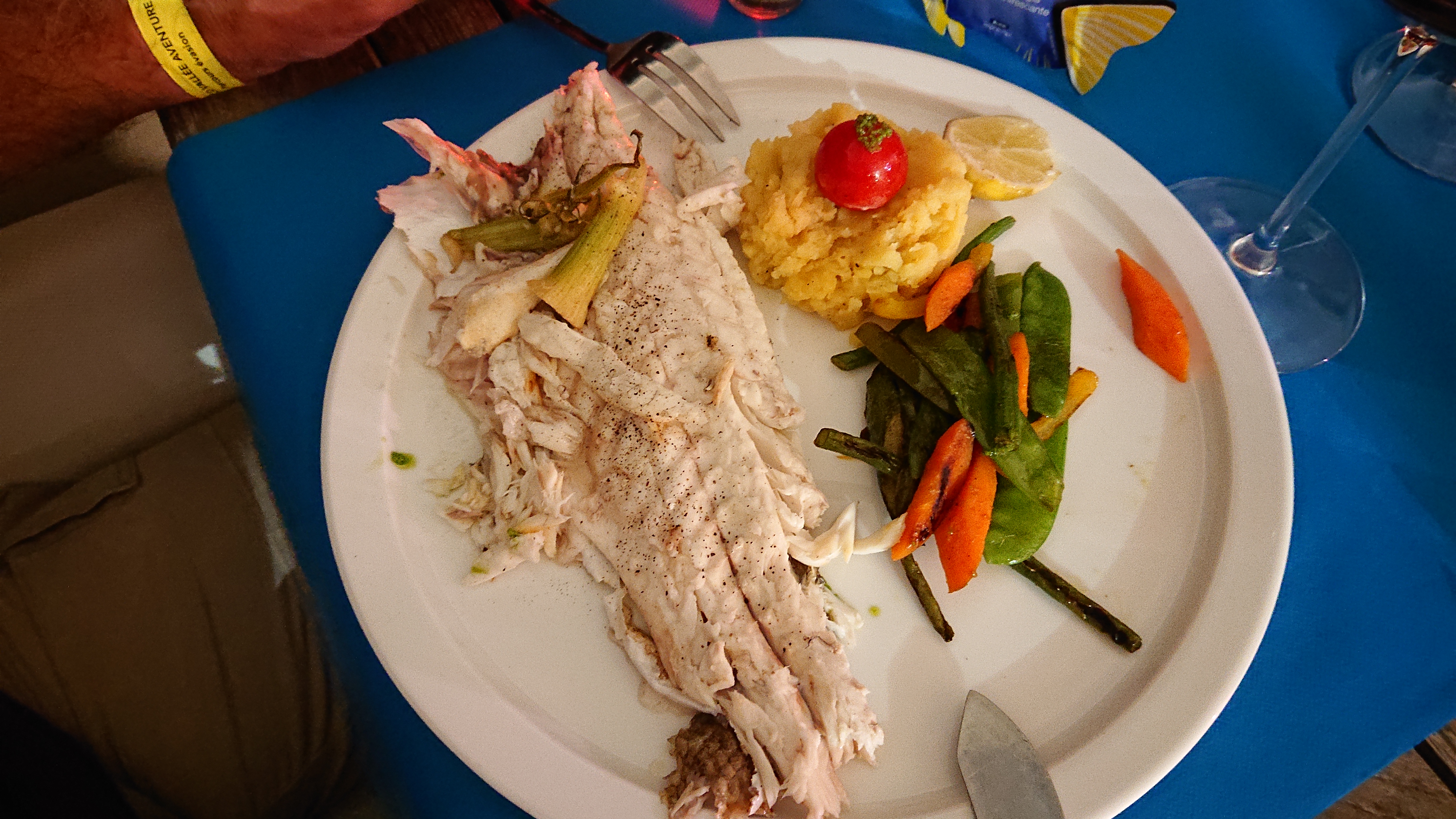 personnel très attentionné, terrasse au bord de l'eau très agréable un loup de mer au petits légumes à tomber par terre Merci pour cette agréable repas