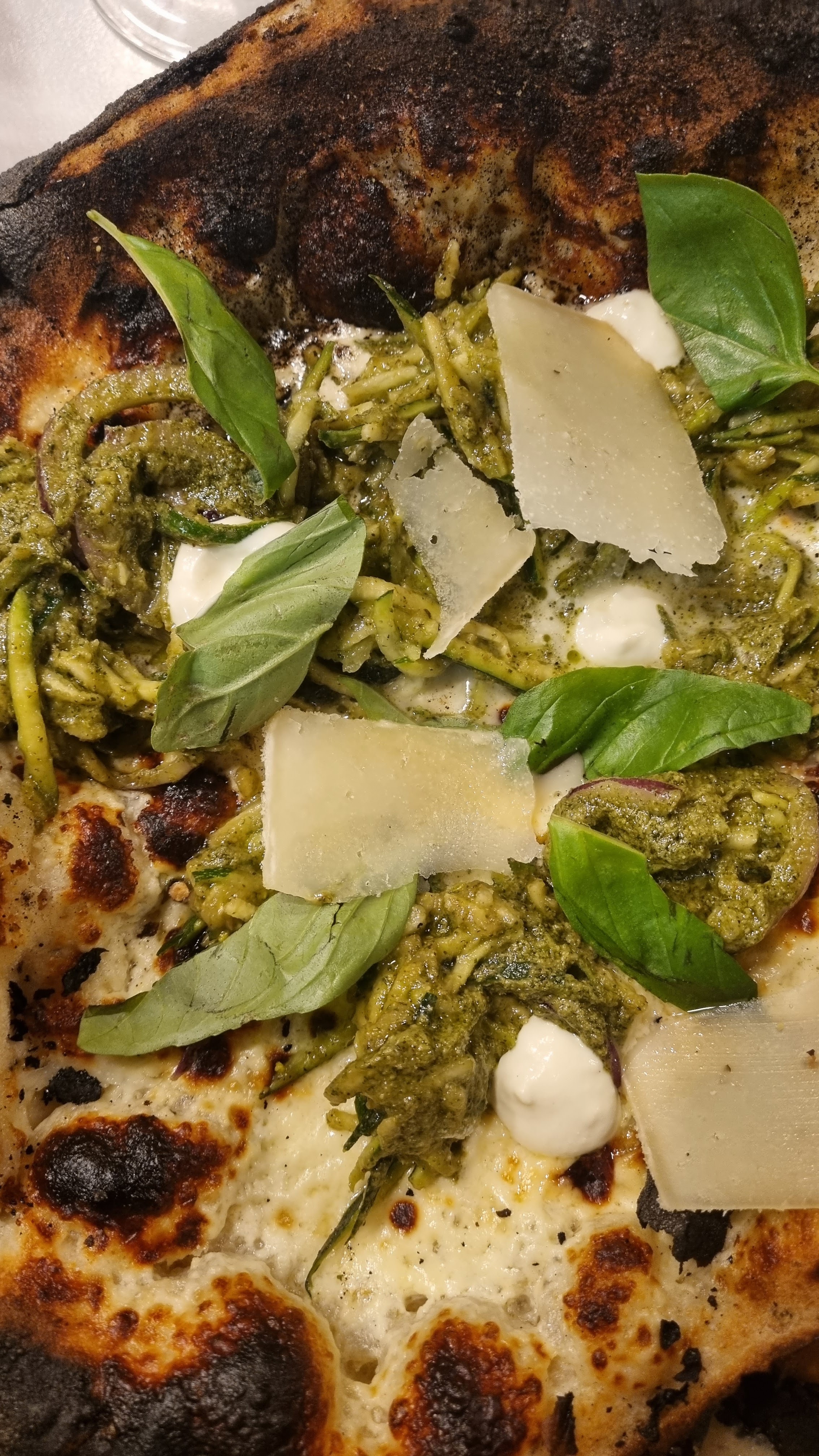 Il y a des bons et des mauvais soirs. Quand la cuisine n’est pas honorée par l’organisation, le plaisir pâtit. C’était, probablement, un mauvais soir pour l’organisation qui a causé plus de 30 minutes d’attente après avoir fini le plat, voir des tables à l’arrivée plus tardive se faire proposer la suite. Ce qui a conduit à un départ prématuré. Côté cuisine, pourtant, une adresse qui sait faire les choses. Sur notre table deux pizza. La cacio e pepe, la zucchini. Un classique et une intrépide. Pour la cacio, ça manquait de crème de pecorino mais là saveur était là. Pour la zucchini, on apprécie l’audace et le bon mélange des saveurs. Pas le côté pratique. Remplacer les spaghetti, qui dégringolent bon gré à chaque part coupée ou chaque passage de fourchette, par des belles tranches de courgettes épaisses (et garder le reste pour un petit antipasti et zéro gaspi) serait le mieux venu. Manque un dernier twist : une pistache ou tomate séchée peut-être pour garder l’esprit veggie. Globalement c’était un peu petit pour le prix. Mais les ingrédients et l’économie font cette réalité à ne pas contester. À réessayer, éventuellement.