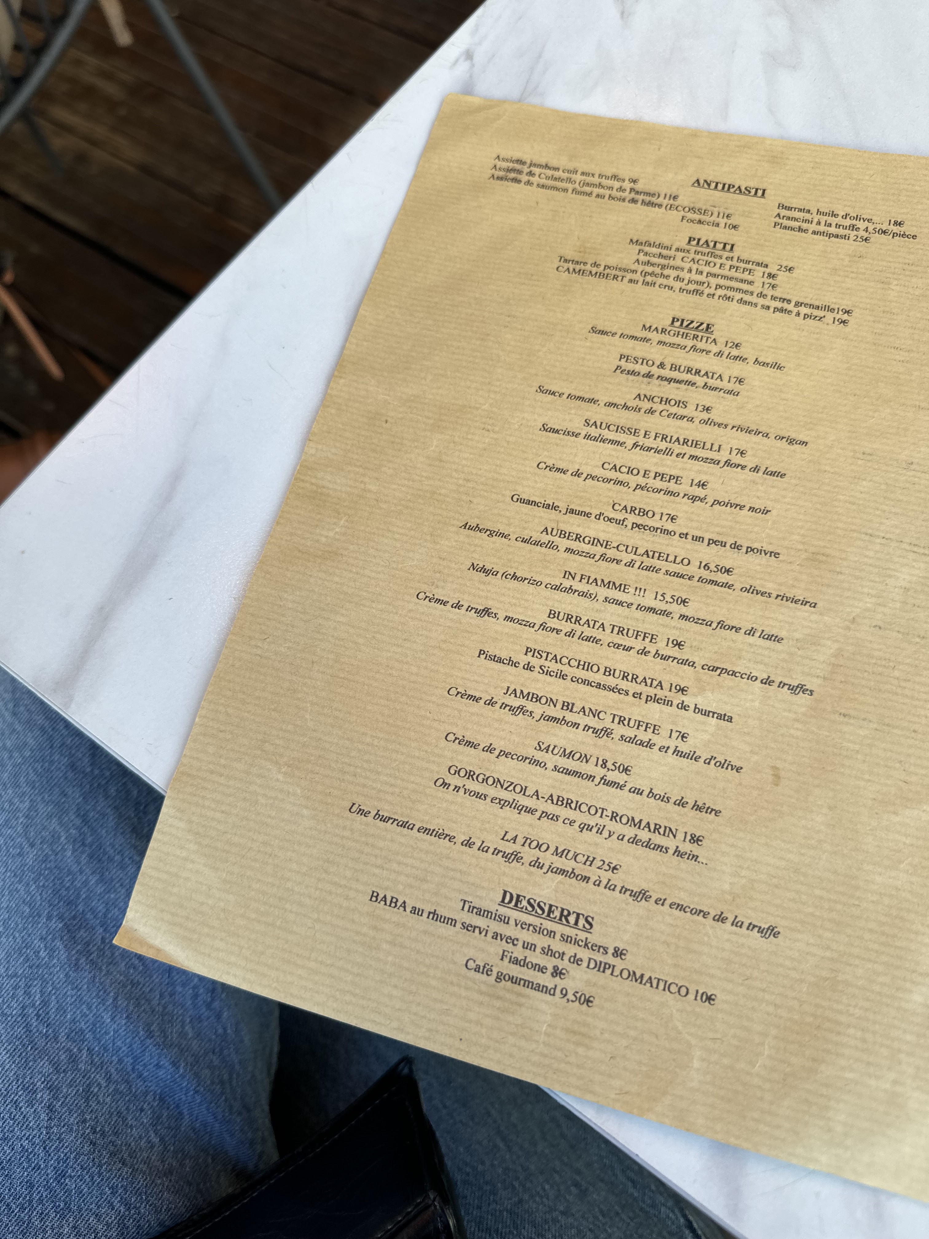 carte sympa, antipasti, excellentes pizzas, service souriant et professionnel et prix très très corrects très bonne adresse