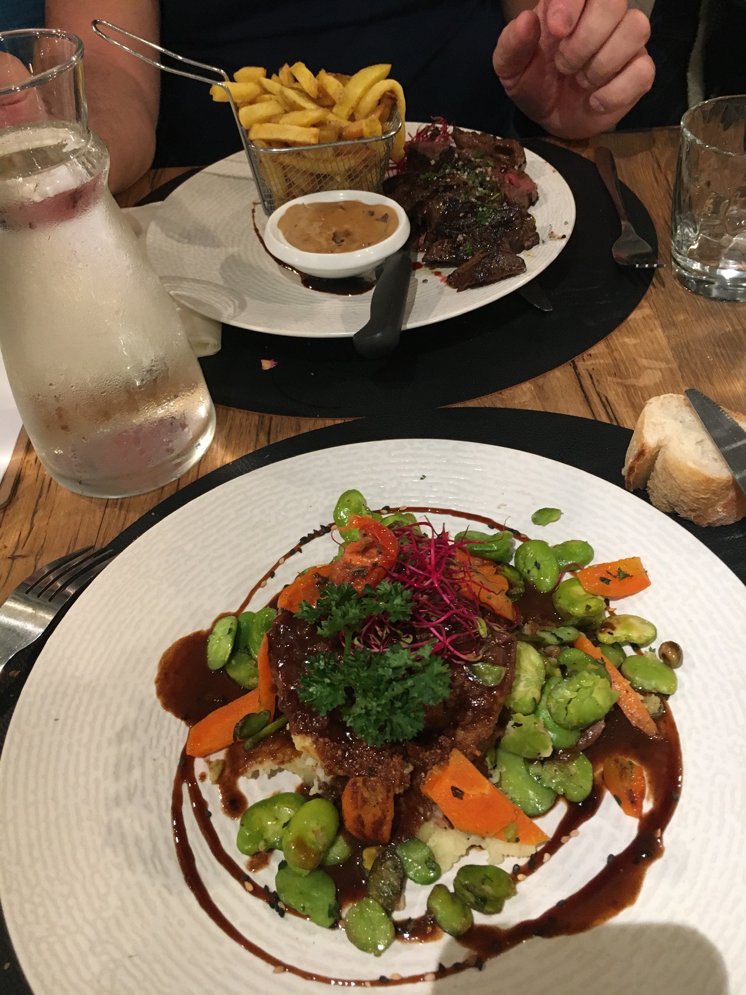 Très bon accueil, service rapide, n’ayant pas été convaincu par les plats du moment, je me suis rabattu sur la viande, très bonne, cuisson respectée. En revanche j’ai trouvé ça cher pour la quantité et la garniture. Aussi, je n’ai pas compris le choix d’une assiette creuse pour un morceau de viande rouge et des frites, pas très pratique au final. Je compte tout de même y retourner à l’occasion pour ne pas rester sur une demi-teinte et goûter les plats.