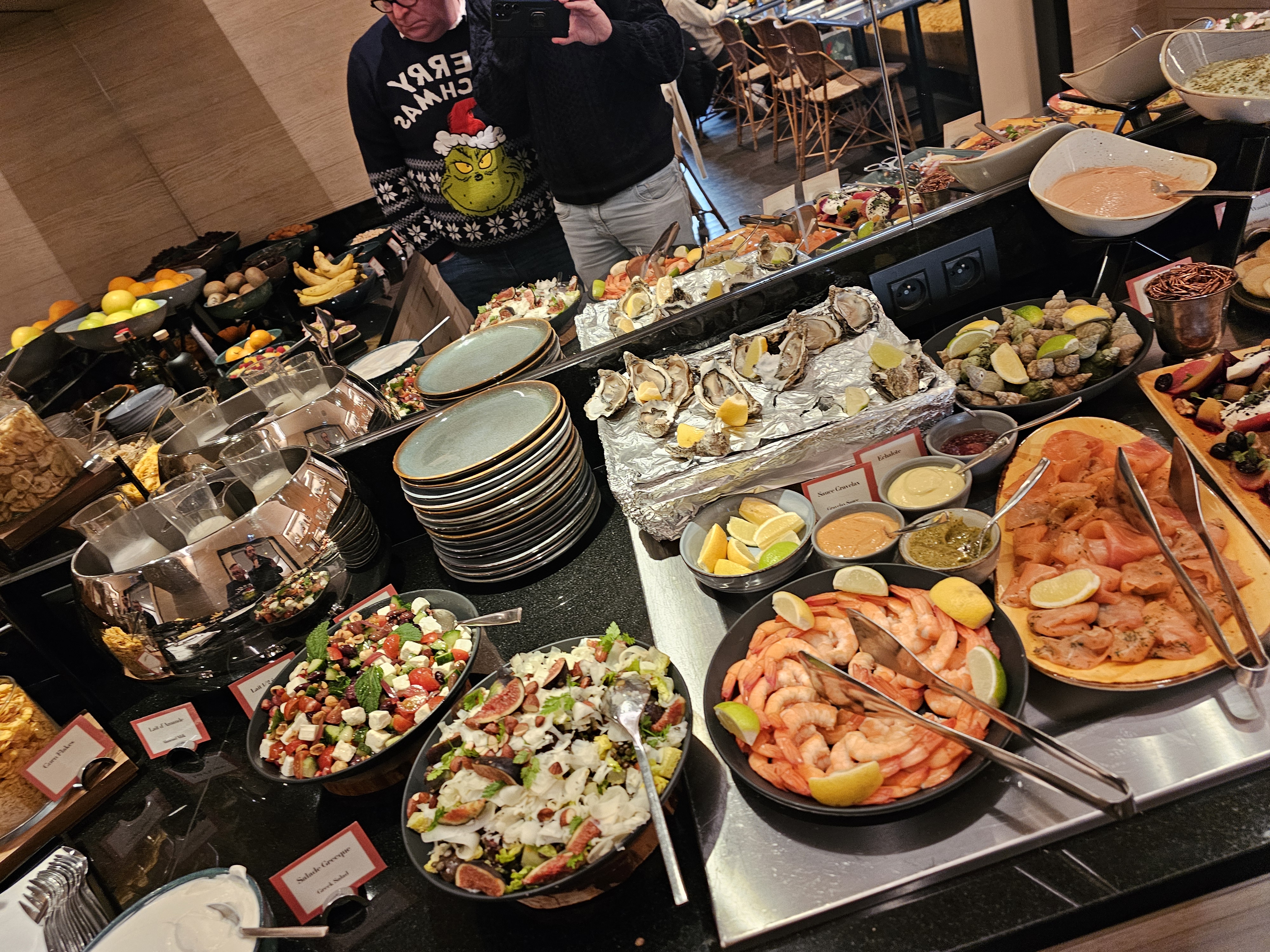 Service parfait pour ce brunch qui reste un peu cher par rapport à ce qui est proposé. Les plats sont bons volaille et saumon ce jour ci.) Crevettes decortiquees et bulots. Jolie selection de taramas. Les pâtisseries sont très belles et sans gluten. Cependant les viennoiseries sont décevantes et pas au niveau du reste du brunch. Dommage. Les huitres presentees a la verticales perdent donc vite leur eau et collent vite a la coquille... Le lieu est sympathique mais sans plus. Les travaux de rénovation n'aident clairement pas.
