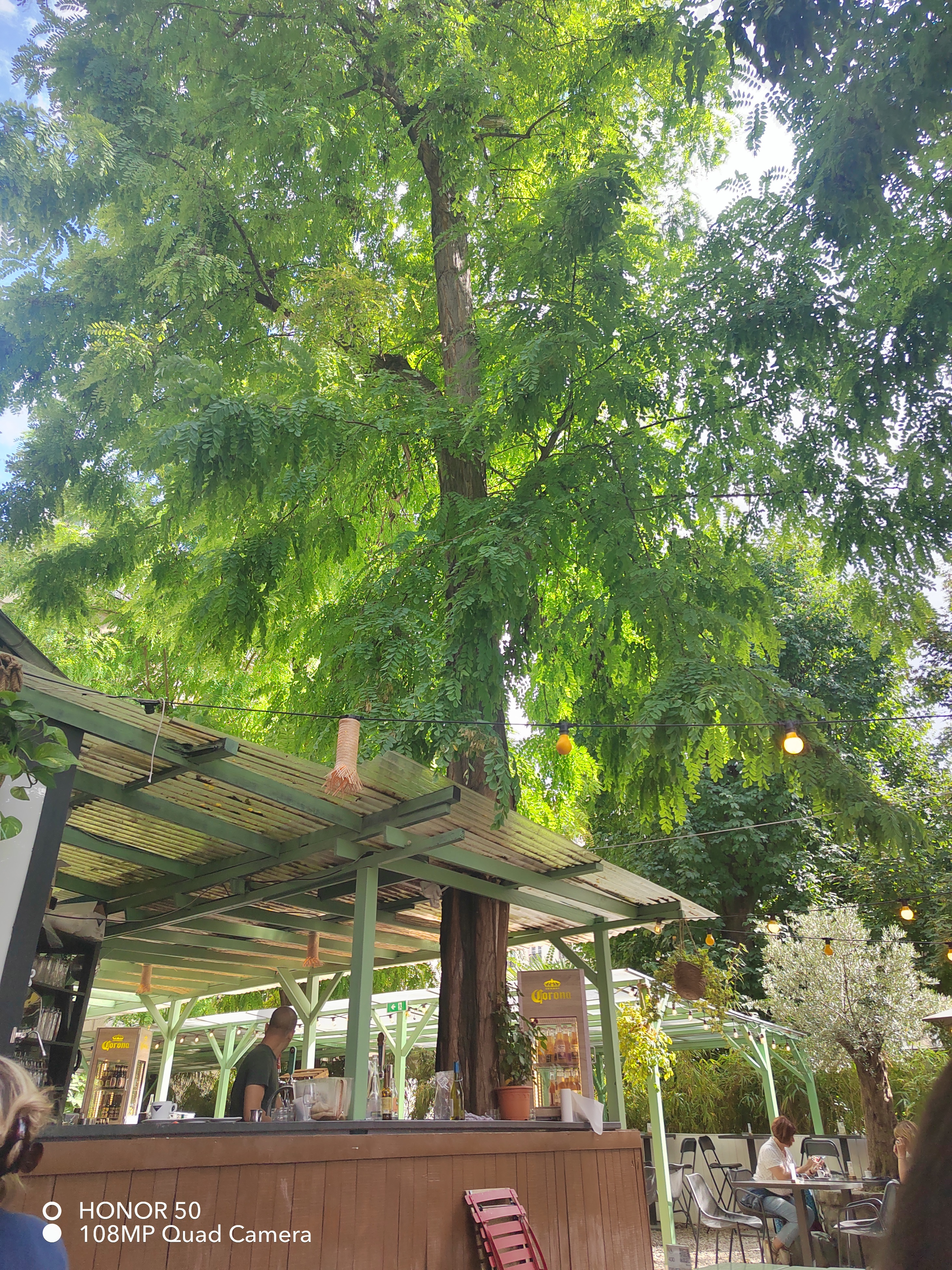 En mois du mai où il pleuvait tous les soirs avec l’orage, je suis allée prendre un verre avec des amis. Tout à coup comme les jours precents, il commencait à pleuvoir fort et tout le monde se réfugiait sous cet petit abri dans le magnidique jardin du café. On sirotait nos verres en écoutant le bruit puissant et de la pluie qui tapait le toit de l’abri. C’est ce genre d’experience qu’on peut faire dans ce café. On dit que c’est bien quand il fait beau (certes grace à sa magnifique terrasse dans le cours) mais on est bien ici même quand il ne fait pas beau, quand il pleut, quand l’orage tombe du ciel...