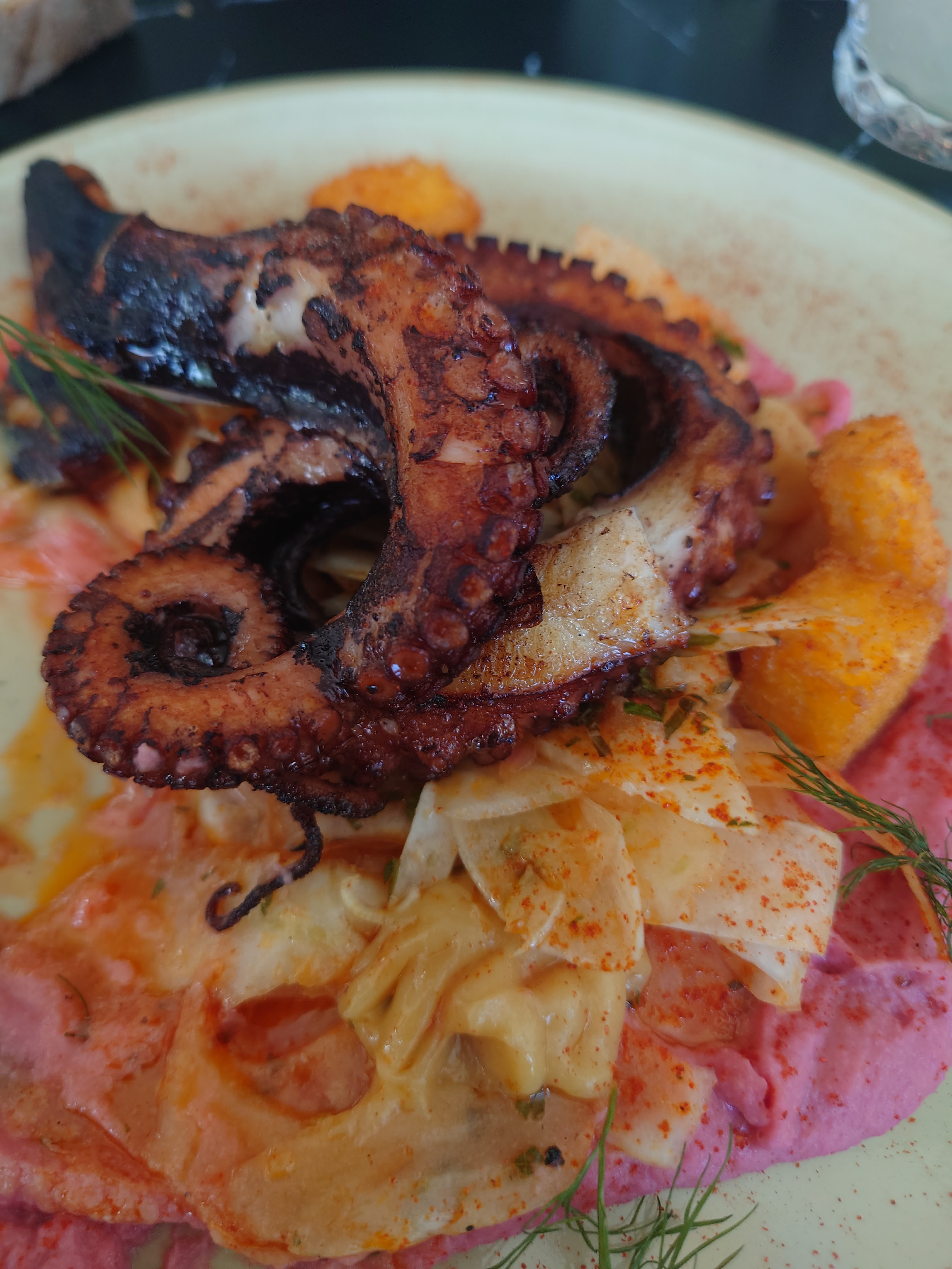 Après être allés au musée, avec mon mari et mon fils, nous avons fait une halte à ce restaurant juste à côté. Leur menu est très succinct. Beaucoup de végétal, très peu de viande, ou je dirais pas du tout, hormis de la truite et du poulpe, et si, de l'agneau ! Pas de bœuf, porc ou poulet..... Nous avons opté pour le menu Miro (car c'était le thème de l'exposition du musée juste à côté). Soit. Serveuses et serveur fort sympathiques et dispos. Il y avait des asperges en entrées, parfaites et bien relatives à l'artiste Miro. Mais le poulpe, autant c'était bien présenté, mais il était très noir par certains côtés, ça sentait le brûlé d'ailleurs, et le plat n'avait aucun goût. Sauf du citron prédominant. Rien à dire pour le dessert. Je préférais, et de loin, le 5 !!!