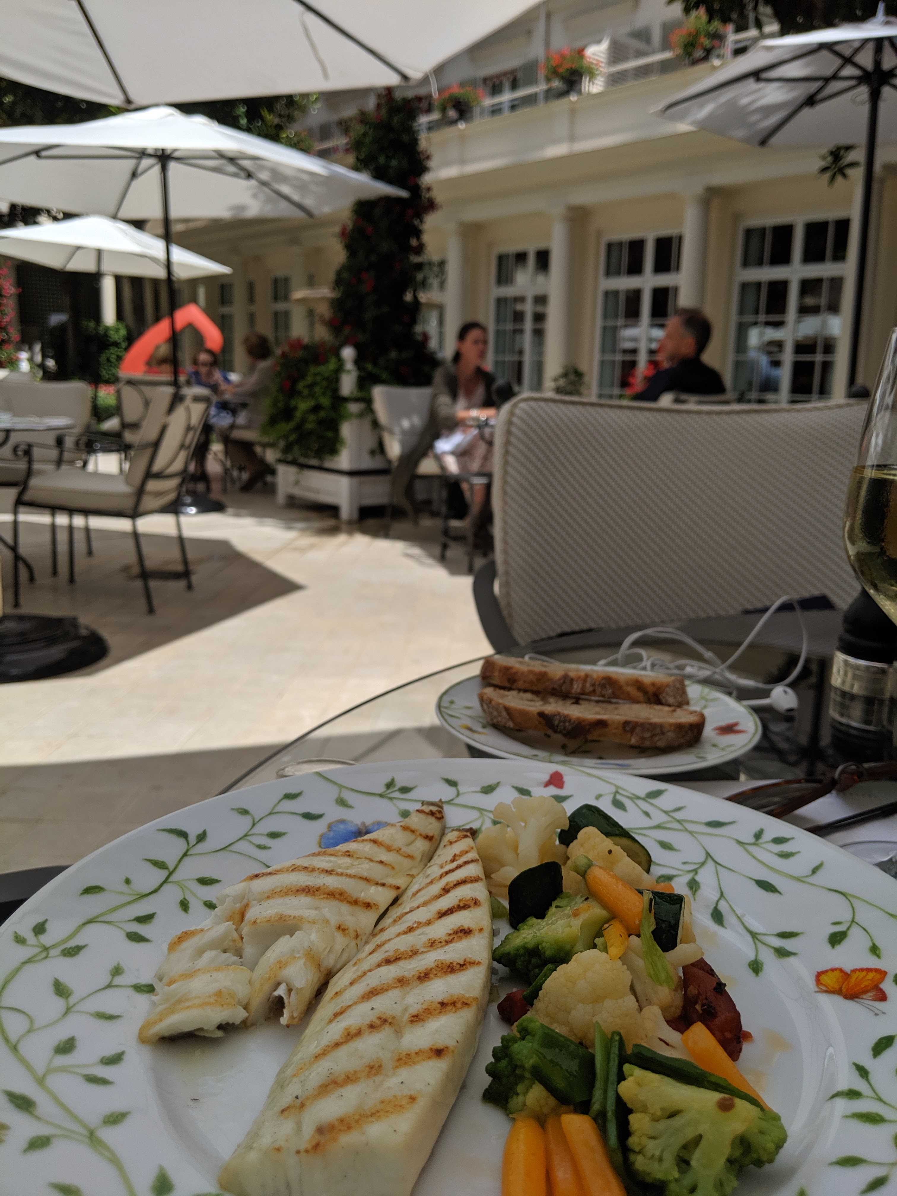 Bon service, bel espace extérieur, très cher et pas d'options végétaliennes