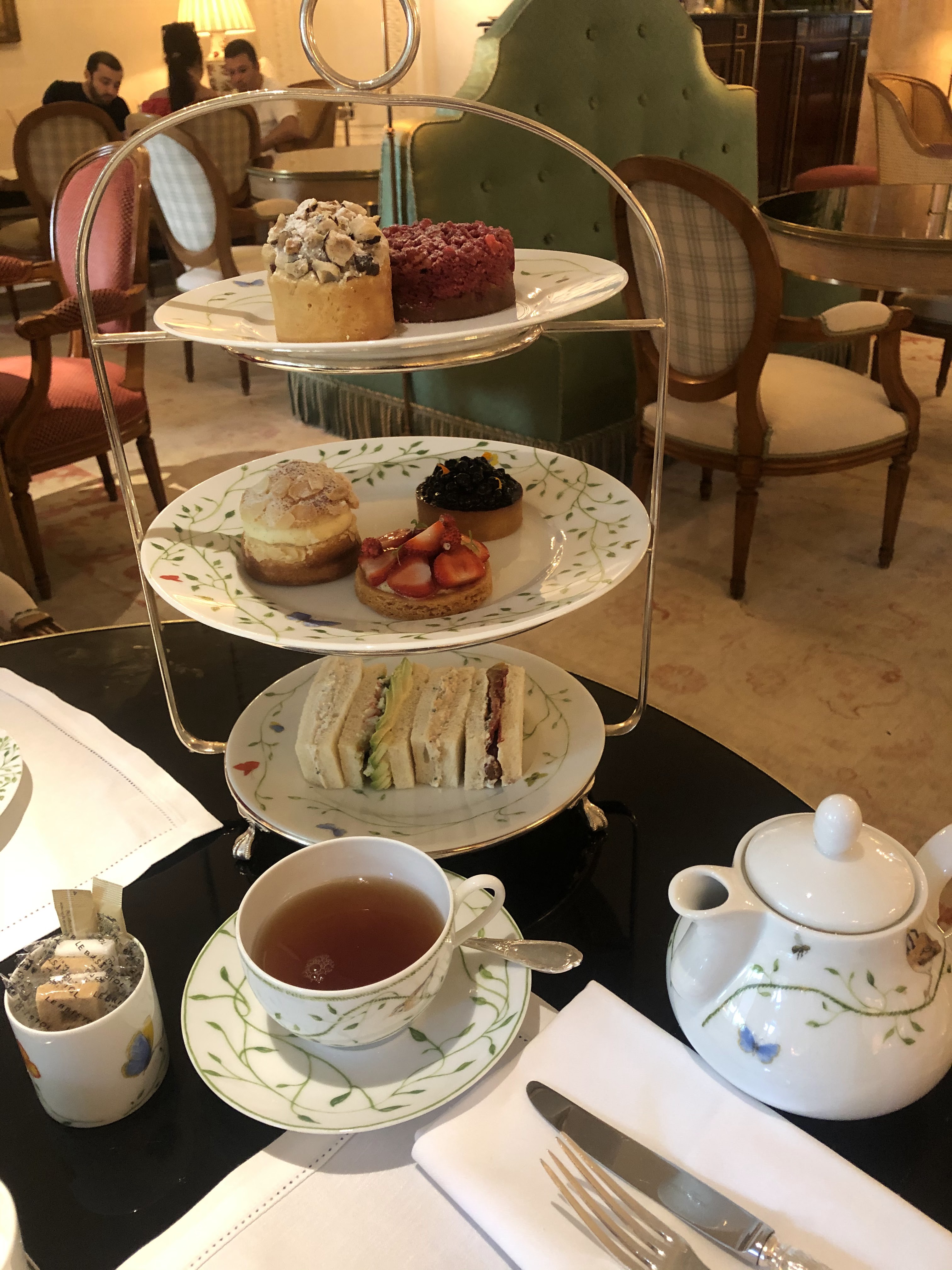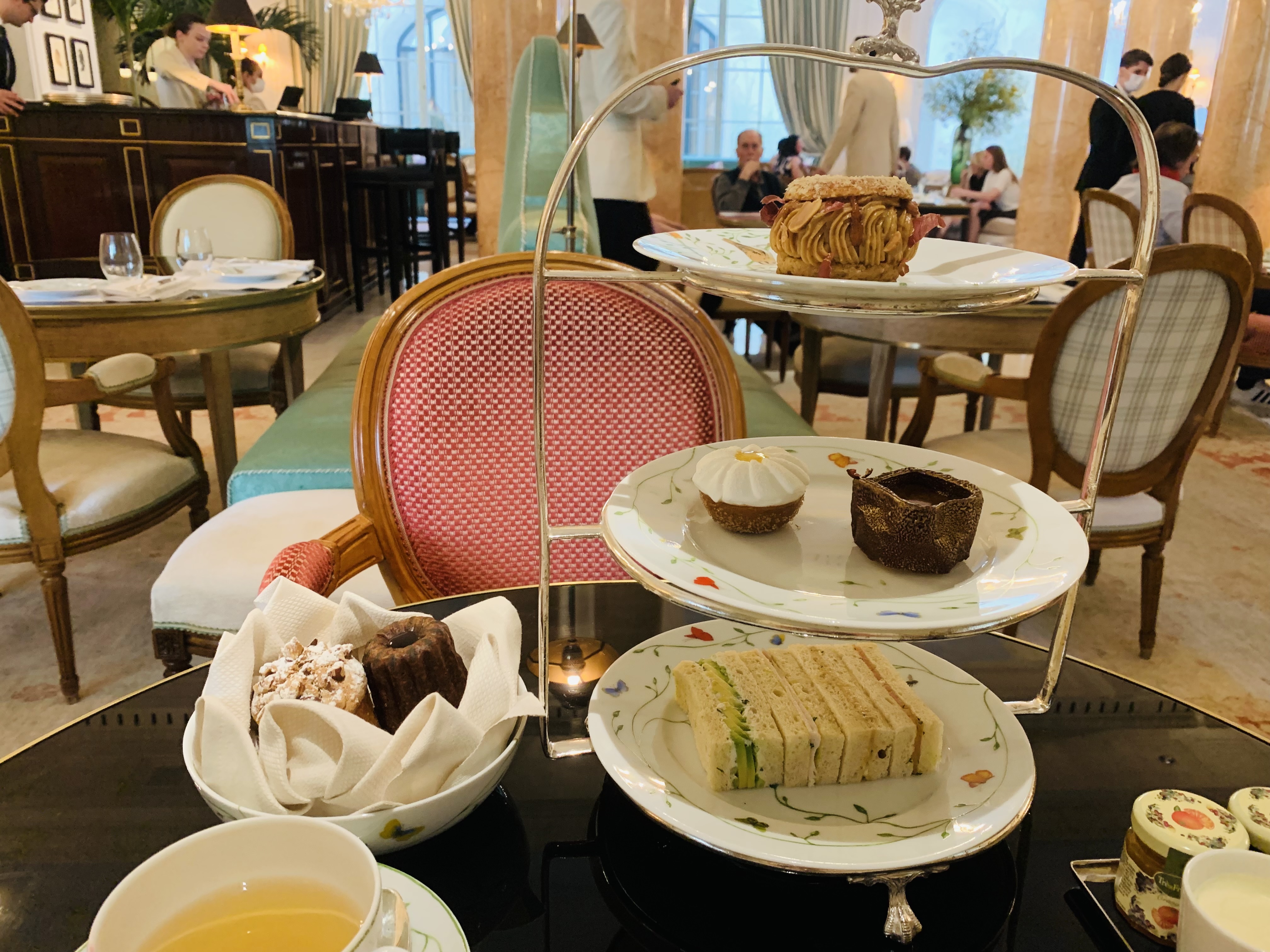 Salon de thé du Bristol, palace parisien, à 2 pas du palais de l'Elysée. Décor Marie-Antoinette. Parfait pour un thé de l'après-midi. Pour 60 EUR par personne, vous dégustez 4 mini sandwiches préparés par E Frechon (3* Michelin), 1 scone à la crème et confiture, 1 cannelé et 3 pâtisseries délicieuses. A essayer une fois. Il est prudent de réserver...