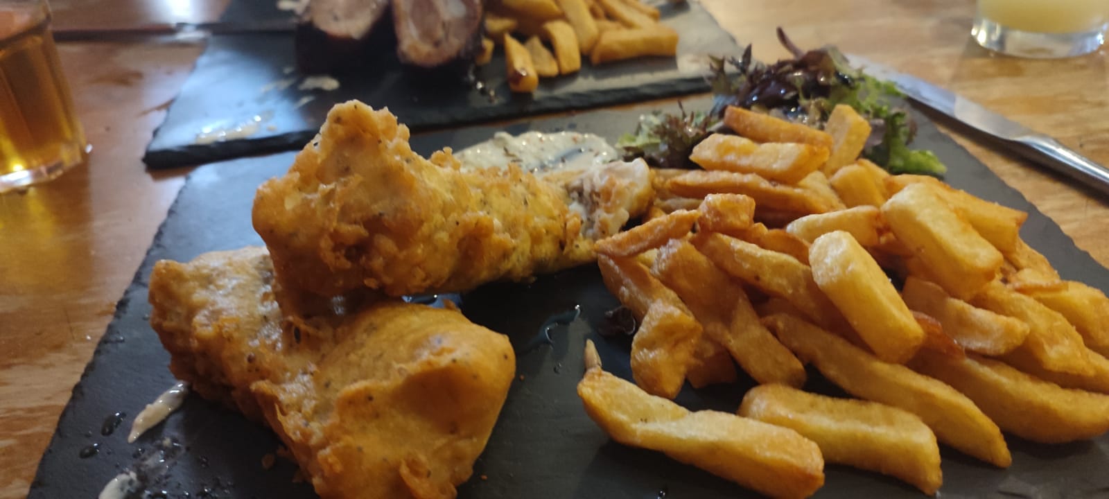 Je suis d'habitude très méfiante sur le poisson, mais là j'ai mangé un excellent fish'n chips ! Panure maison, sauce maison. Ma fille de 5 ans a préféré la saucisse bretonne... Elle n'en a fait qu'une bouchée.