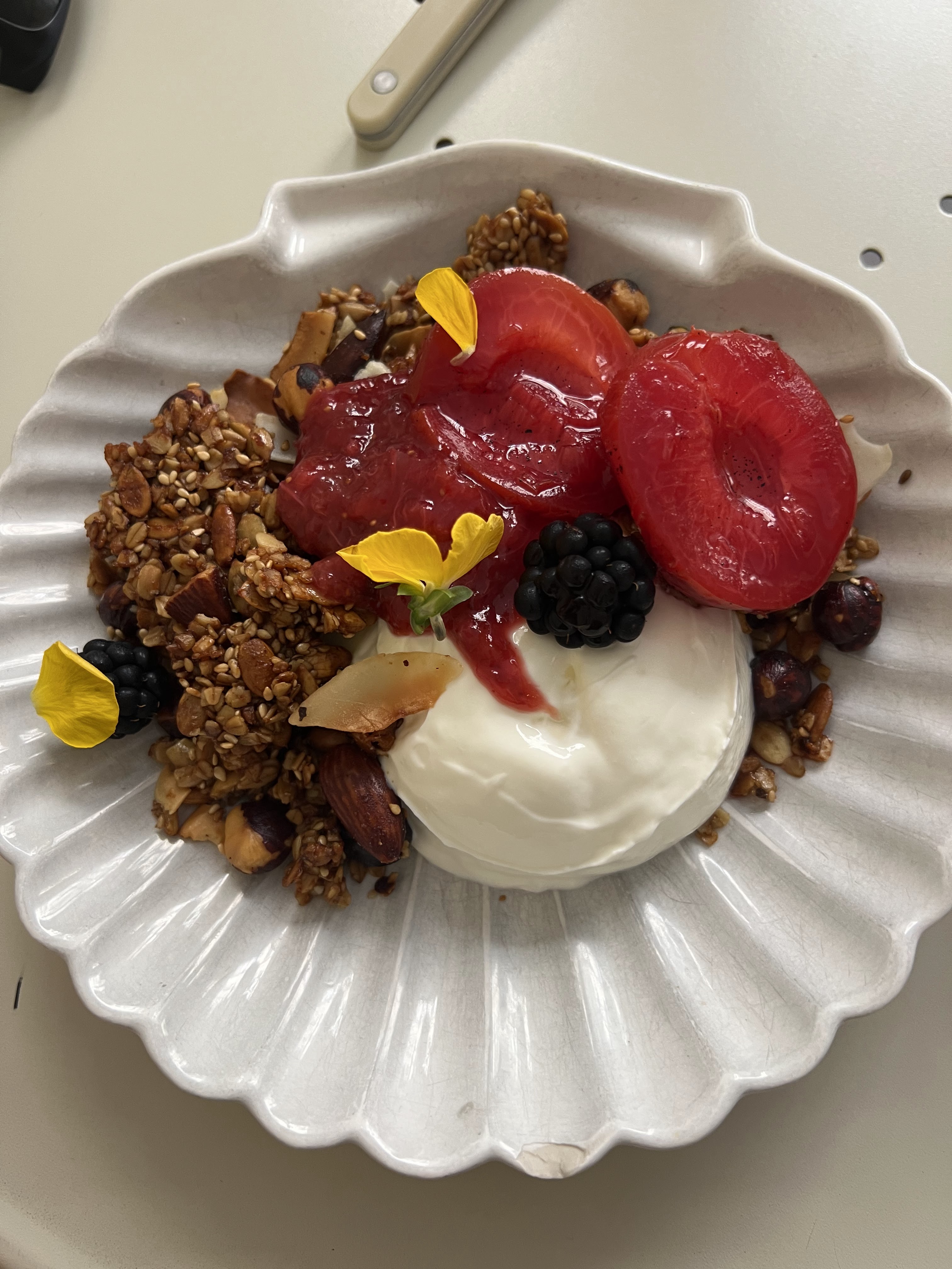 Le granola était très bon ; les abricots et les cerises cuits étaient une très belle touche, ni trop sucrés ni trop lourds. Il aurait pu être accompagné d'un peu plus de yaourt pour en faire un bon petit-déjeuner, mais peut-être que c'est juste moi :) Le toast à l'avocat de mon petit ami était un peu trop ennuyeux et lourd. La palette de couleurs de cet endroit présente des similitudes avec un film de Wes Anderson ou avec n'importe quel nouveau spot de santé de Los Angeles. Dans l’ensemble, prendre un petit-déjeuner avec un adorable chien Shiba accompagné d’un petit-déjeuner sain constitue une matinée agréable !