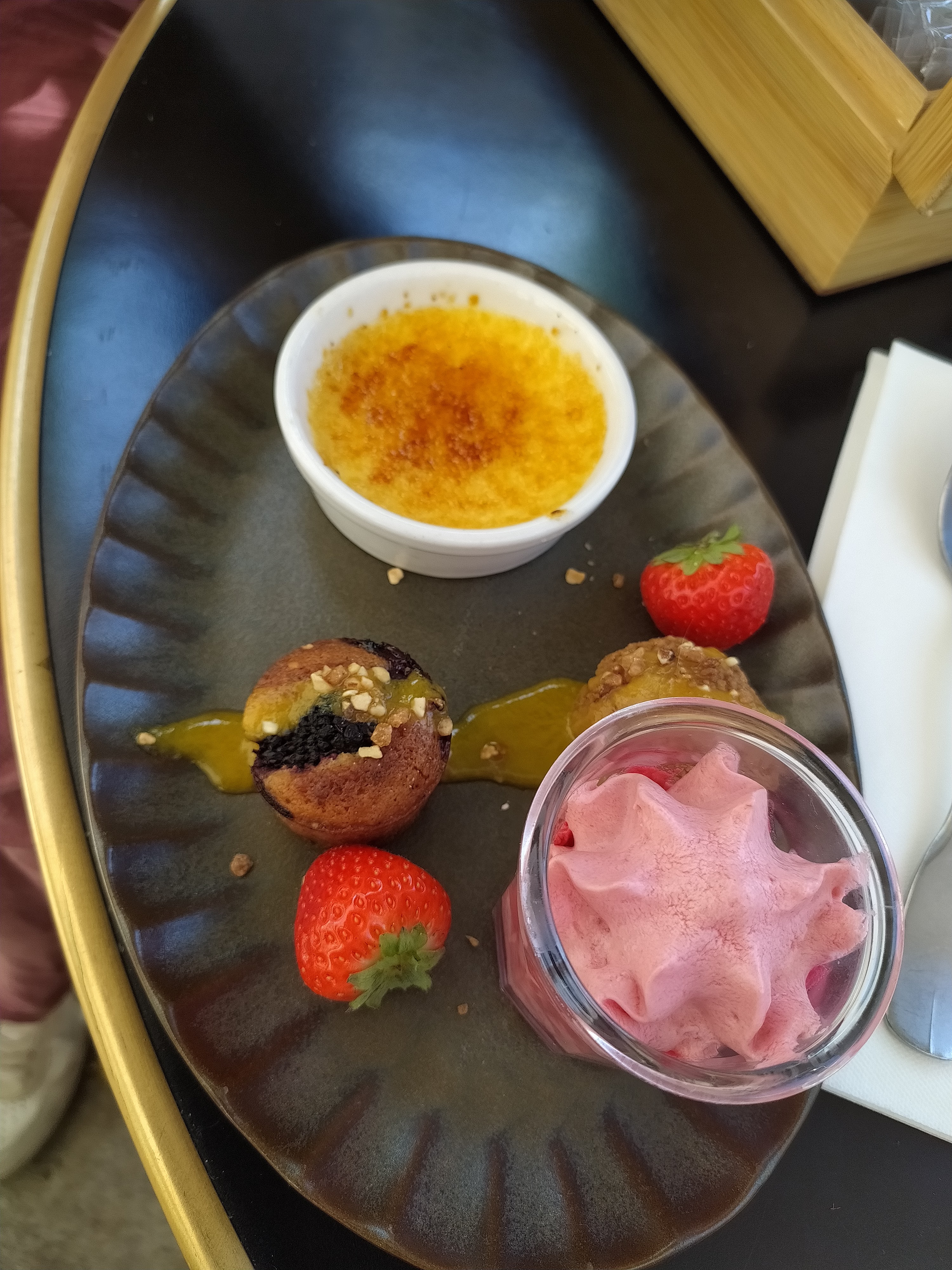 Je n’ai pas pris de photo lors de cet agréable moment, on était pris par le temps :s Même si mon avis ne concerne qu’un seul plat, c’était juste magnifique ! La noisette d’agneau et ses accompagnements étaient juste une dinguerie ! A en faire oublier le prix, croyez bien que ce n’est pas une mince affaire avec moi. Le thé gourmand était satisfaisant à son niveau, en même temps il ne faut jamais avoir de grosses attentes sur les cafés/thé gourmands, mais là ça allait, et le thé noir aux amandes était aussi une découverte intéressante. Concernant le service, réactivité et amabilité étaient au rendez vous malgré le rush évident dû à l’horaire et le week end particulier de Pâques. Bravo et merci Julie pour avoir contribué à ce moment. Même le côté toilette est sympa Ahah Petit bémol qui n’impactera pas la note, l’eau. Elle n’est simplement pas bonne de goût, même après plusieurs tentatives et avec des avis convergent.