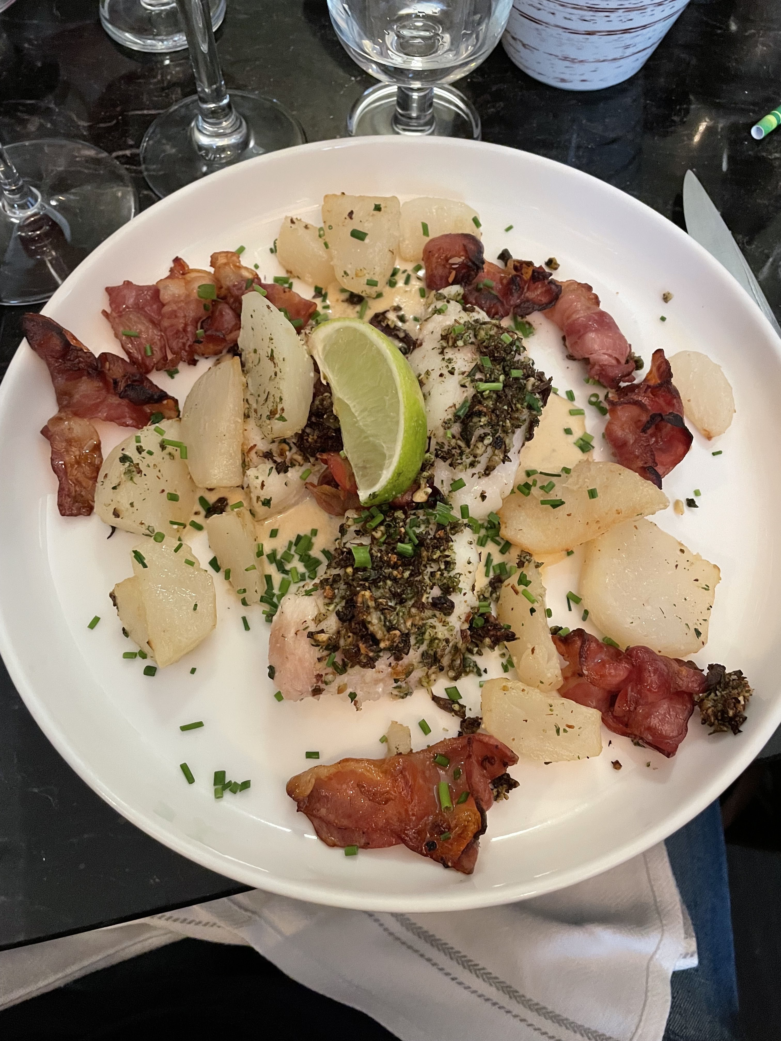 Entrée : os à moelle gratiné Plat : cassolet de rognons de veau à l'armagnac et piquillos (frites de la mer du colombier) Dessert : Pain perdu poire / caramel /noisettes Petit restaurant avec une nouvelle consultante de l'entreprise, le décor est sympa et le repas copieux. Instagram : minhfitcook