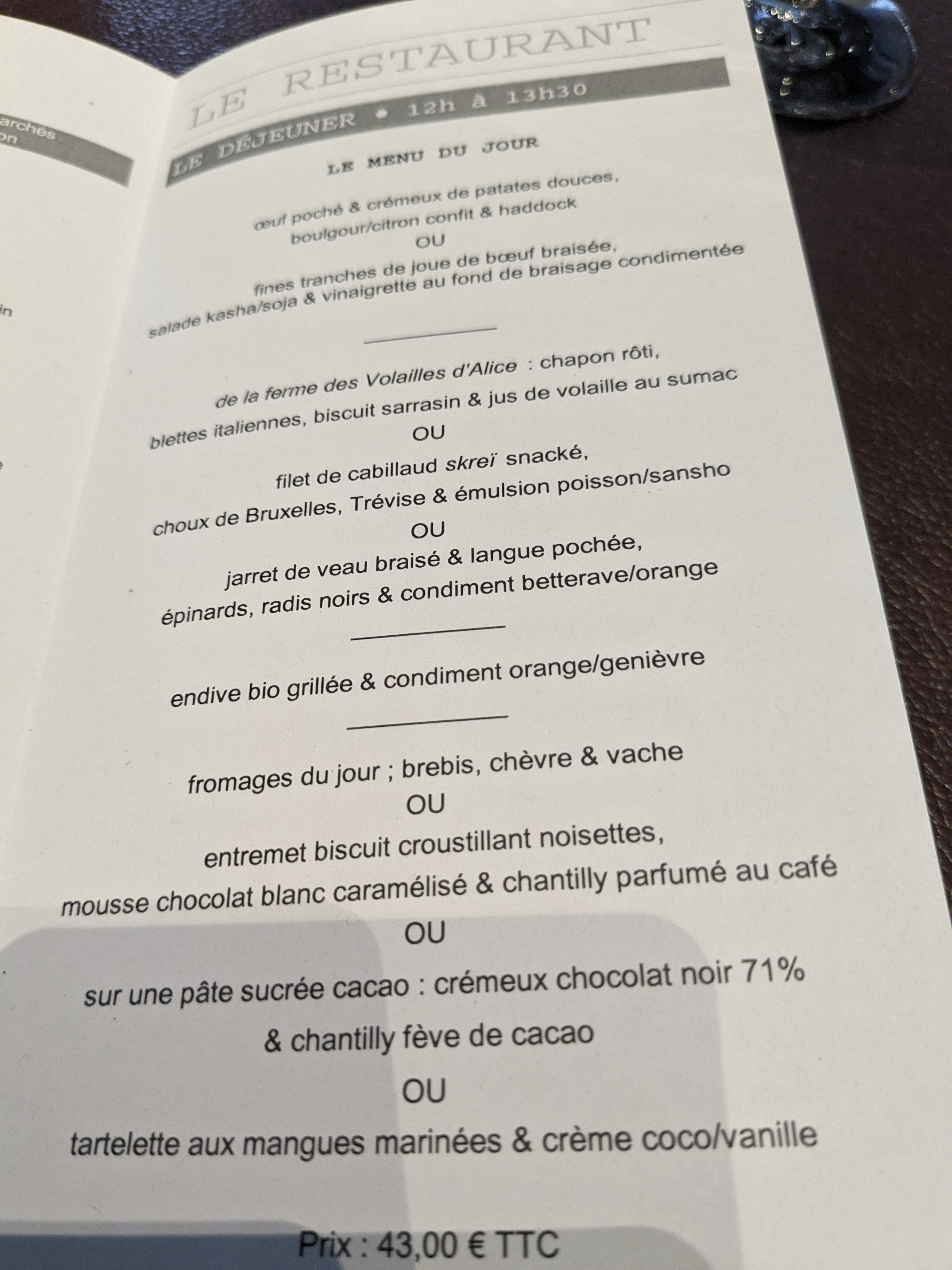 Exceptionnel rapport qualité prix. Pas donné 43 euros le menu mais quel voyage ! De belles émotions avec des surprises et associations de goûts jamais vu à ce prix