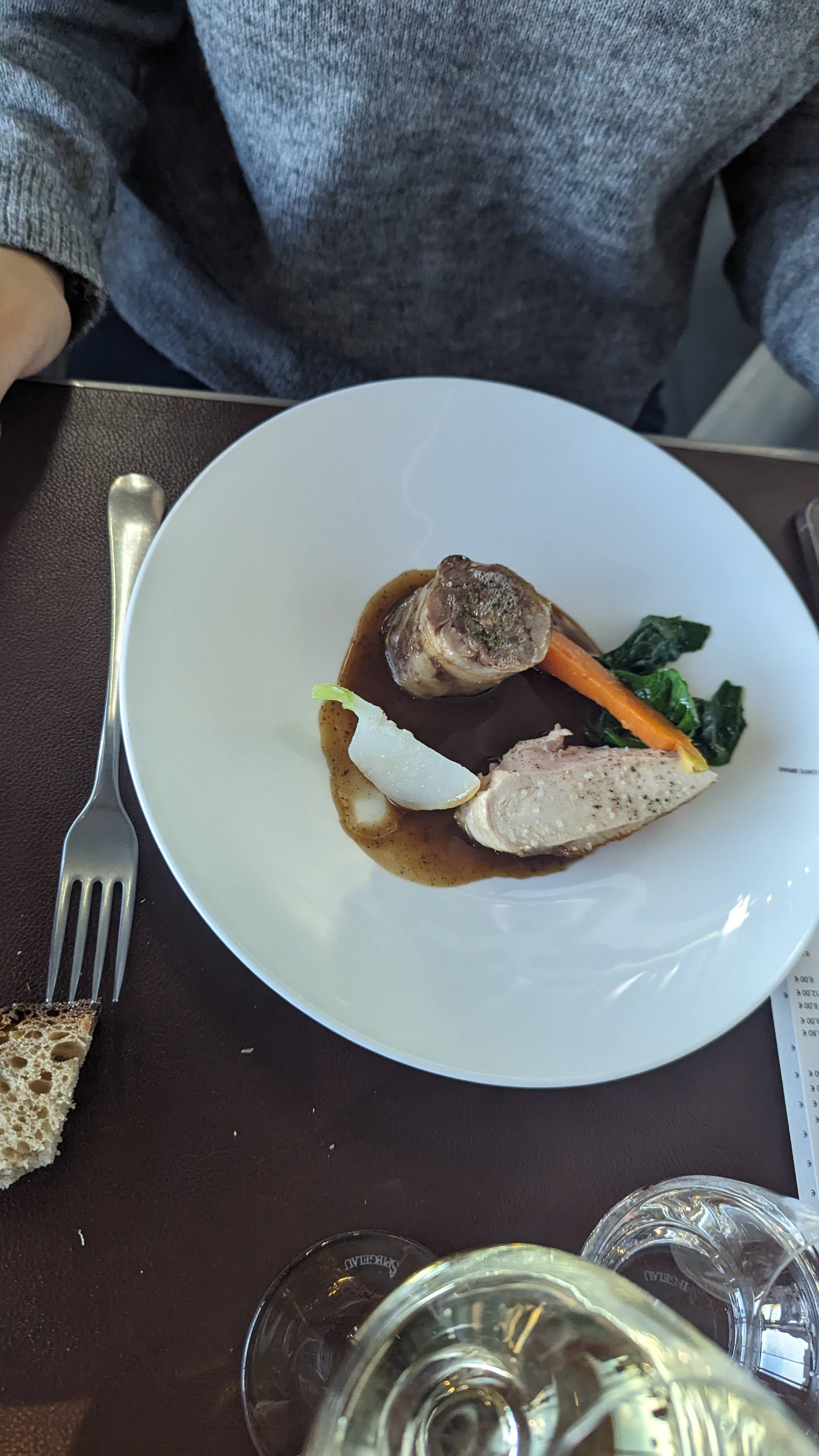 Aucune odeur ne vient flatter nos narines lorsque nous arrivons. Pourtant on voit la brigade s'agiter en cuisine, on imagine les saveurs incroyables du chou farci au chapon et du lapin rôti et farci... Et on découvre un chapon sans saveur, sans peps, rien ne vient sublimer la volaille qui aurait mérité un poivre de Sichuan par exemple. Et si c'est un peu mieux pour le lapin, ça reste très plat, rien d'inattendu ou de mémorable. Le final est beaucoup plus intéressant grâce à la bergamote mais un sablé écrasé et deux écorces d'oranges ne font pas un dessert !