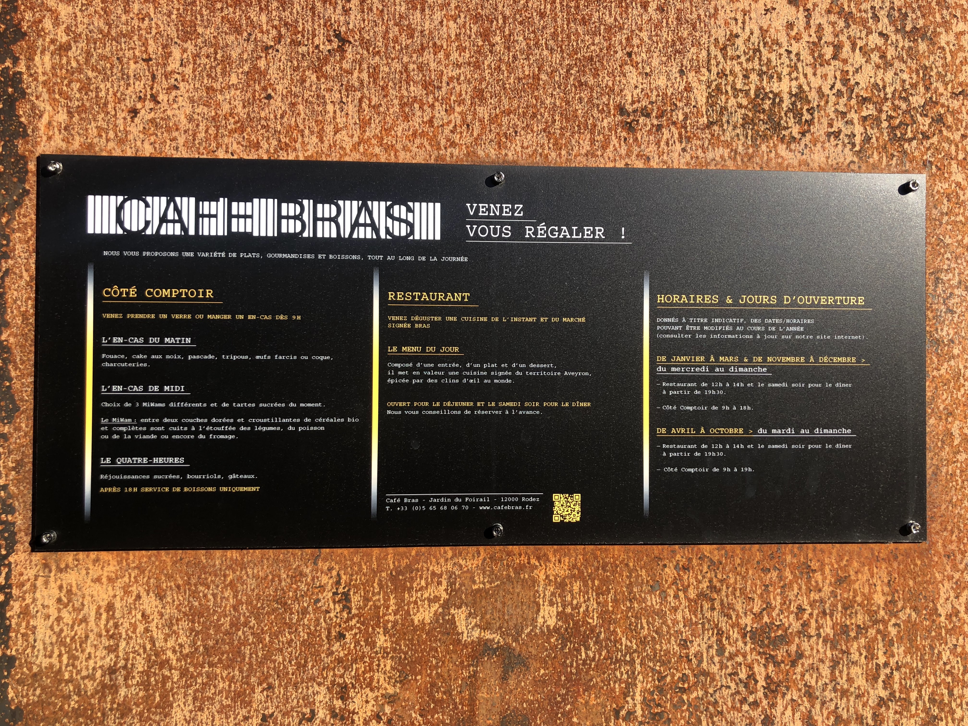 Délicieuse expérience ! Le café bras une institution à Rodez, un menu à 37 euros . Cuisine très raffinée, belle présentation Excellent rapport qualité prix Situé dans le Musée Soulages, il est impératif de réserver le WE!