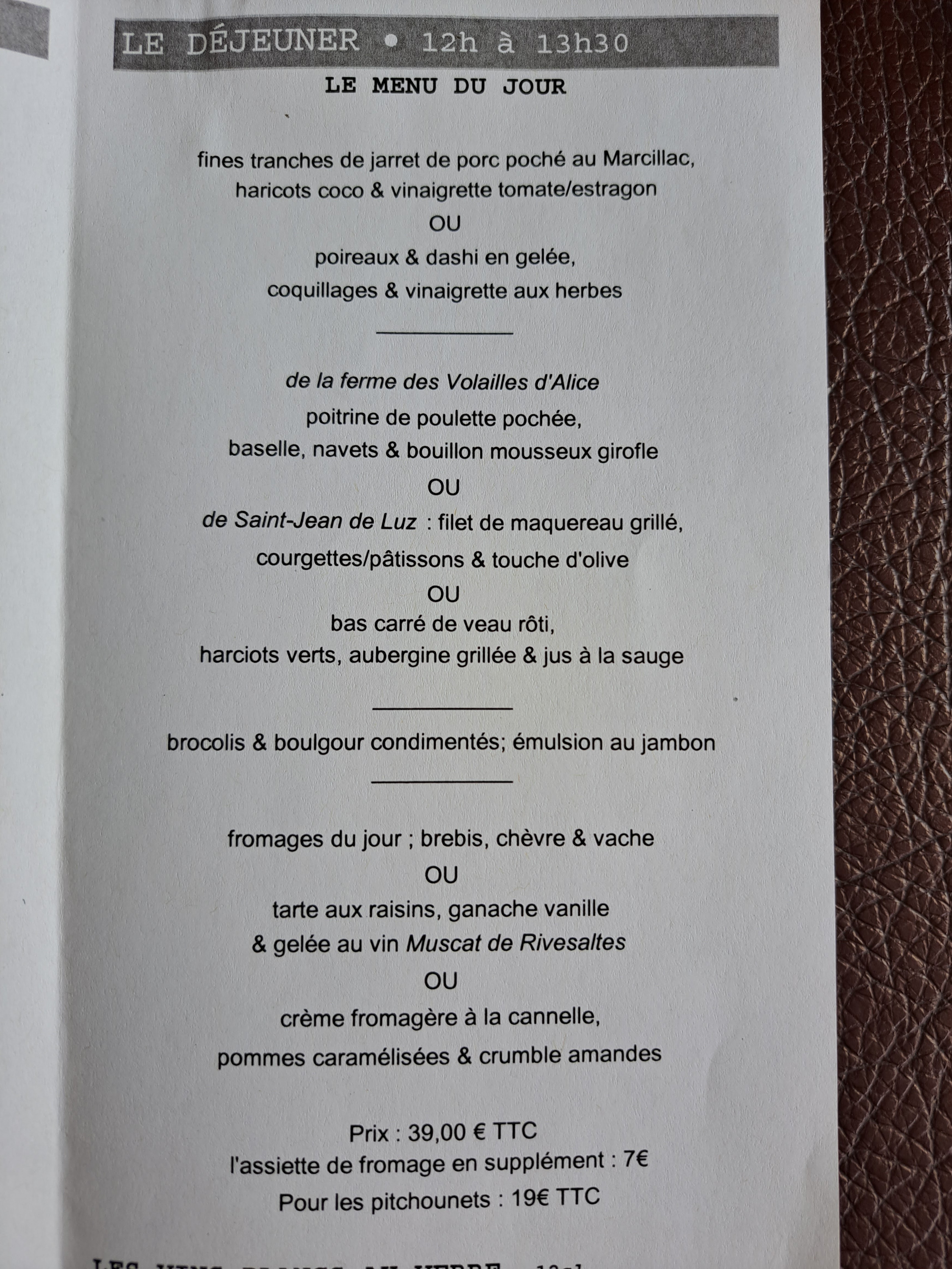 Dommage que dans un endroit de cette réputation, deux vins proposés au verre ne soient finalement pas disponibles, m obligeant à faire un choix par défaut.