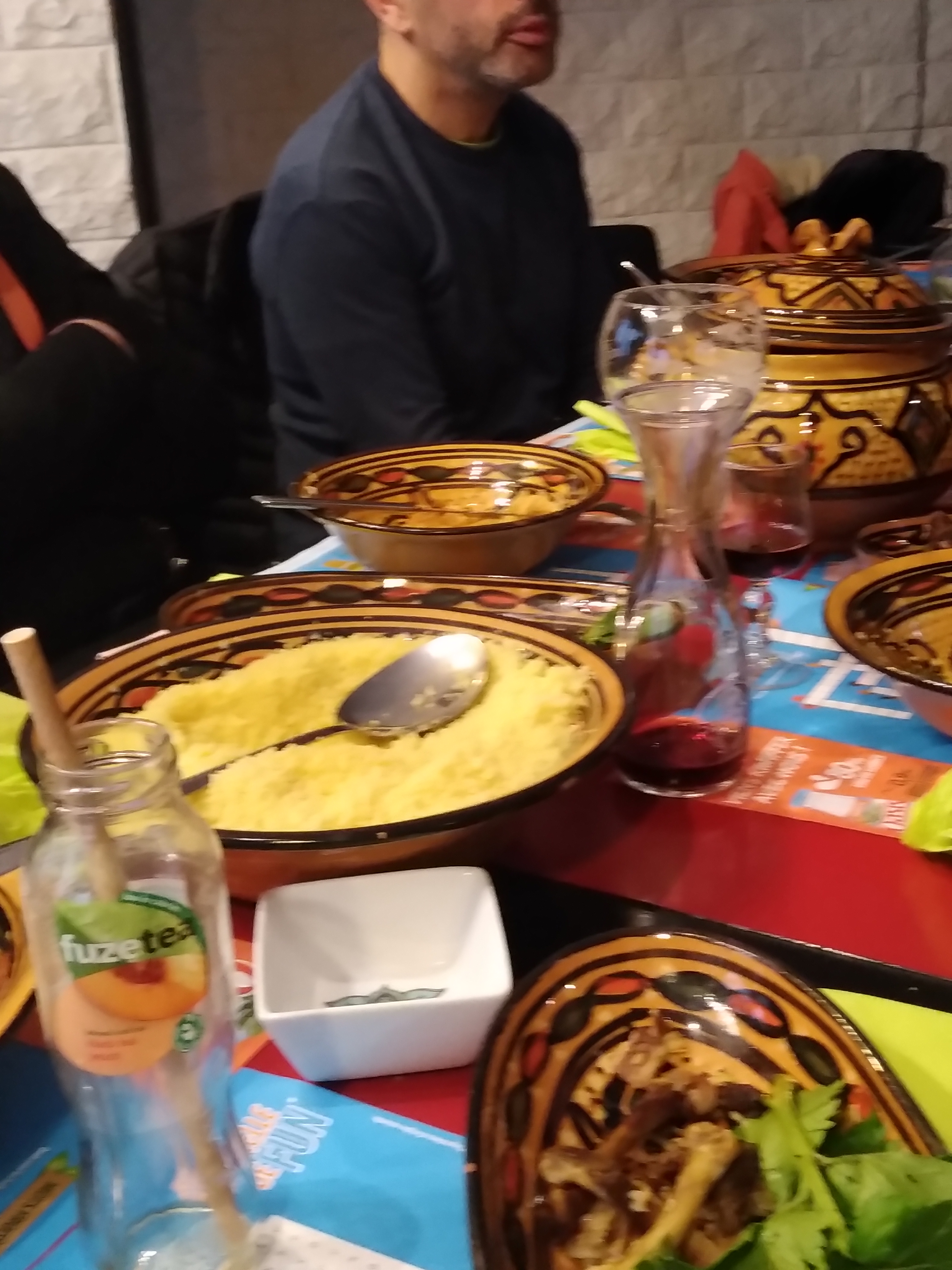 Endroit sympa,la restauration a l’air bien appréciée car il semblait que beaucoup d’habitués étaient présent. Nous avons juste pris une bière entre amis. Mais le couscous donnait envie. Le thé à la menthe est offert comme le veux la tradition au Maghreb.