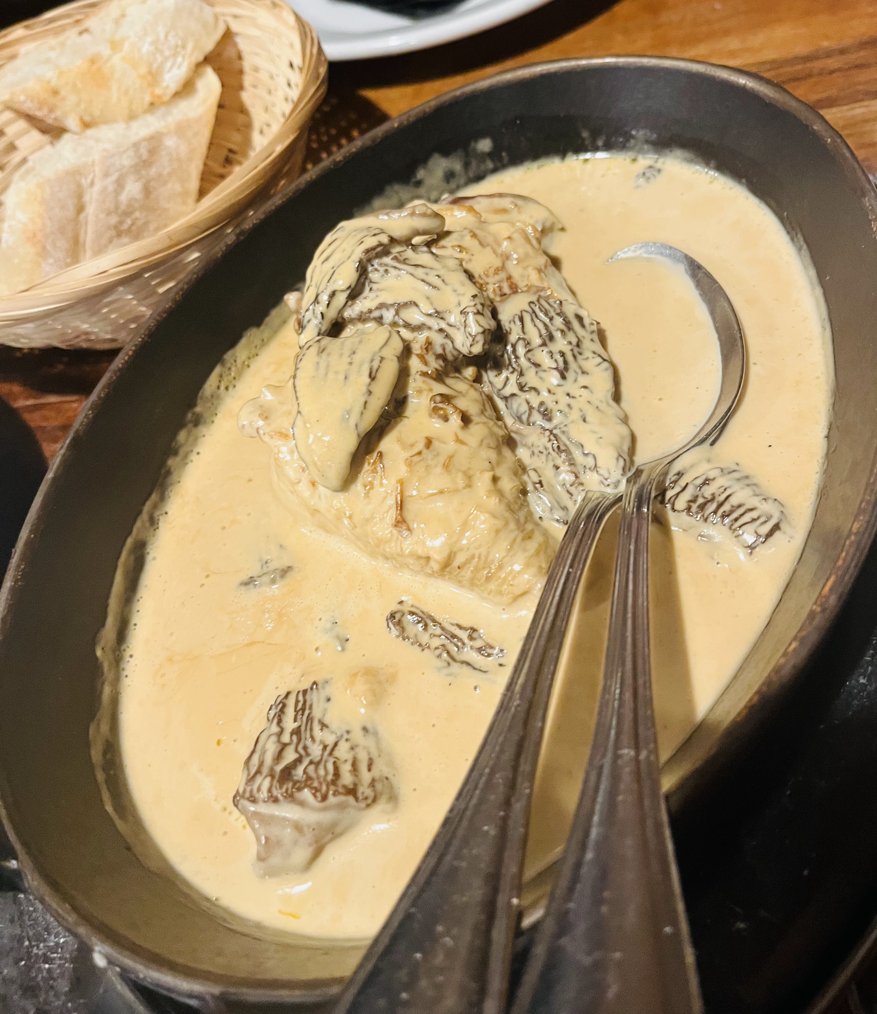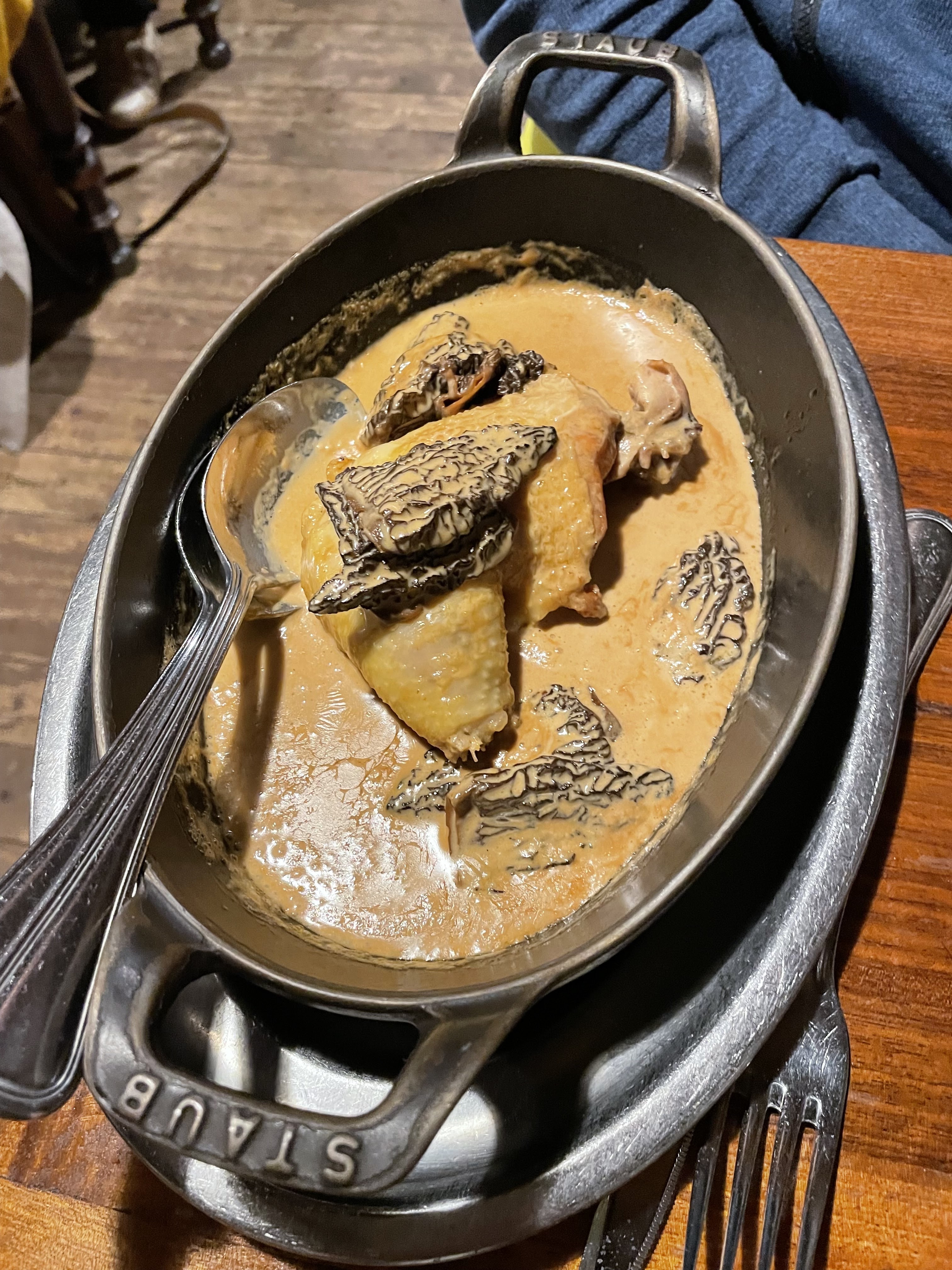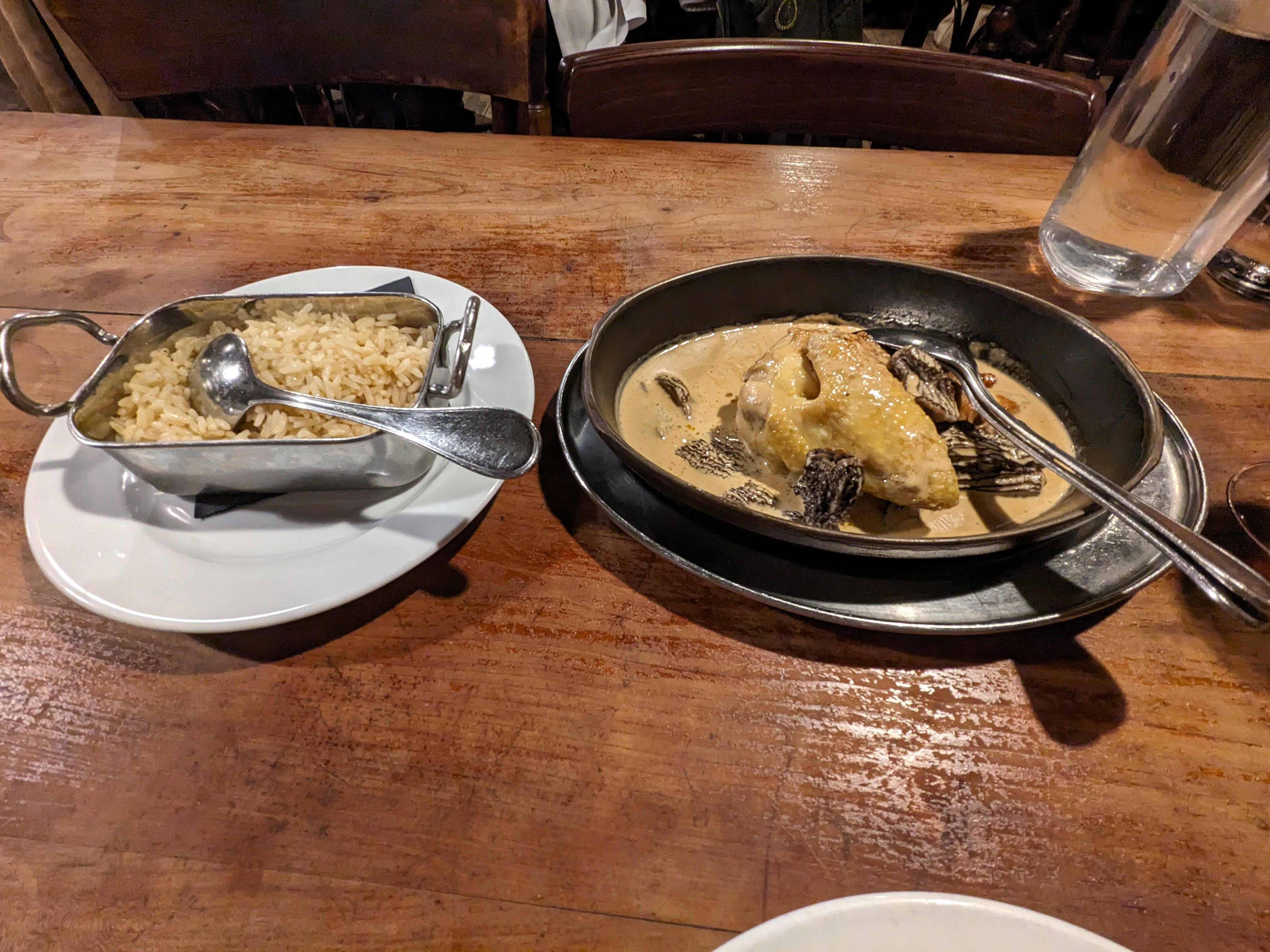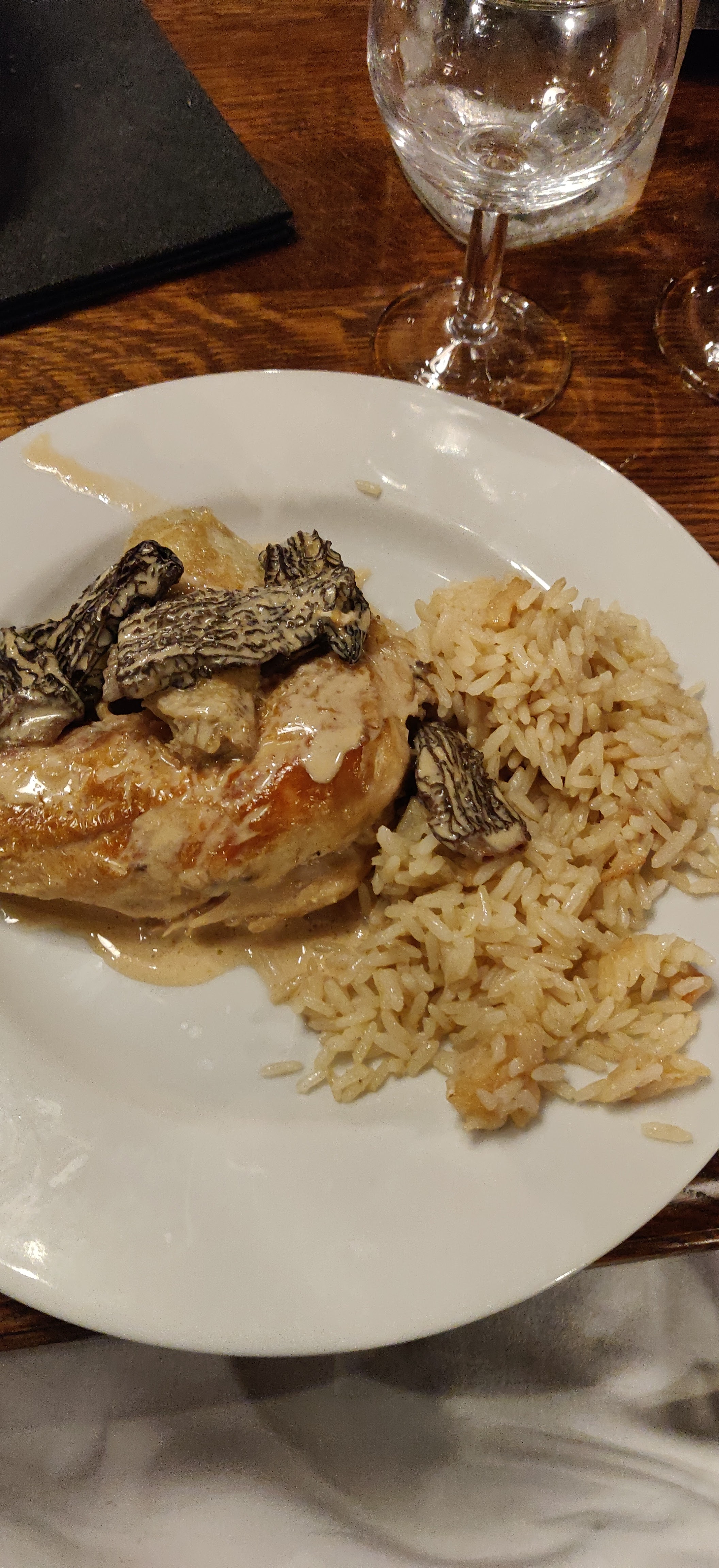 Le service et l'ambiance étaient excellents, le vin était incroyable, le poulet aux morilles aurait pu être plus savoureux (sel, poivre) mais la sauce était excellente