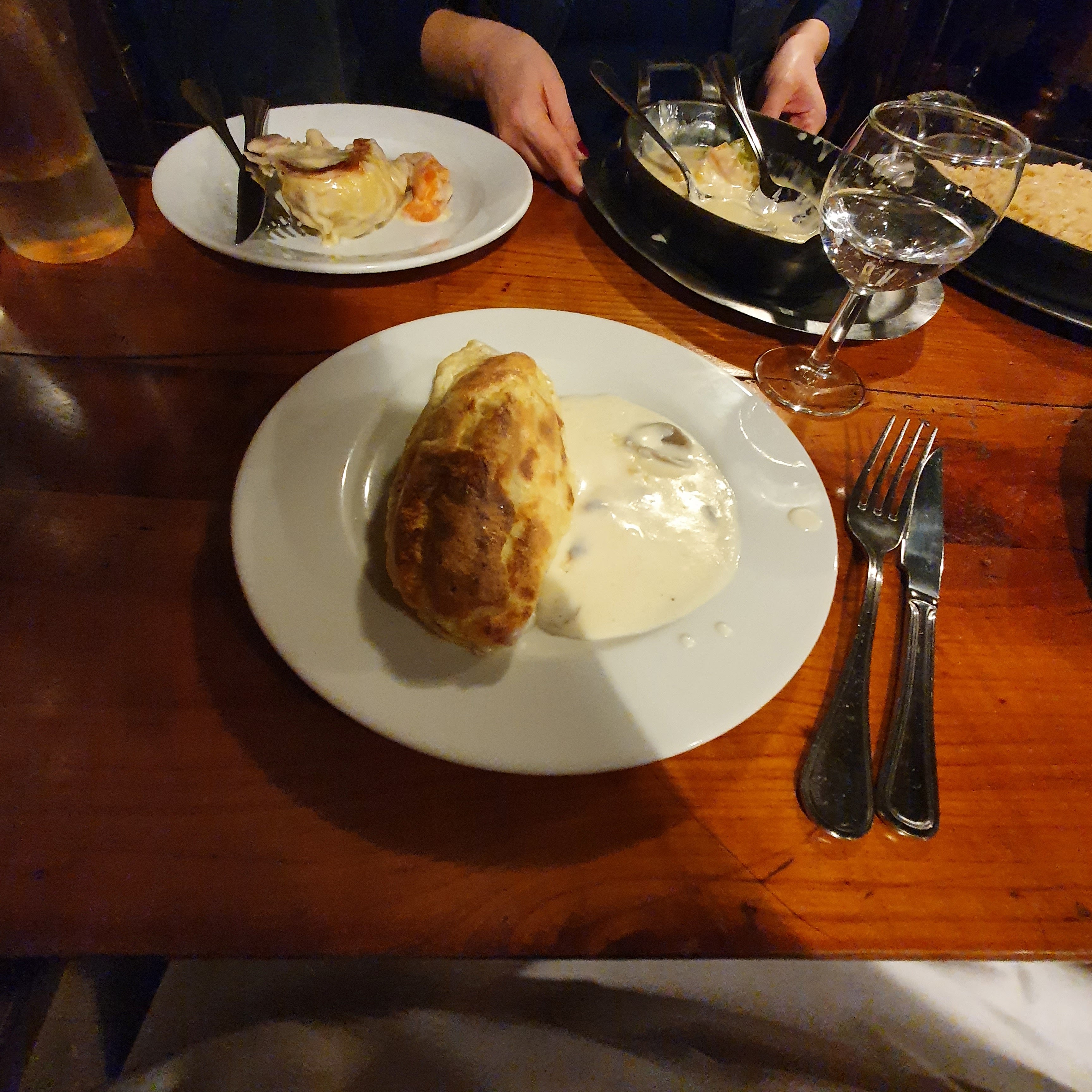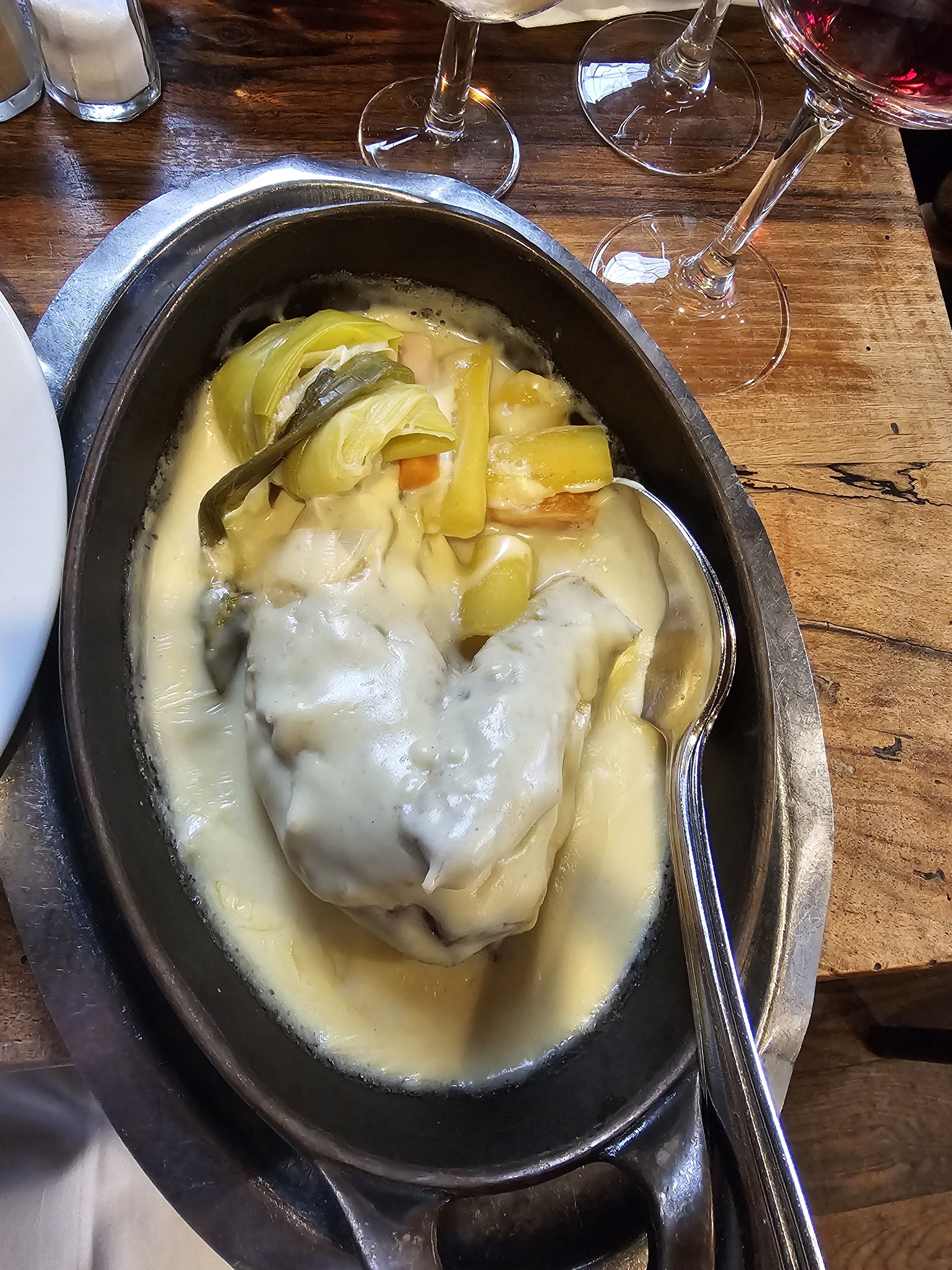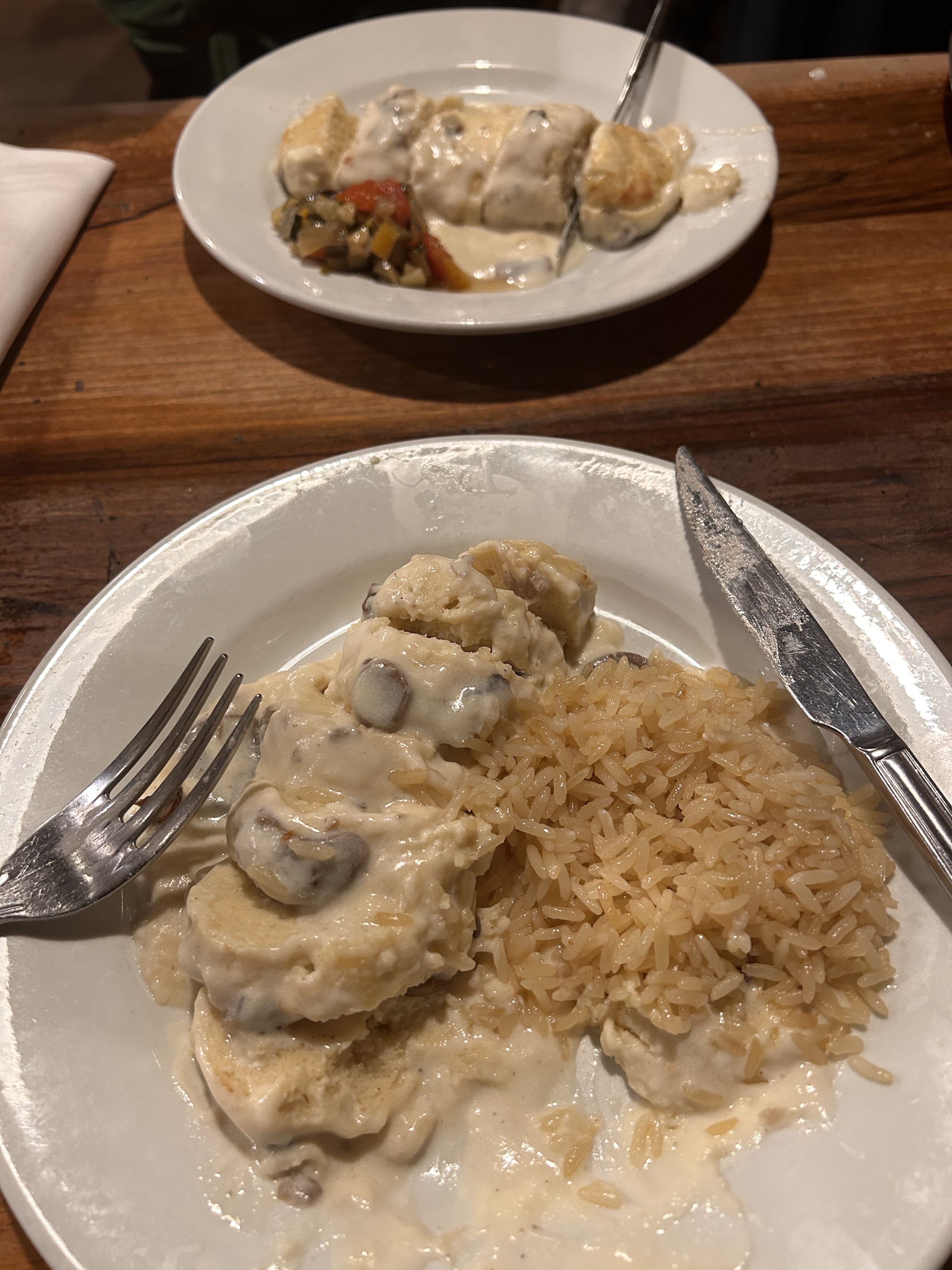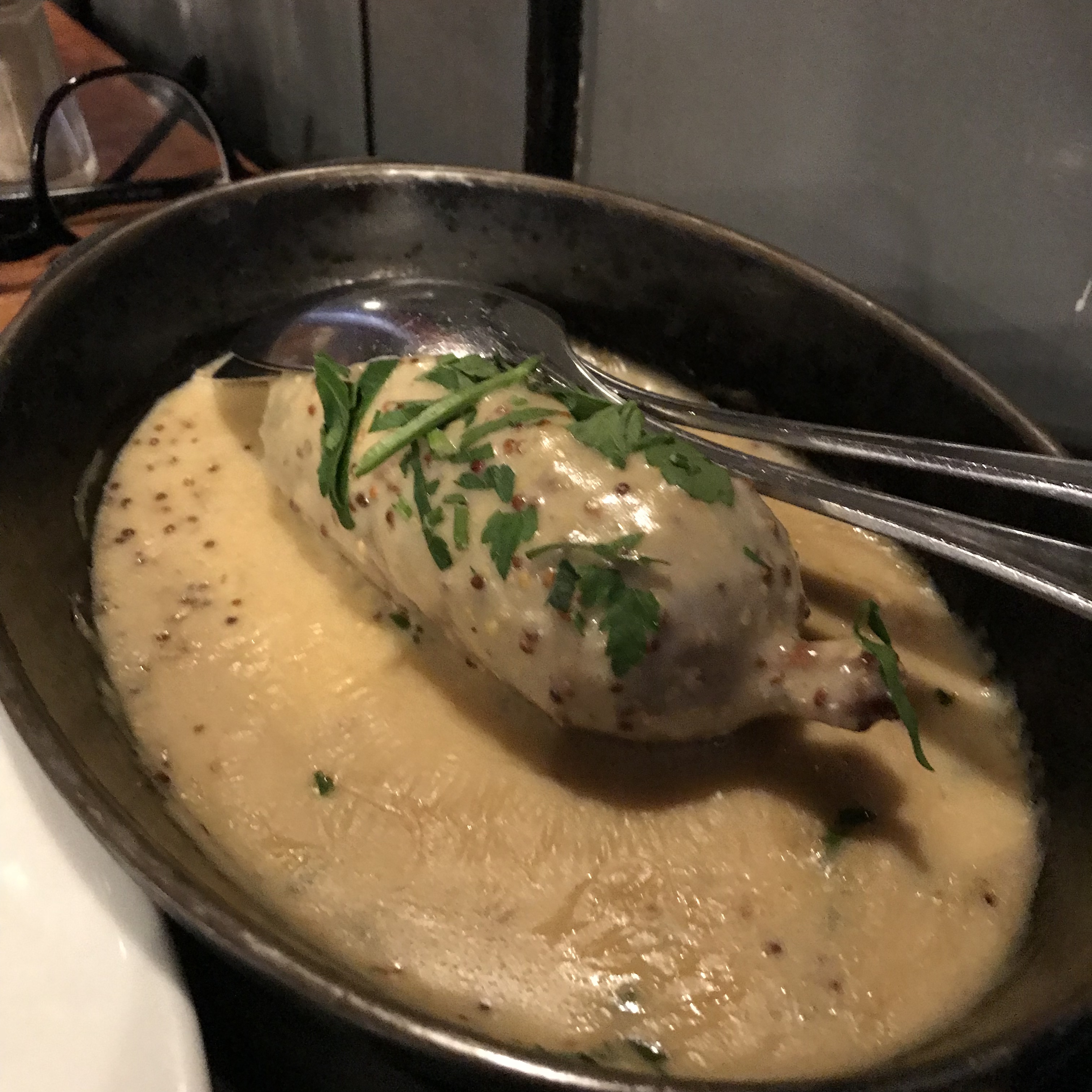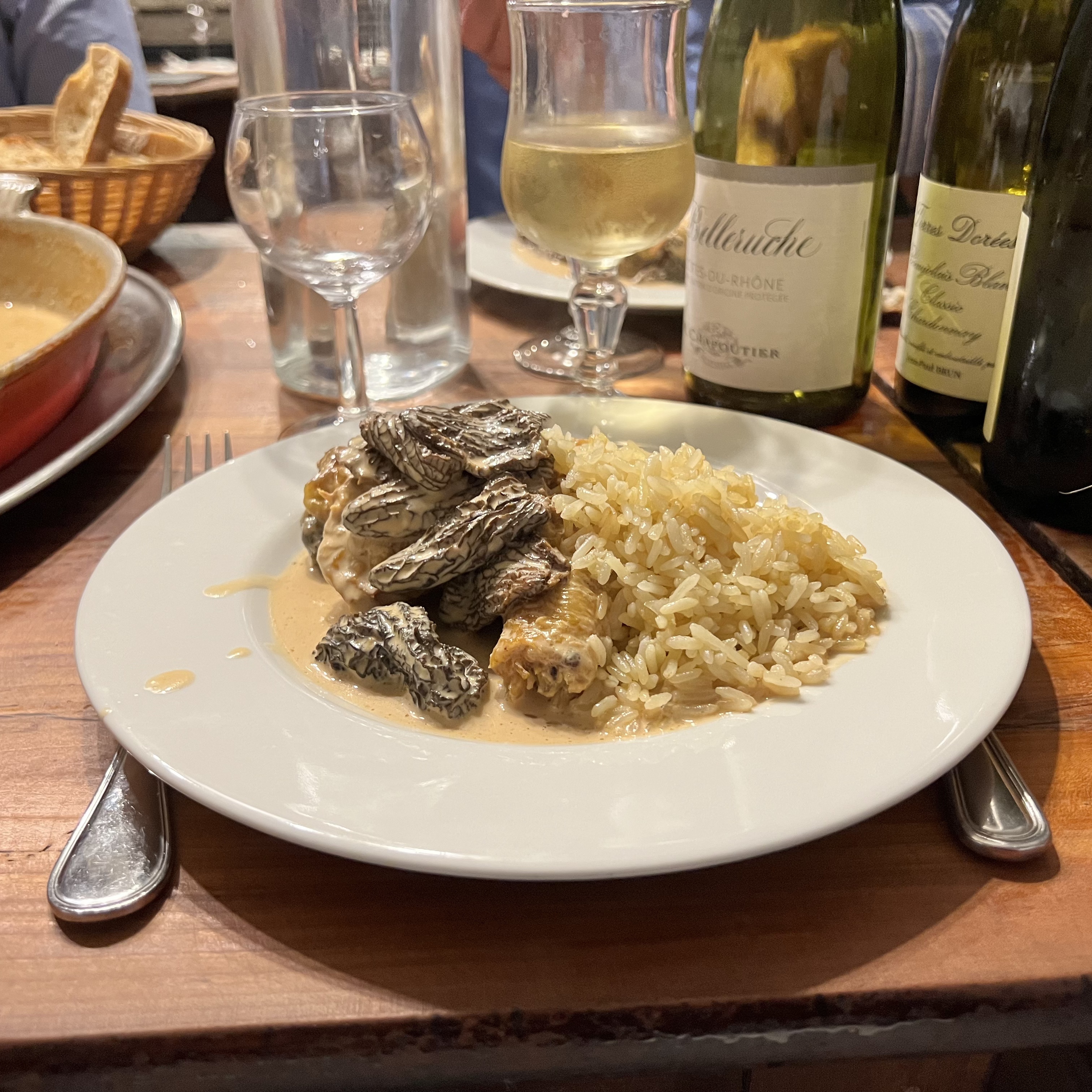 Le service et l'ambiance étaient excellents, le vin était incroyable, le poulet aux morilles aurait pu être plus savoureux (sel, poivre) mais la sauce était excellente