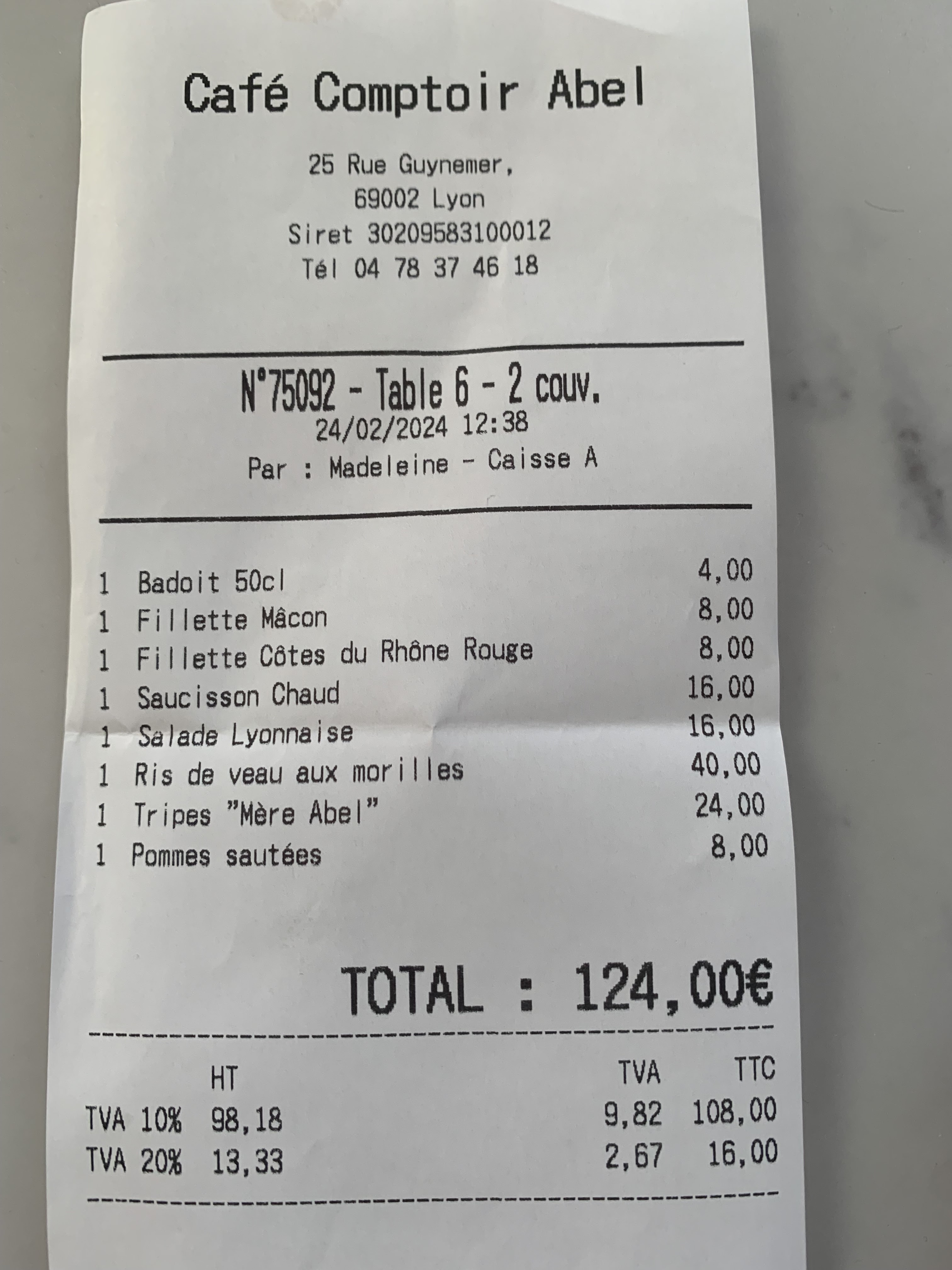 Pour notre premier bouchon lyonnais, nous ne pouvons pas être déçus, bien au contraire. Des produits d’excellente qualité, une cuisine simple au visuel, mais travaillée en bouche, un service plus qu’irréprochable, et une carte des vins variée et charmante. Nous ne manquerons pas de revenir. Merci pour ce moment !