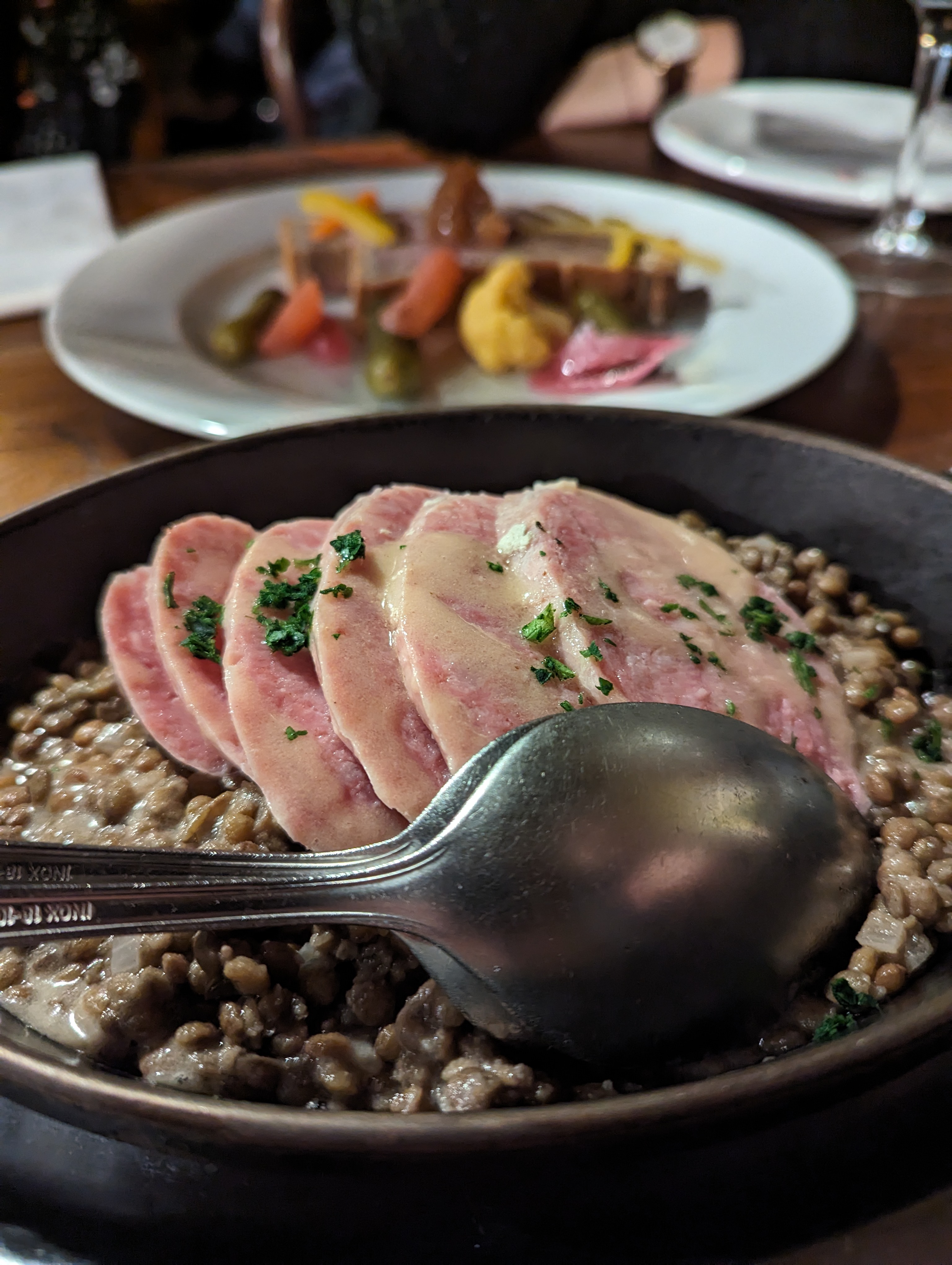 On se croirait dans un repas fait maison. Tout est bien fait et servi en grandes portions (vous n’aurez pas faim ici). Le service était sympathique et attentif à nos besoins. Nous avons opté pour le « Saucisson Chaud » aux lentilles et le « foie gras » avec des toasts en entrée avec le « tartare » et le « boudin » en plats principaux. Ils étaient tous délicieux. Ça vaut le détour. N'oubliez pas de réserver. Il y avait déjà une file d'attente lorsque nous sommes arrivés à l'heure d'ouverture.