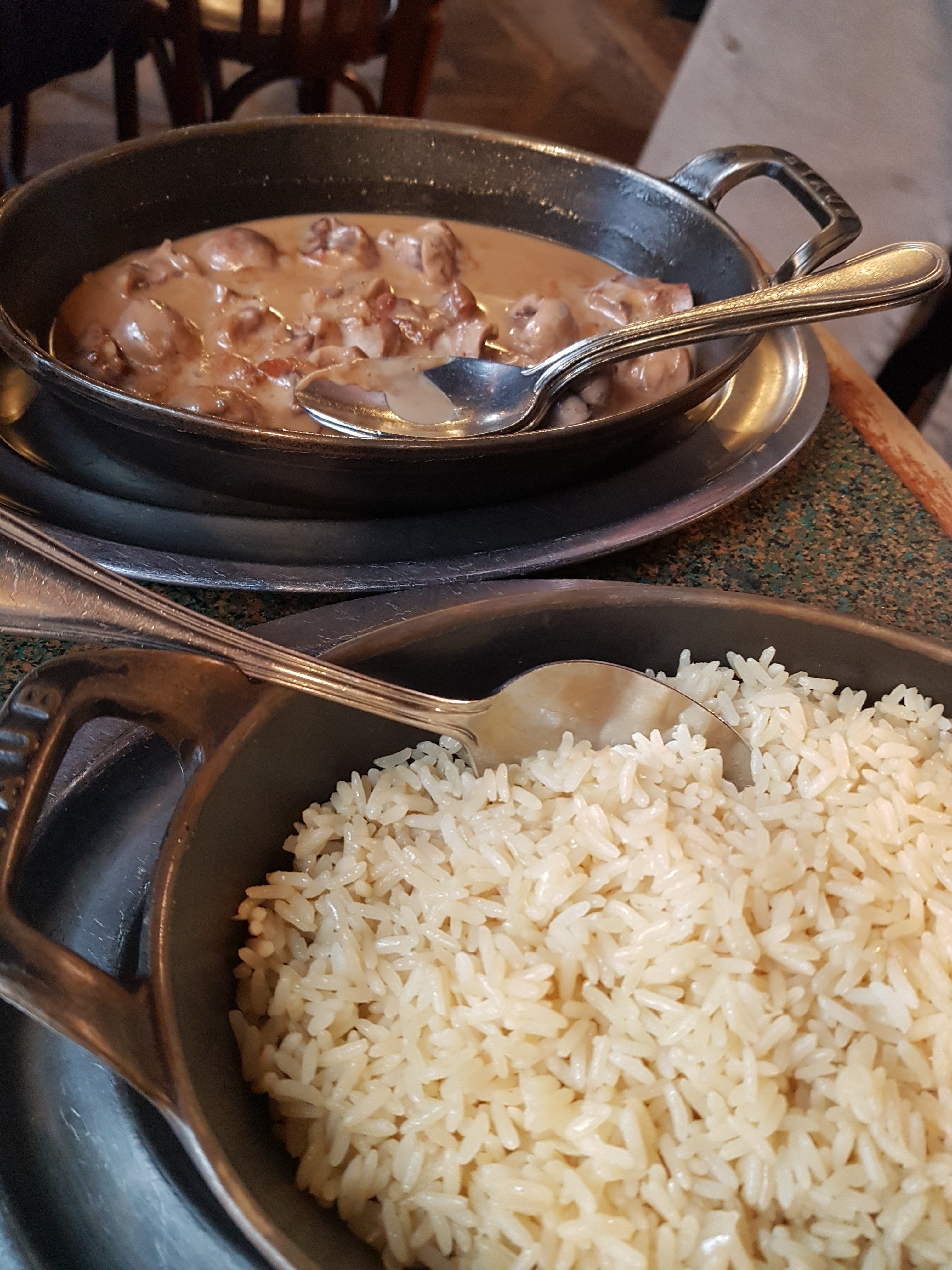Ambiance rustique, simple et très agréable. Toutes les personnes rencontrées au service avaient la même énergie attentionnée et souriante. Cuisine exceptionnelle et gourmande. Plats : foi gras et pain toasté, belle portion savoureuse et fondante. Ris-de-veau (pour deux sur ma photo) à la sauce aux morilles, à essayer absolument, cuits à la perfection avec une sauce riche qui va parfaitement avec leur riz maison. Baba au rhum servi avec la bouteille sur le côté, simple mais parfait pour finir un beau repas. Je garde cette adresse dans mon favoris pour mon prochain passage à Lyon !