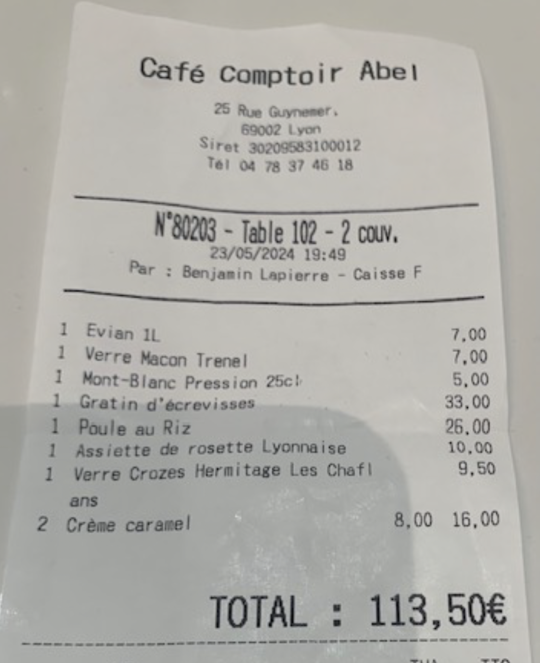 Conforme à nos attentes : un vrai bouchon lyonnais avec à la carte les plats que nous y sommes venus chercher, bien réalisés, en toute simplicité ! J’ai adoré l’ambiance du lieu et le service agréable et discret.