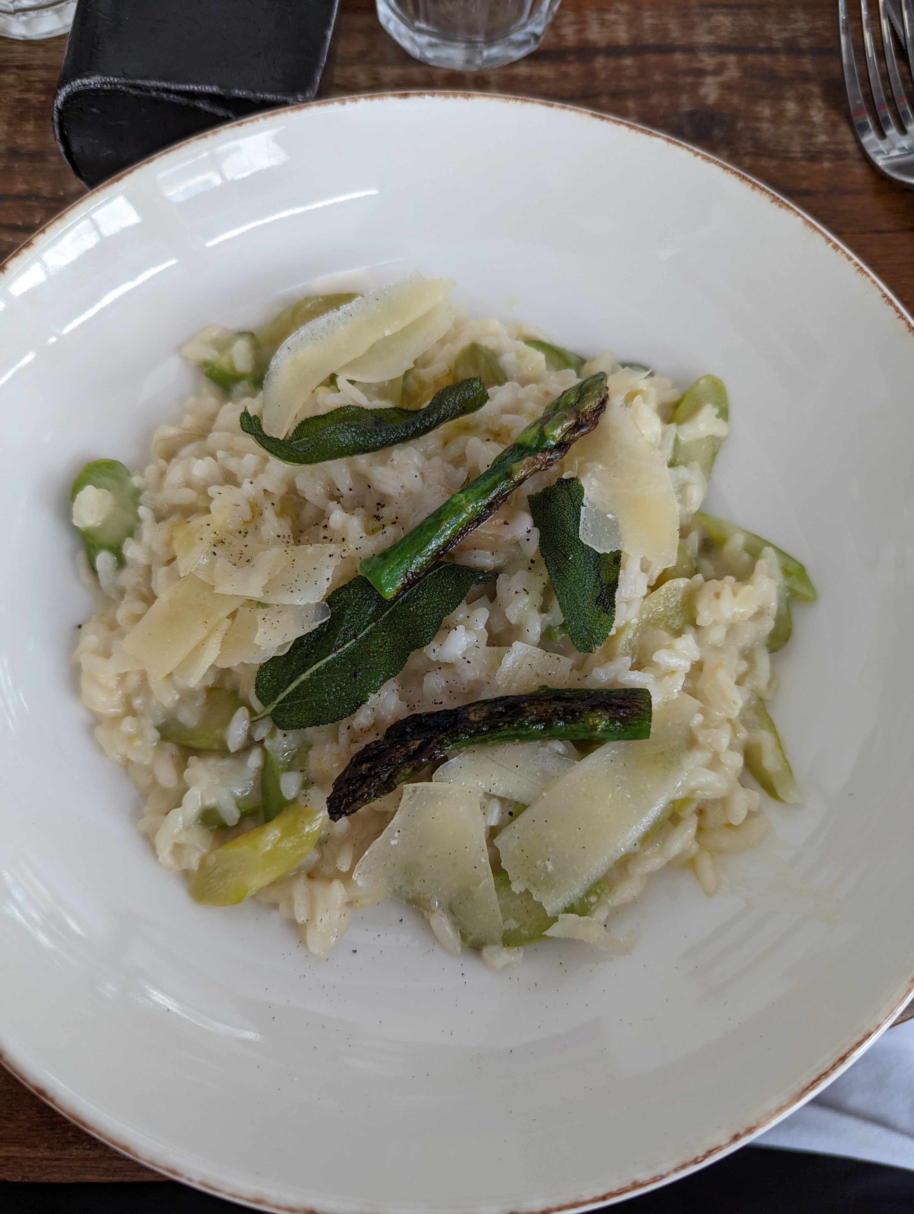 Très bonne expérience culinaire, l’œuf parfait était juste impeccable et le risotto d’asperges parfaitement cuit croquant et crémeux à la fois . Ici on paye content 🤟