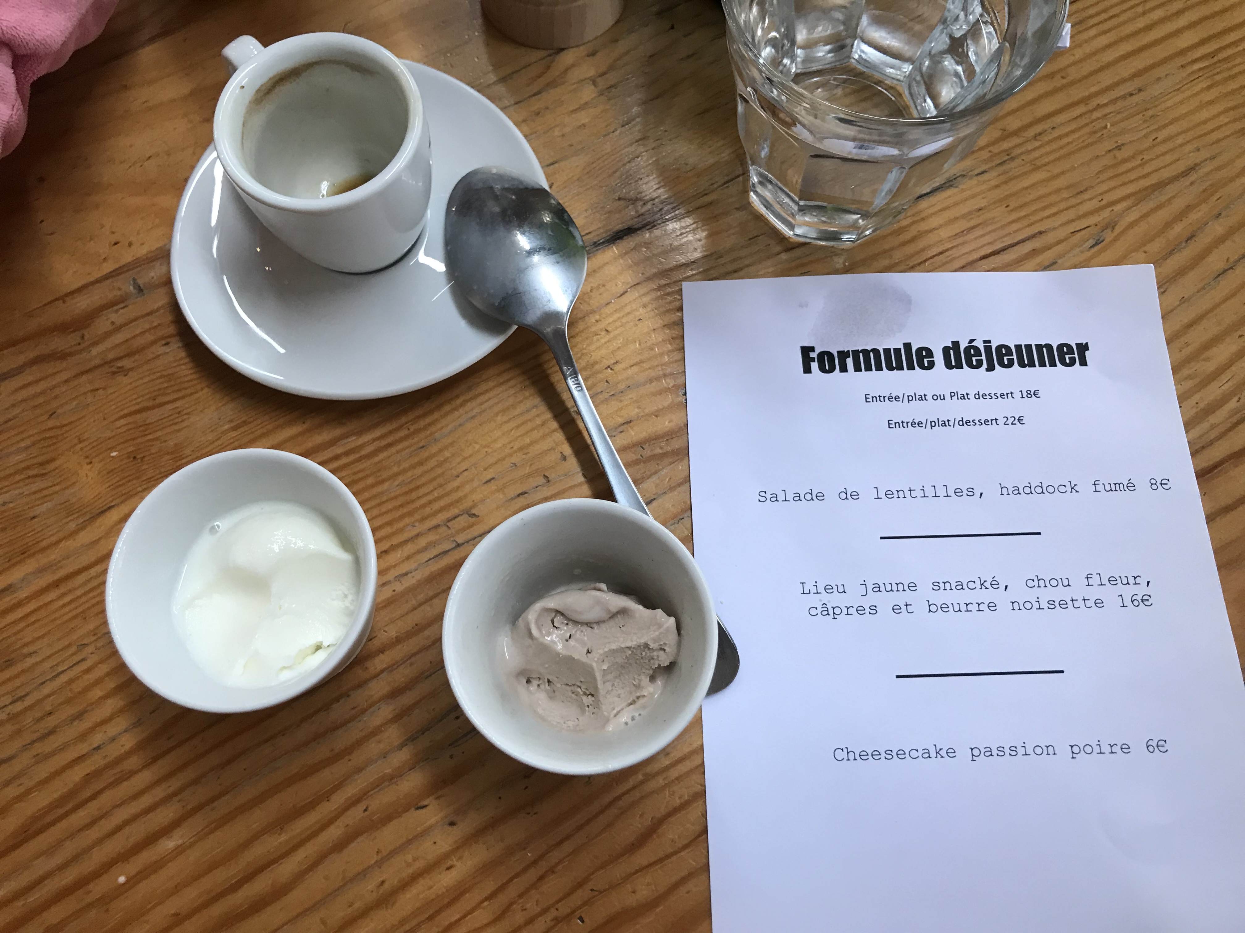 Déjeuner un samedi. 2 entrées, 2 plats, 2 desserts à la carte. Pas besoin de plus. Tout est délicieux. Service sympathique et rapide. Bravo !