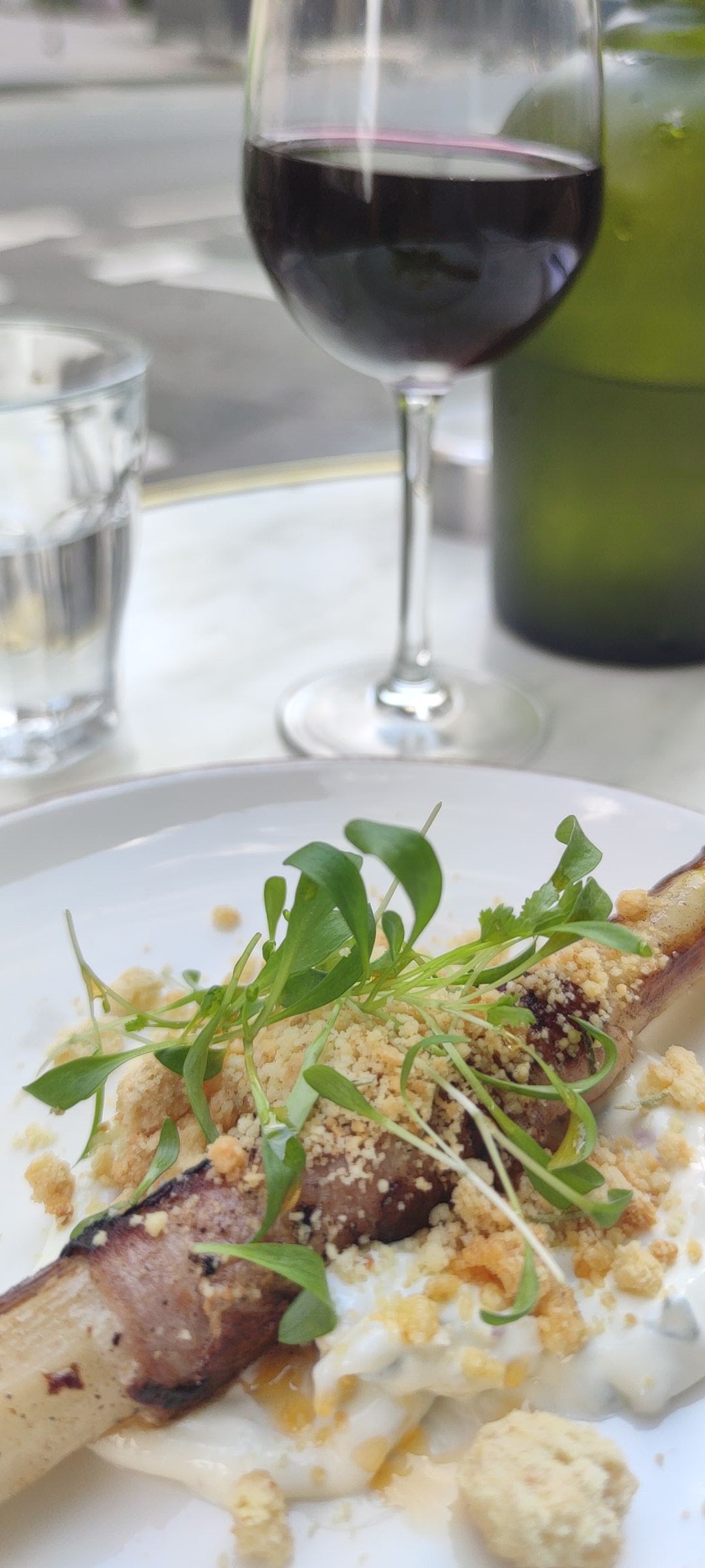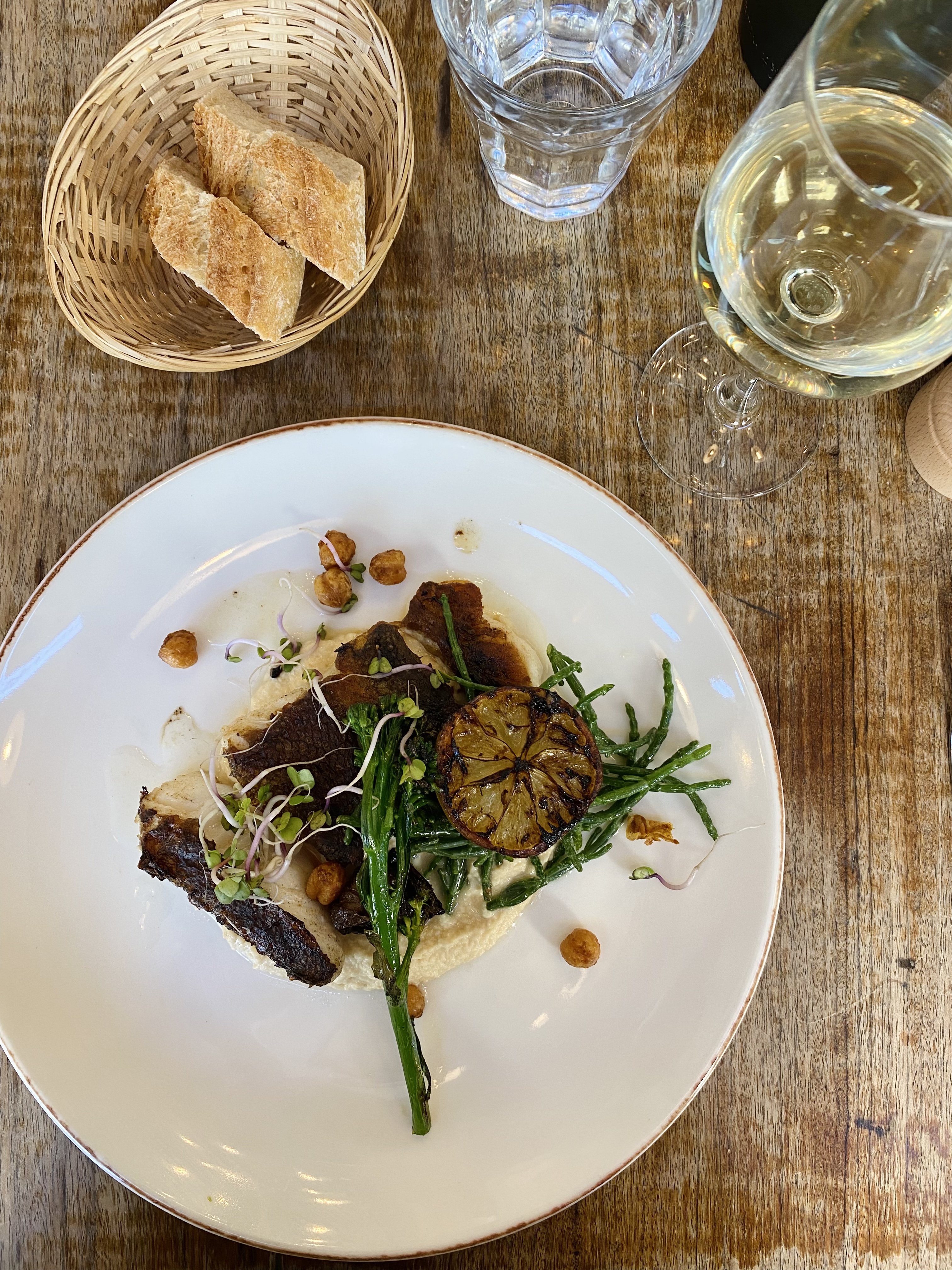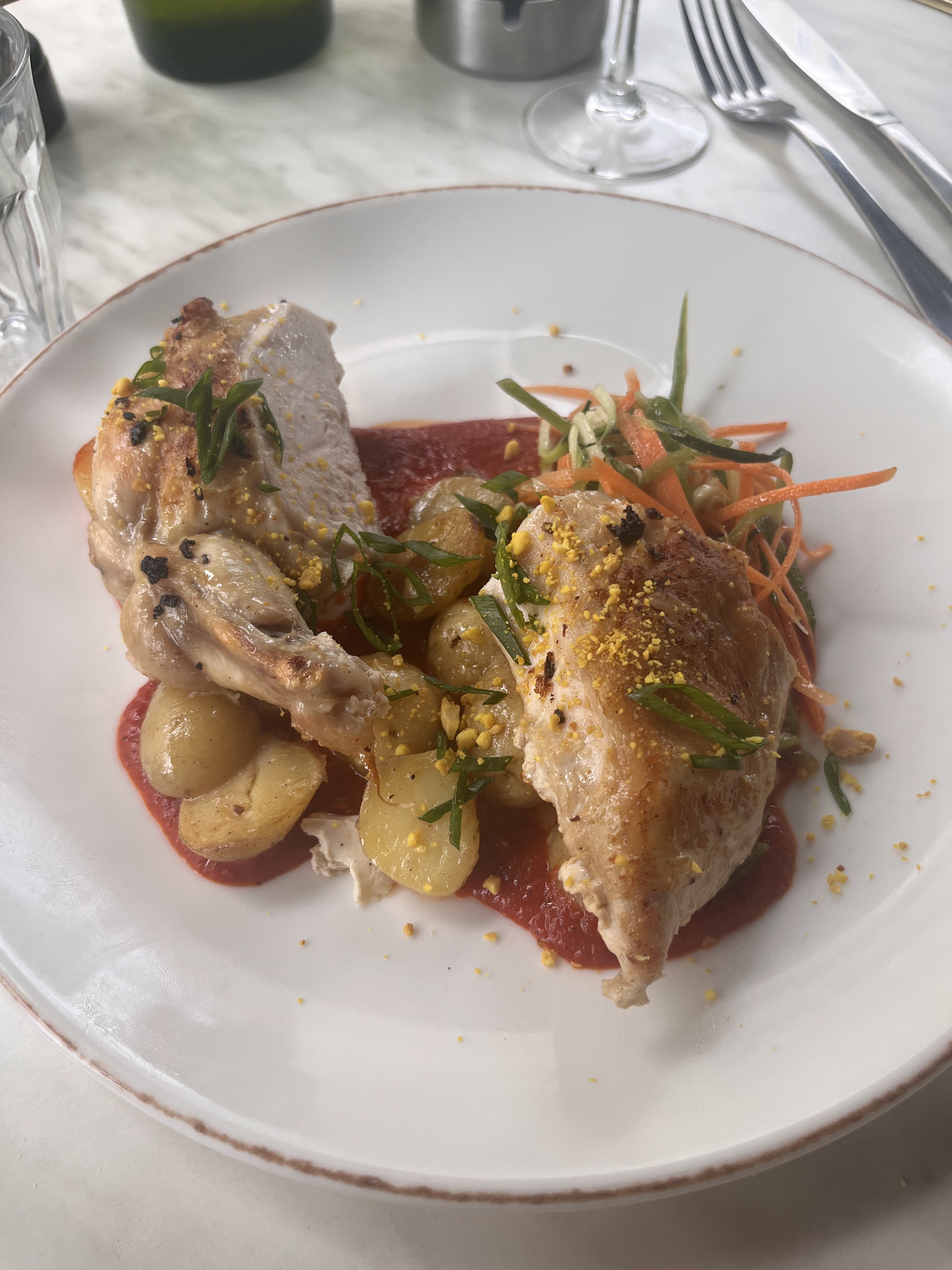Un sans faute sur la formule déjeuner. L'entrée : une asperge crocante avec un crumble romarin à tomber. Plat: gigot de porcelet et la sucrosité d'un champignon à la grecque. Dessert: riz au lait, mariage sublime entre frambroise et riz soufflé. Avec un vin de Loire exquis pour accompagner l'ensemble. Une pause déjeuner comme on les aime.