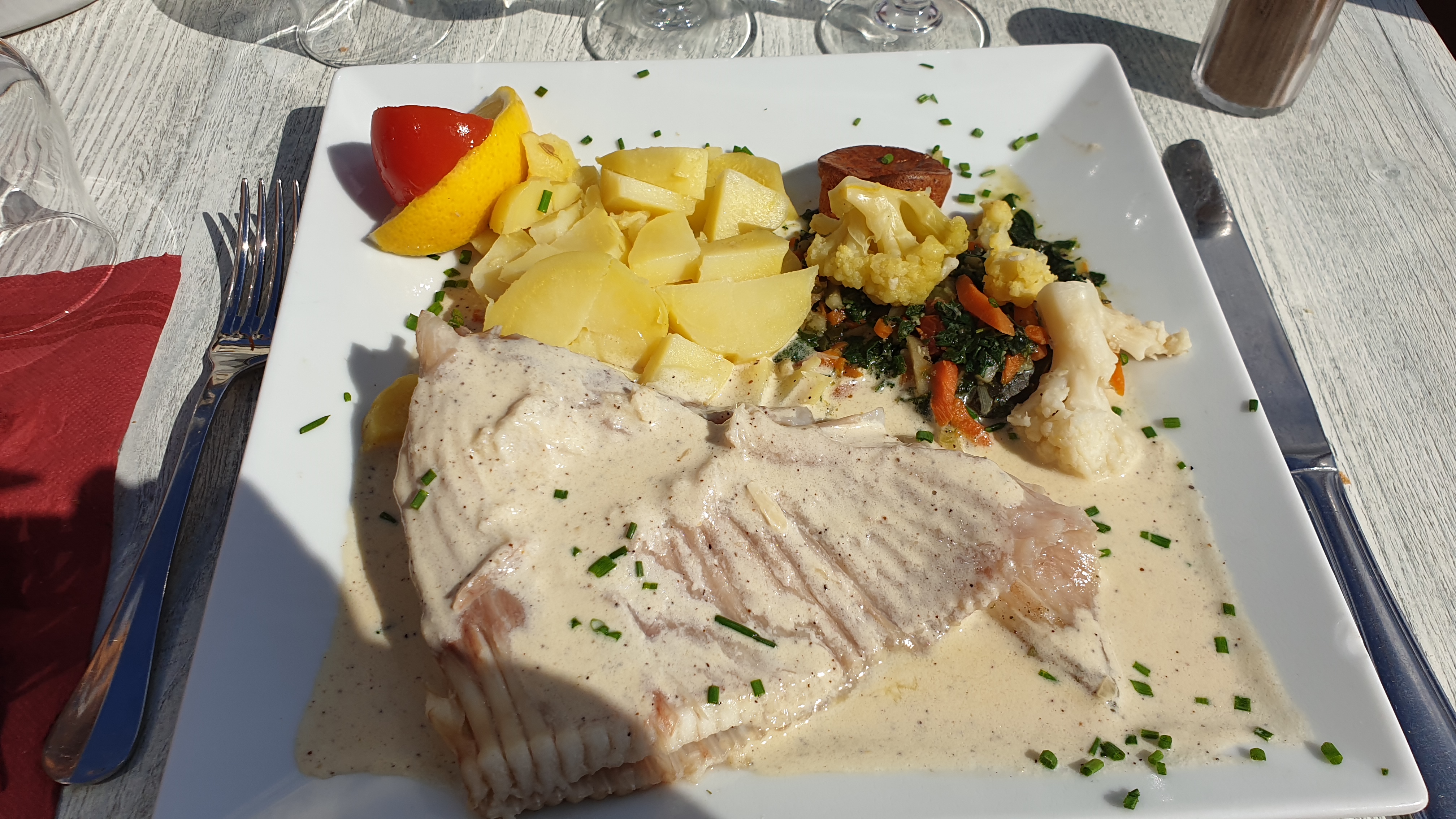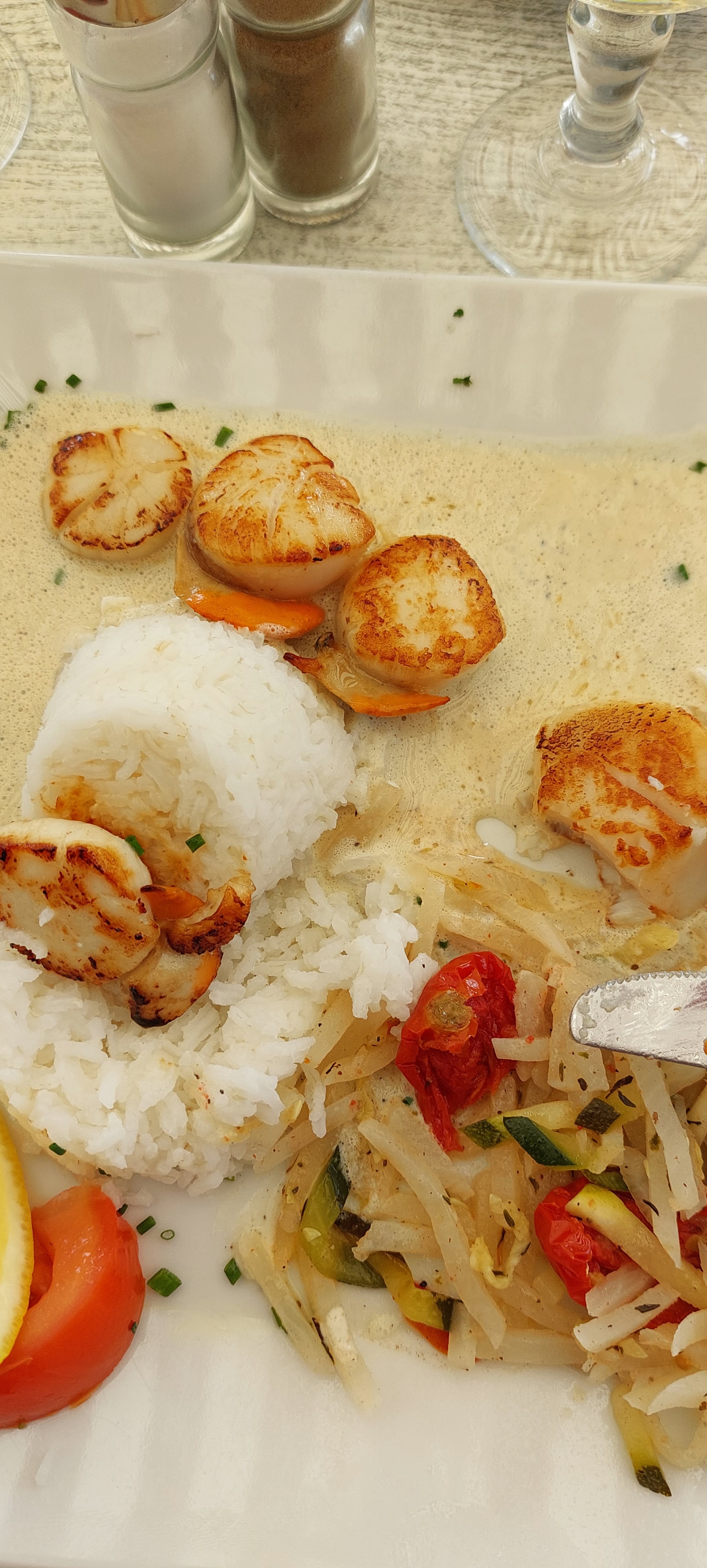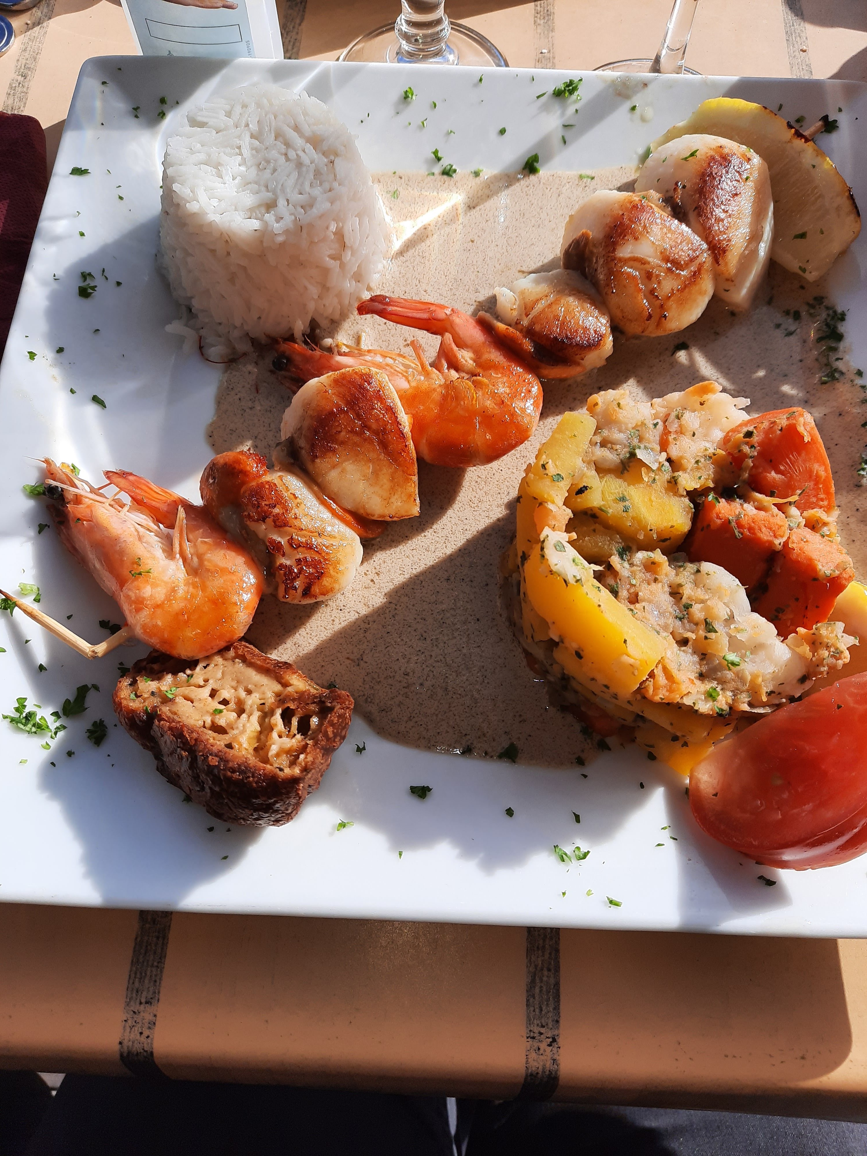 Juste : trop bien ! Typique, autant pour le bâtiment que pour le type de clientèle atypique sorti tout droit du film Les seigneurs. Rapport qualité prix : très bien. Produits frais, produits du terroir, cuisine de qualité. Ce restaurant a une âme. On y est bien. Je recommande +++. Parking : facile. Situation : sur le port, au bord de l'eau. Sur la photo - pardon, j'ai mangé trop vite !! - Poêlée de St Jacques avec des petits légumes et du riz... Délicieux ! Mon mari et ma fille ont choisi la dorade à la crème de Saint Jacques... Tout était parfait, même les desserts maison !!!
