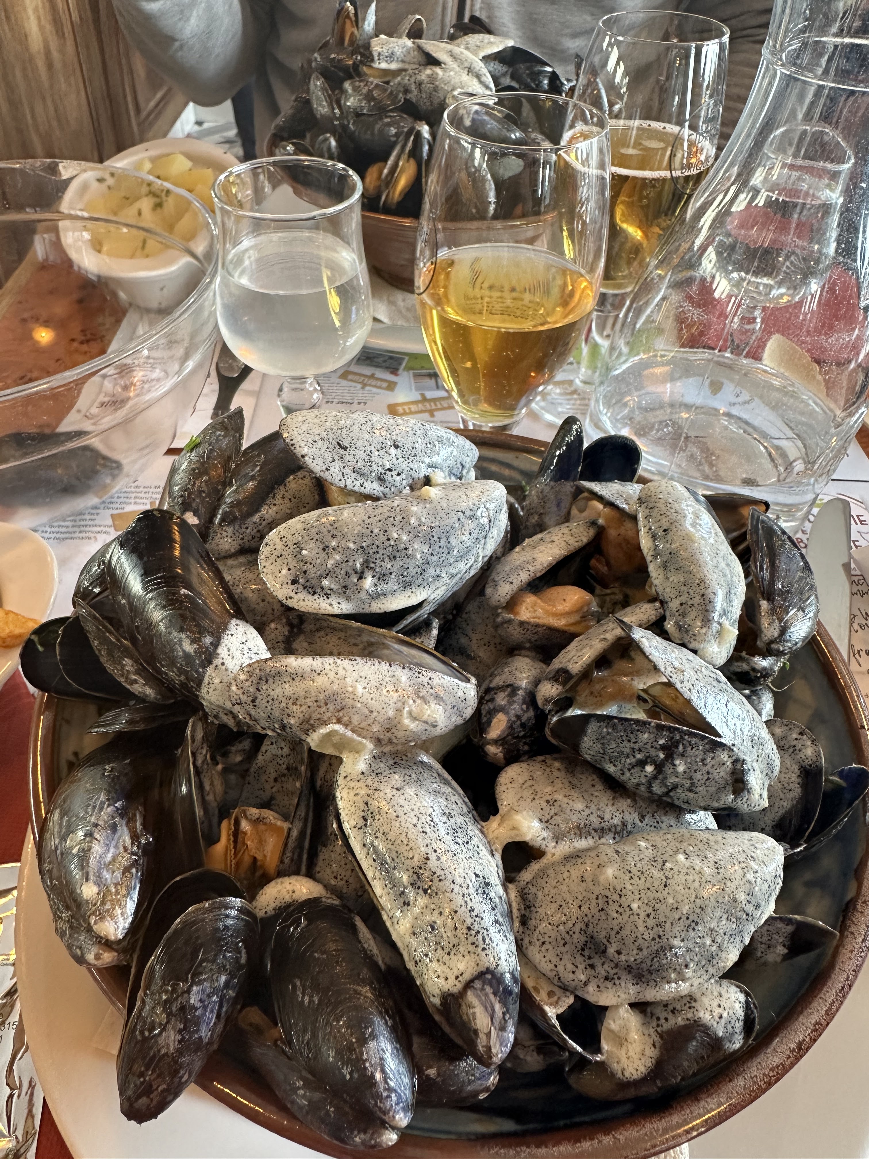 Expérience très décevante ! Nous sommes 2 randonneuses arrivées avant 14h Accueil très peu chaleureux, nous avons attendu près de 20minutes avant de voir arriver un serveur peu aimable (la moindre des choses amener tout de suite une carafe d'eau) Chaque serveur semblait au bout du rouleau, pas un sourire Moules très bonnes mais froides Nous ne recommandons pas Nous pouvons comprendre que le temps soit plus long lors de pic d'activités mais la moindre des choses : un sourire, des explications et une carafe d'eau