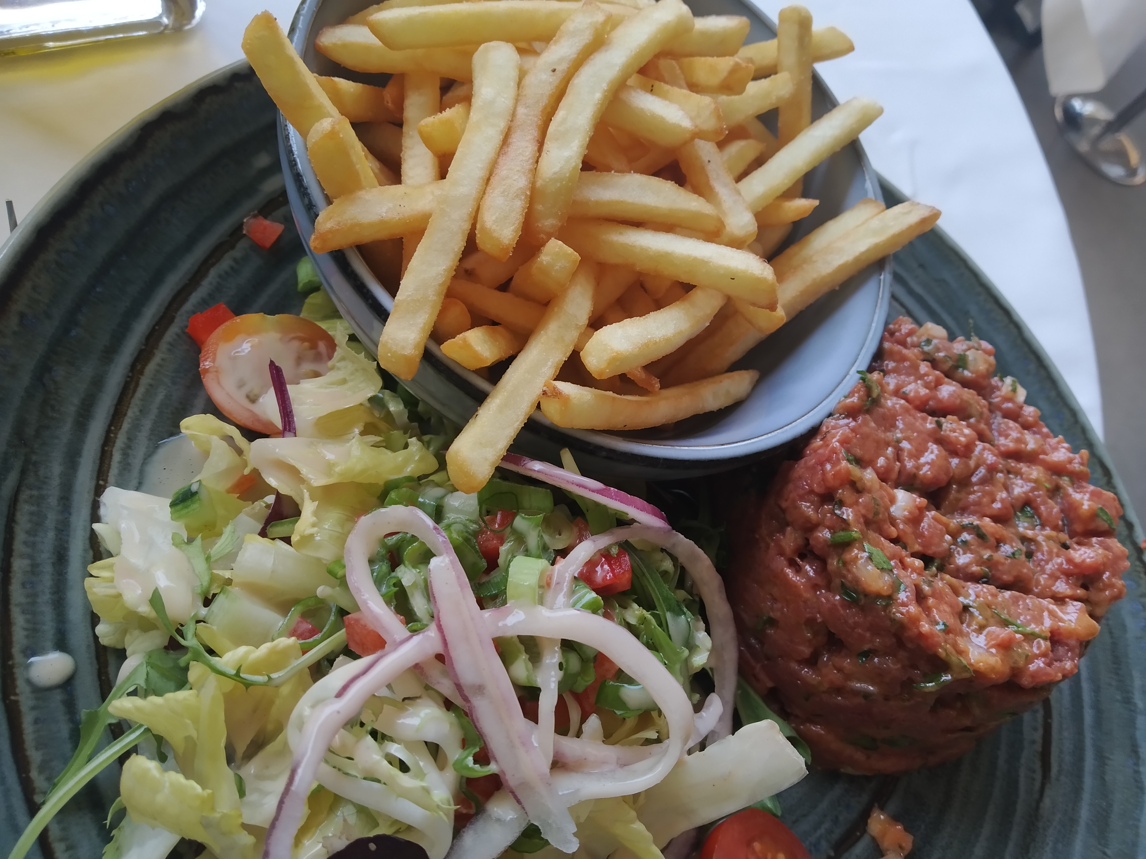 Mehr Schein als sein. Nach aussen gediegen. Man wird platziert! Vorspeise der Gattin Muscheln in Kräutersud. Sehr lecker! Meine Vorspeise: Ceviche mit Weißfisch. Sehr viel Luft nach oben, viel Füllmaterial (Eisbergsalat), bisschen Tomate, bisschen Gurke und pinke Grapefruit. Wasser mit Gas: 8 € / 0,75l. Auch heftig! Dann aber mein Hauptgang: Entrecote mit Frites und Pfeffersauce. Fleisch medium bestellt, es kam innen roh (bleu), nicht gewürzt, die Pfeffersauce geschmacklos. Und das für 35 €! Geht garnicht! Als der Kellner nach dem Essen fragte, wie es geschmeckt hat und ich ihm es erklärt habe, kam außer Schulterzucken nichts! Keine Entschuldigung, keine Reduktion der Rechnung oder ein Getränk auf Haus! Leider keine Empfehlung! Plus d'apparences que de réalité. Solide à l'extérieur. Vous êtes placé ! Entrée pour la femme Moules au bouillon aux herbes. Délicieuse! Mon entrée : ceviche au poisson blanc. Beaucoup d'air vers le haut, beaucoup de matière de remplissage (laitue iceberg), un peu de tomate, un peu de concombre et de pamplemousse rose. Eau avec gaz : 8 € / 0,75l. Aussi féroce ! Mais ensuite mon plat principal : entrecôte avec frites et sauce au poivre. Viande commandée moyenne, elle est venue crue à l'intérieur (bleu), non assaisonnée, la sauce au poivre sans goût. Et cela pour 35 € ! Ce n'est pas possible! Lorsque le serveur a demandé quel était le goût de la nourriture et que je lui ai expliqué, rien n'est venu à part un haussement d'épaules! Pas d'excuses, pas de réduction sur l'addition ni un verre offert par la maison! Malheureusement aucune recommandation !