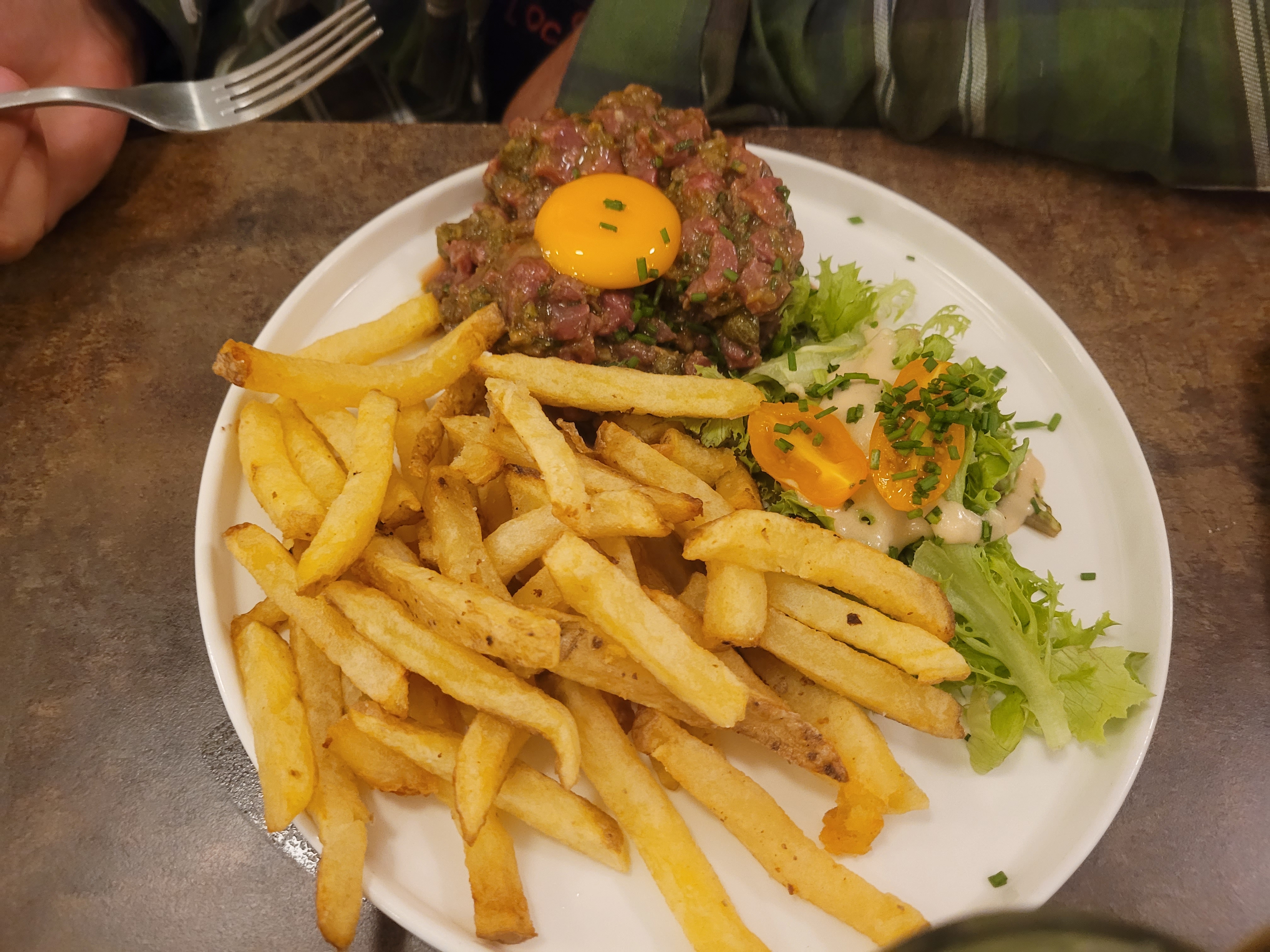 Vraiment c était parfait à tout point de vue Un tartare au bœuf très bon très copieux, avec des frites très bonnes, dommage je n avais plus faim pour la crème brûlée Mon mari a pris assiette de fromage, il était ravi À refaire et à recommander très bon restaurant