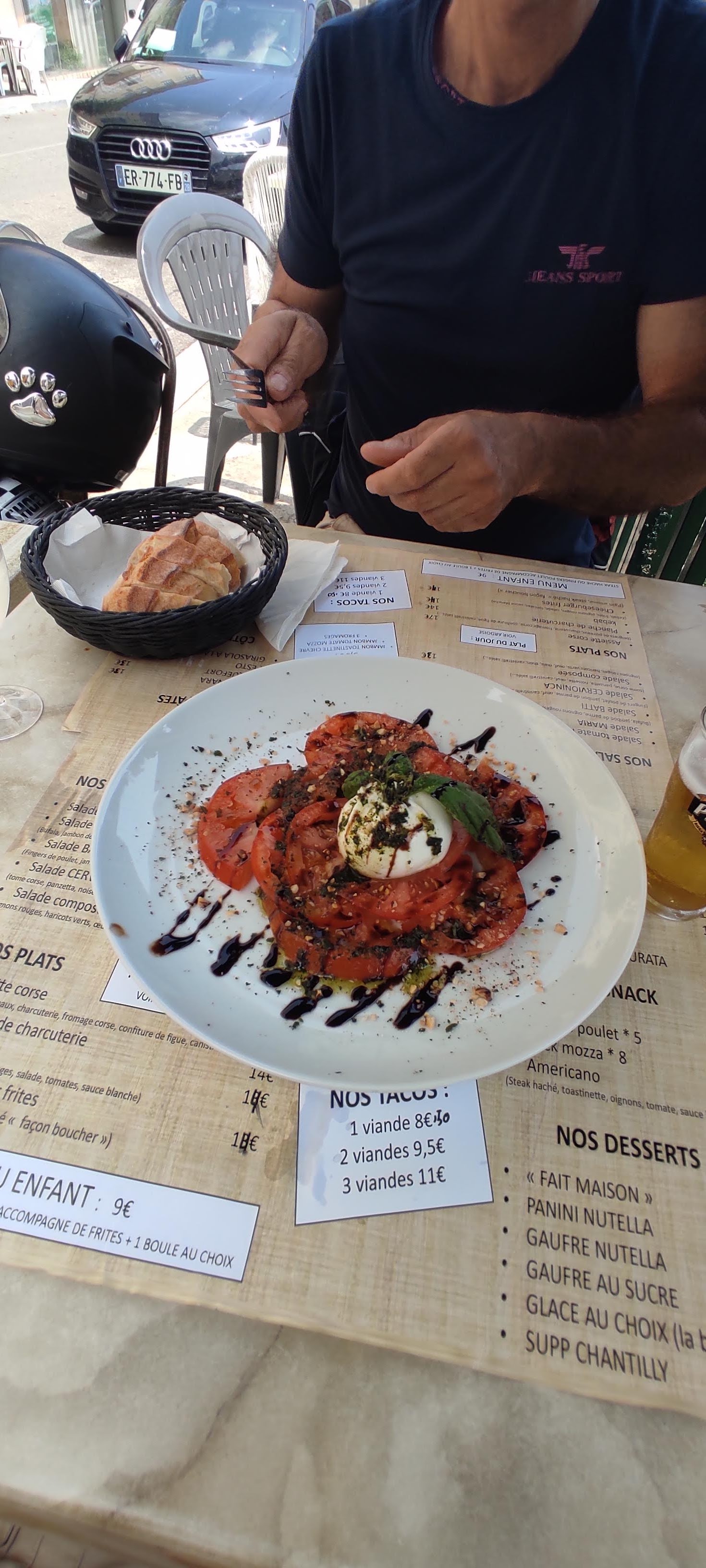De passage en moto pour déjeuner, une salade tomate et mozzarella, deux bières, une eau et un café 17€, tables dehors, vue montagne et mer !!