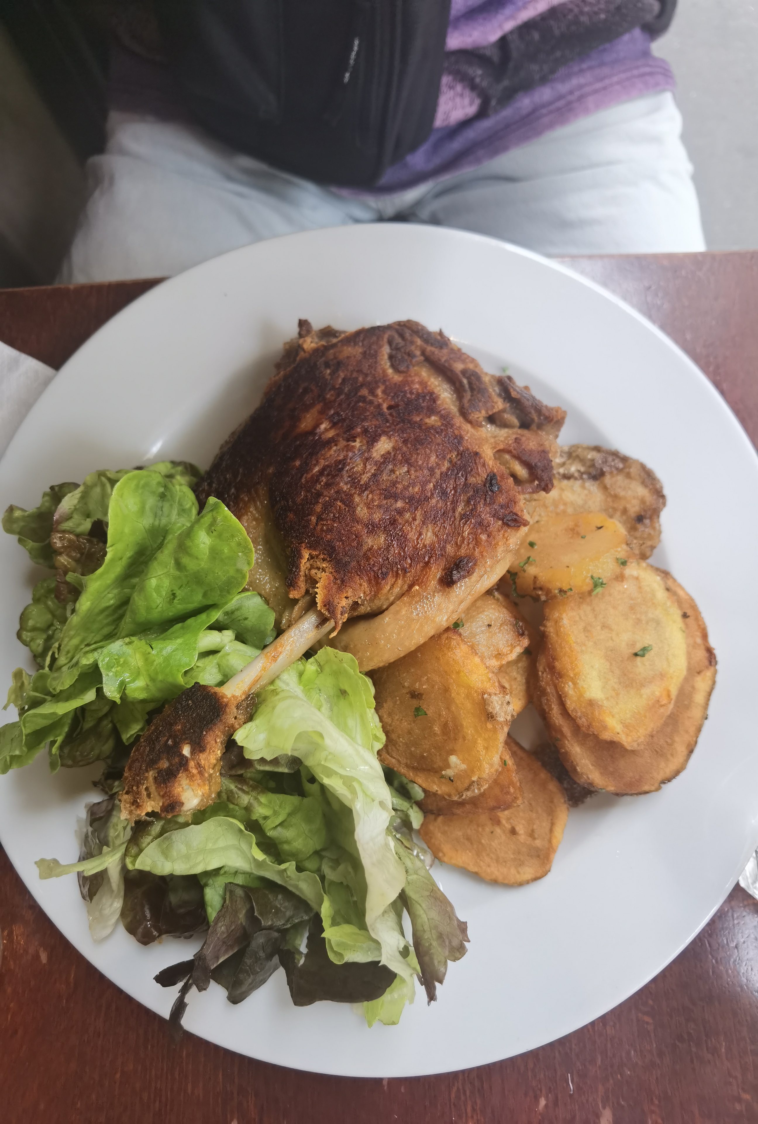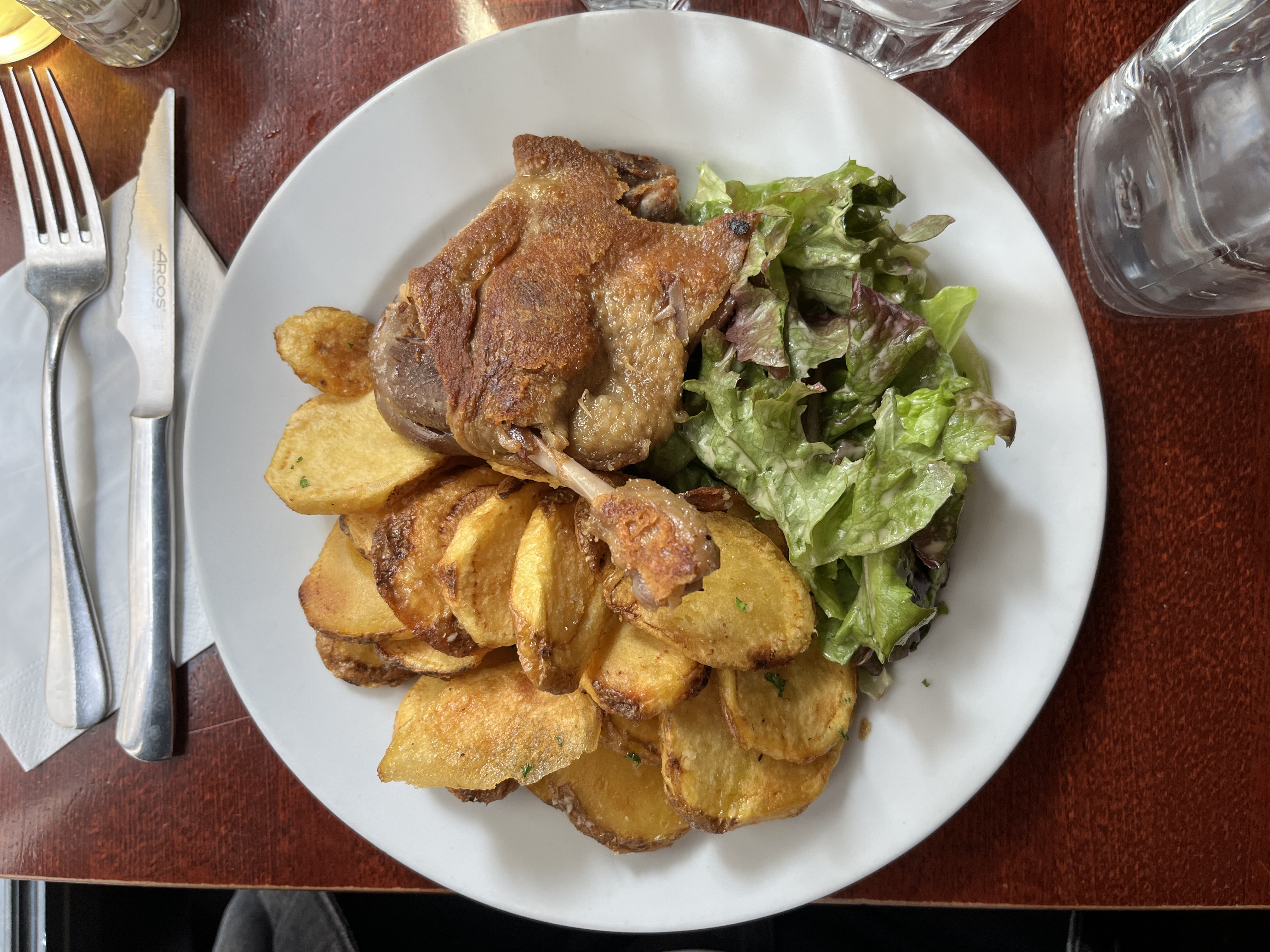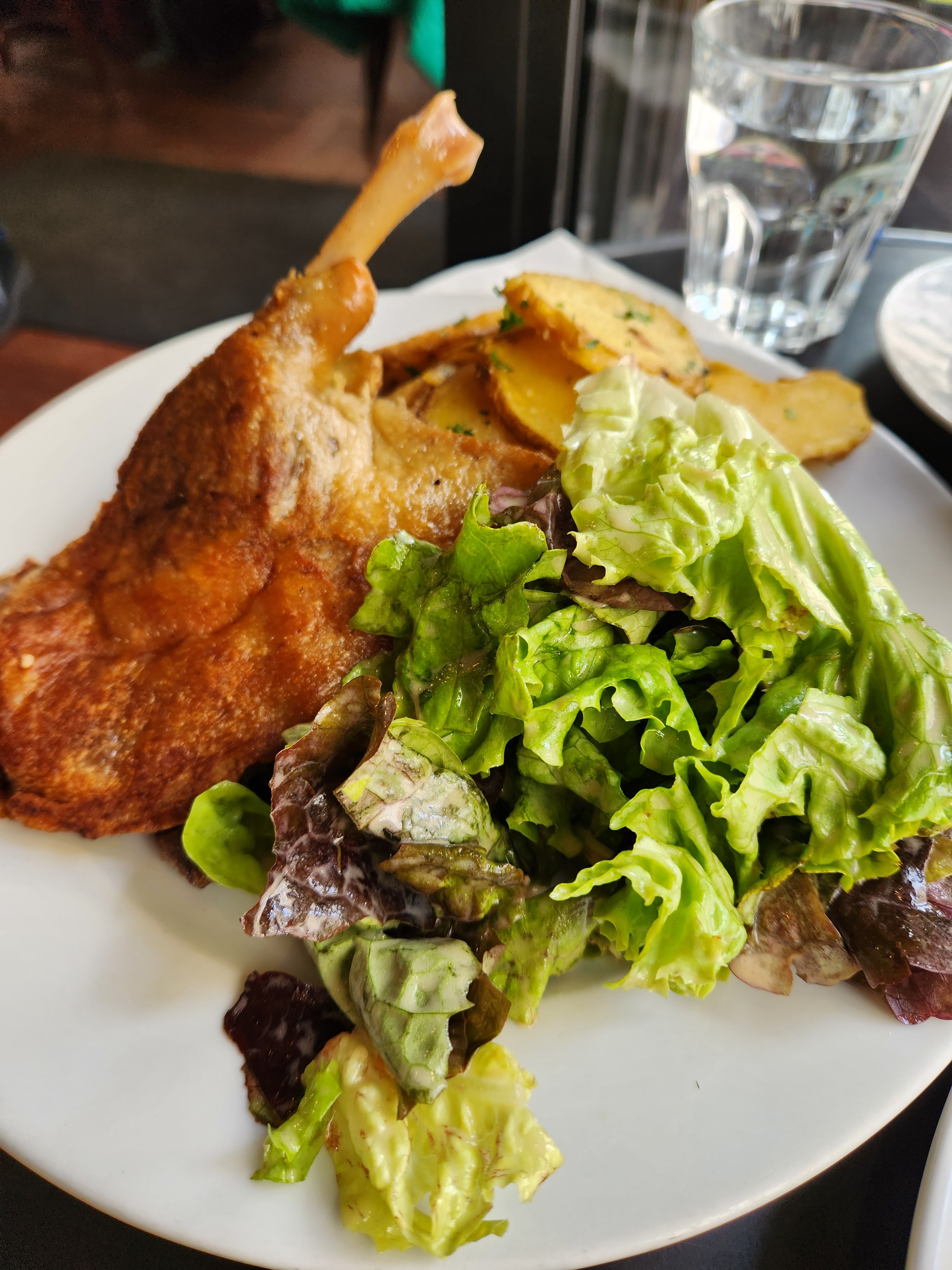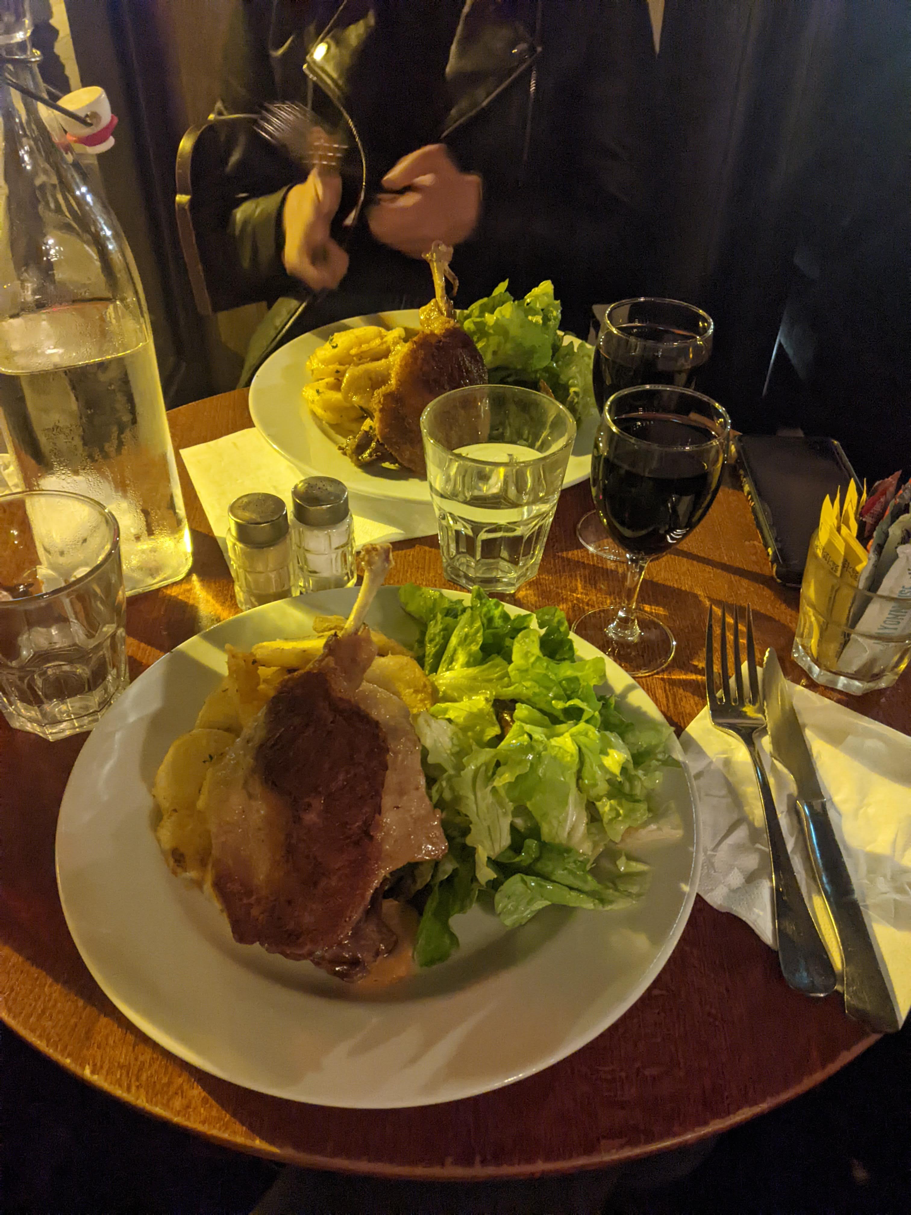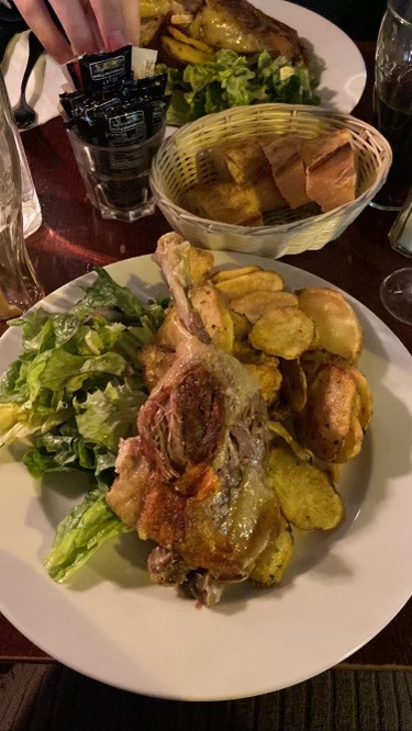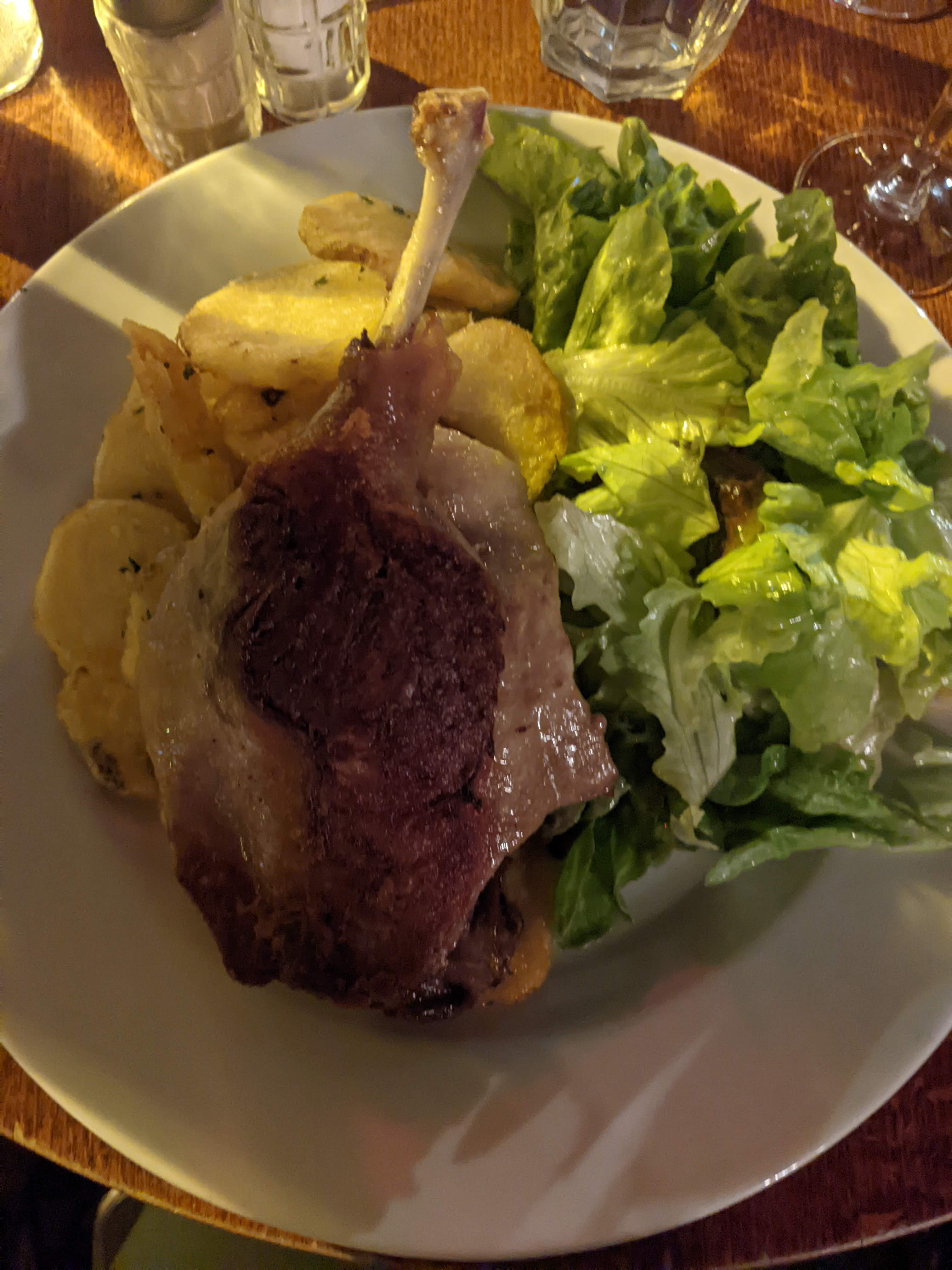 J'ai essayé le canard confit, il était croustillant mais un peu trop salé pour moi. La salade verte était pleine d’esprit/commençait à dorer donc je ne l’ai pas finie. La grande taille des portions et le service étaient bons. Abordable surtout compte tenu de la région.
