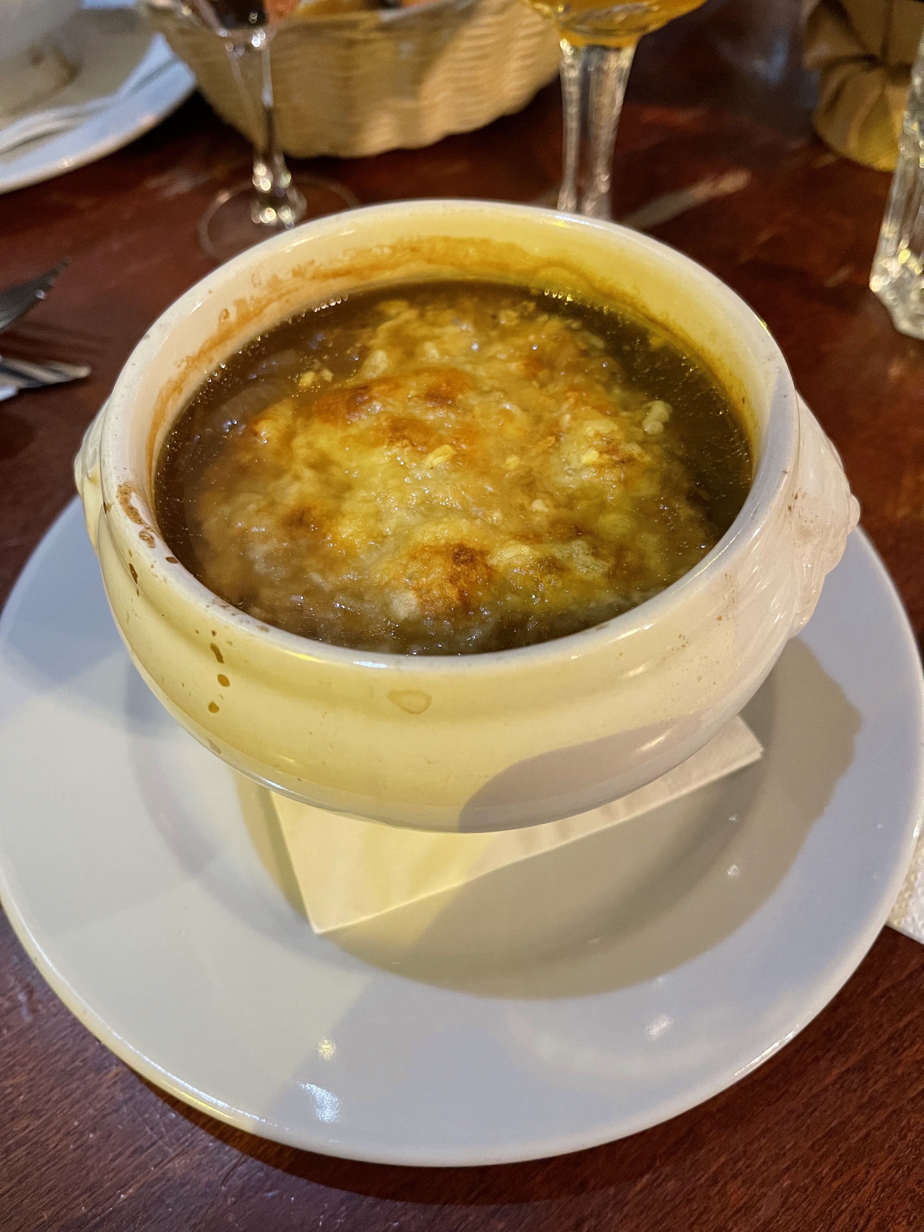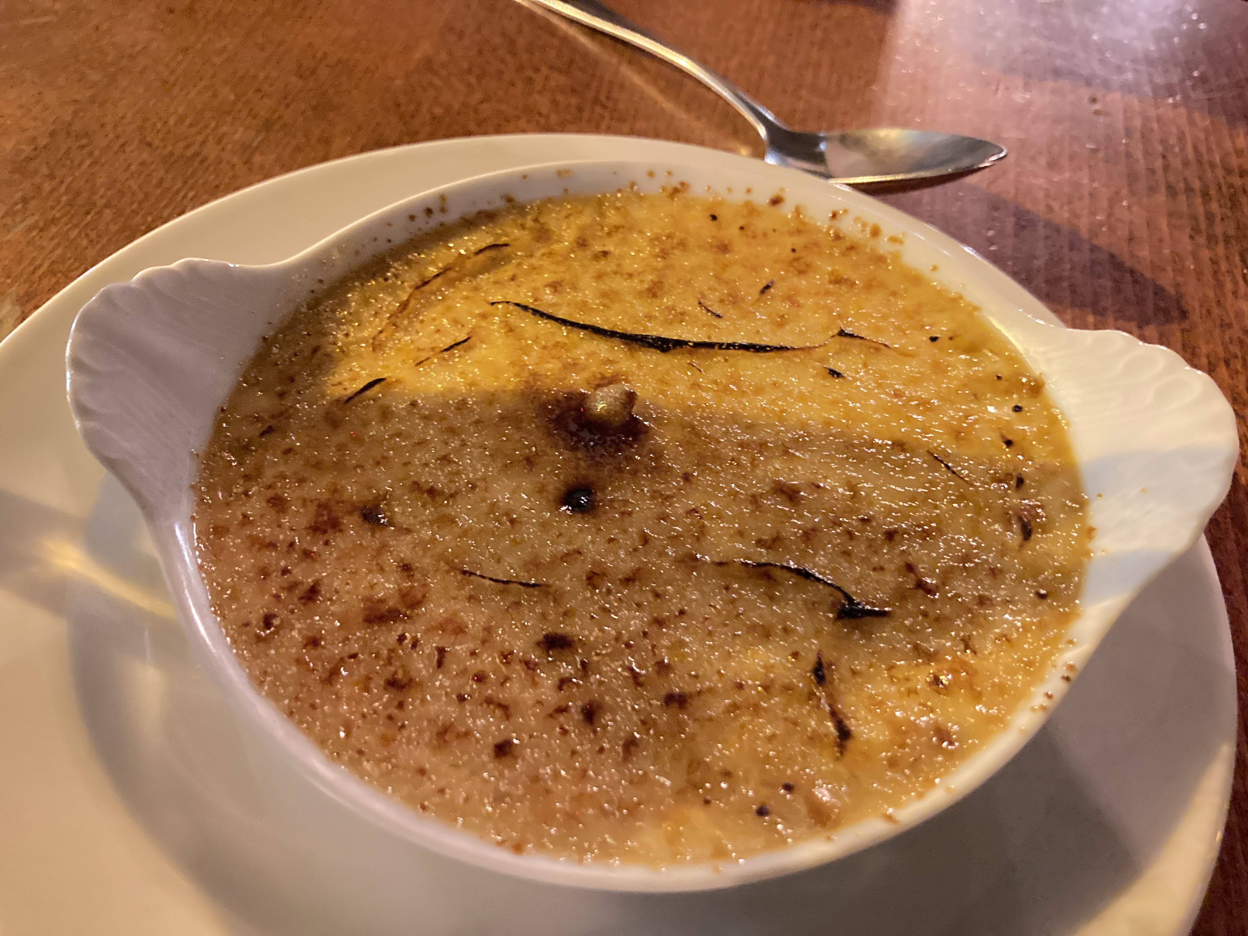 Je suis allé déjeuner dans ce restaurant aujourd'hui. Je voulais commander une soupe à l'oignon française, mais le serveur m'a dit qu'elle n'était pas disponible, ce qui était un peu décevant. Le prix est raisonnable et la nourriture et les boissons sont juste de niveau moyen. il n'y a pas de surprises. J'ai commandé une crème brûlée en dessert, mais le dessert n'était pas chaud.